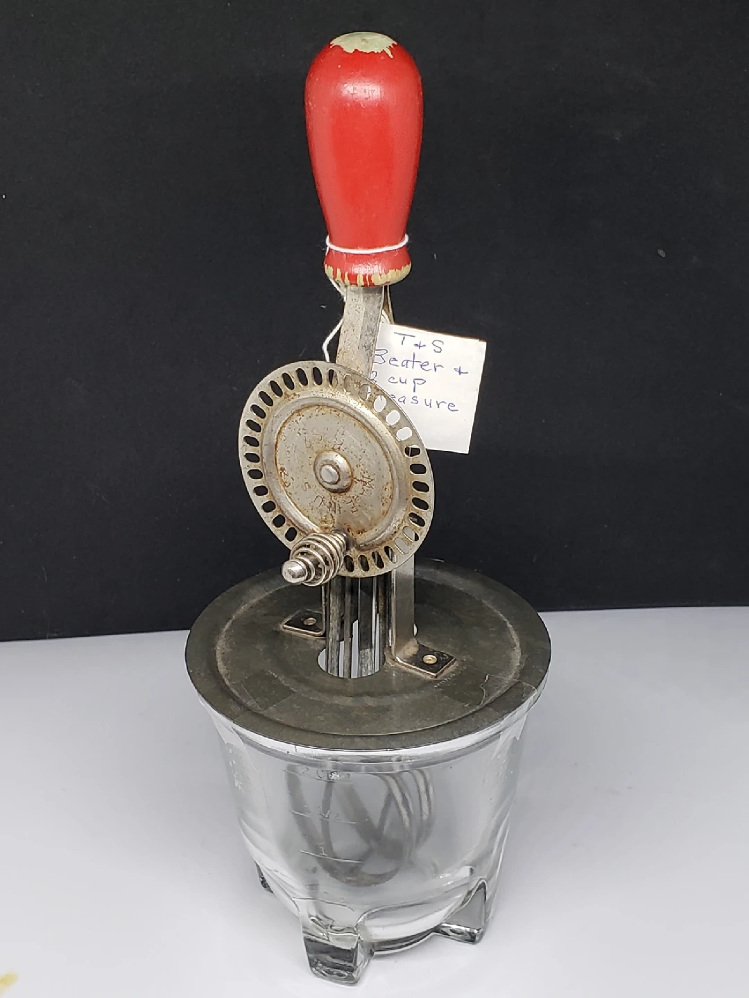 71Selling a vintage T+S beater with a 2 cup measure! It has a red wooden handle and a glass cup with feet. A unique addition to any kitchen!