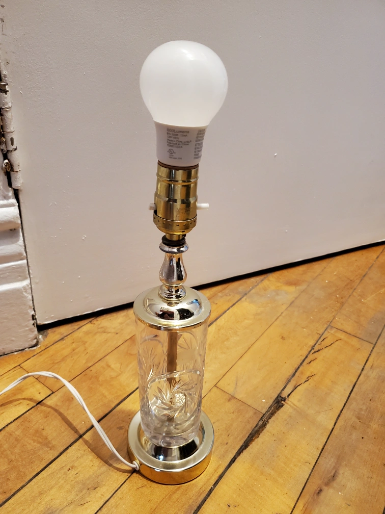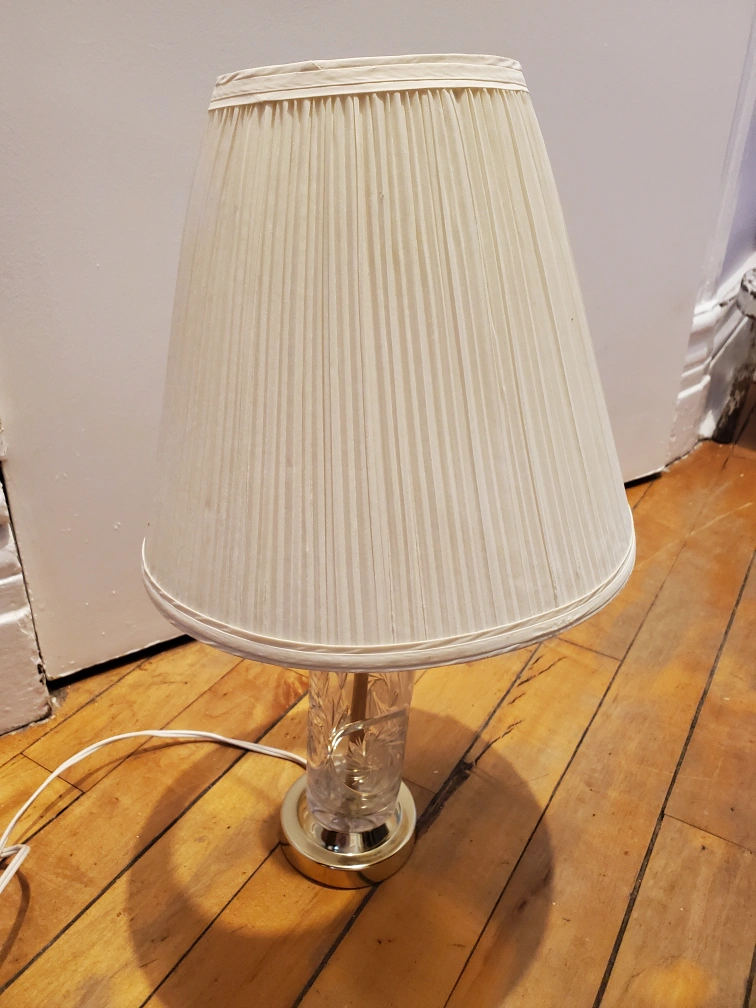 Beautiful table lamp. Features a clear glass base with intricate designs. Metallic gold accents. Comes with a lampshade. A great way to add ambiance to your home. cash only pick up