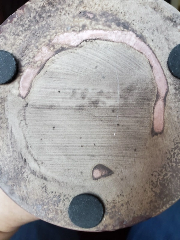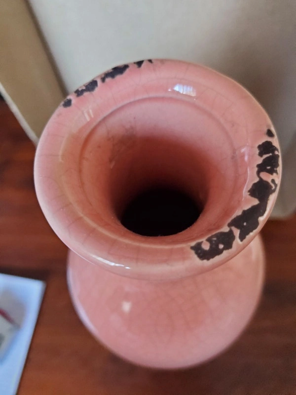 0Nice vintage tall pink bottle-shaped vase. It's 15.5" tall and the base is 4.5" in diameter. It's pink with a grey pattern. There is some crazing and the glaze is chipped around the top and on the bottom of the vase. $10.00, pick up only