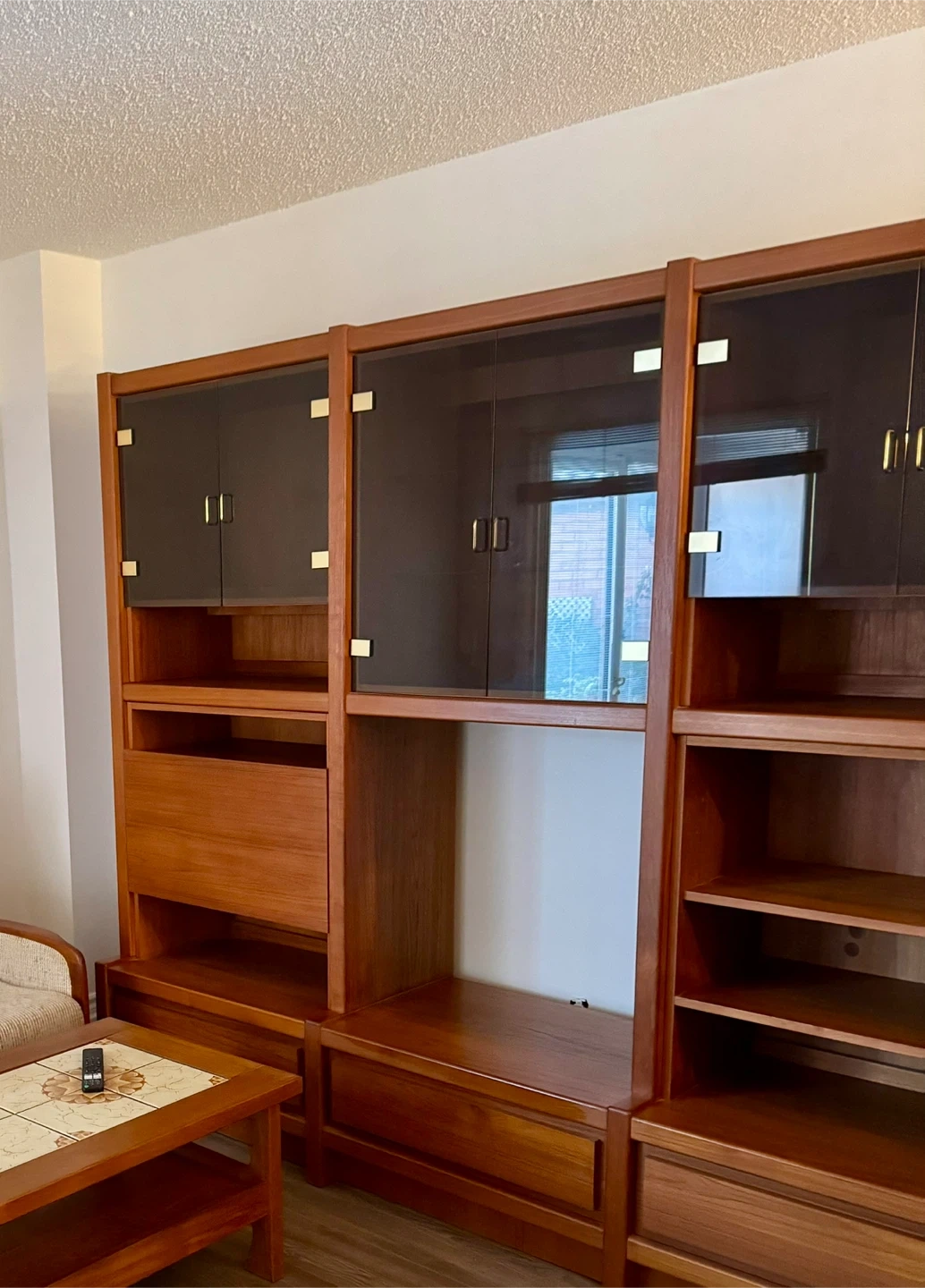 15Selling a beautiful vintage teak wall unit and matching coffee table! This set would be a stunning addition to any living room. The wall unit features glass-front cabinets and plenty of shelving for storage and display.