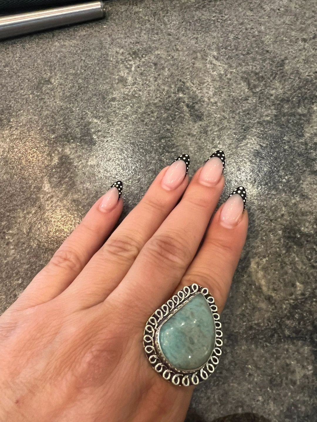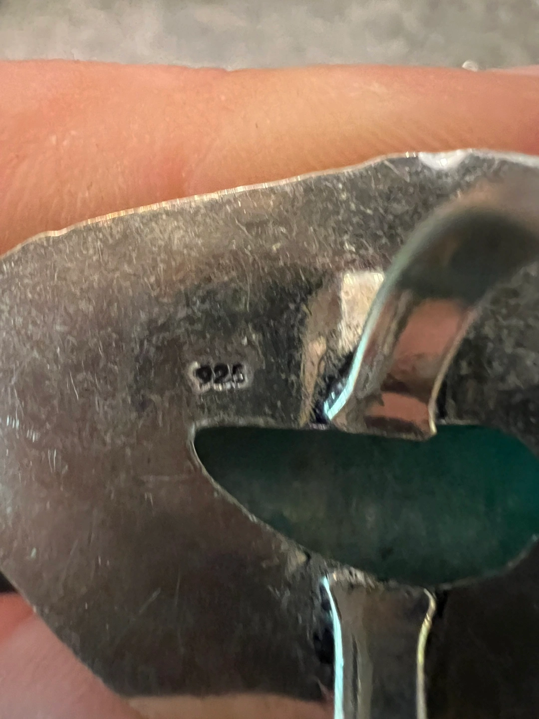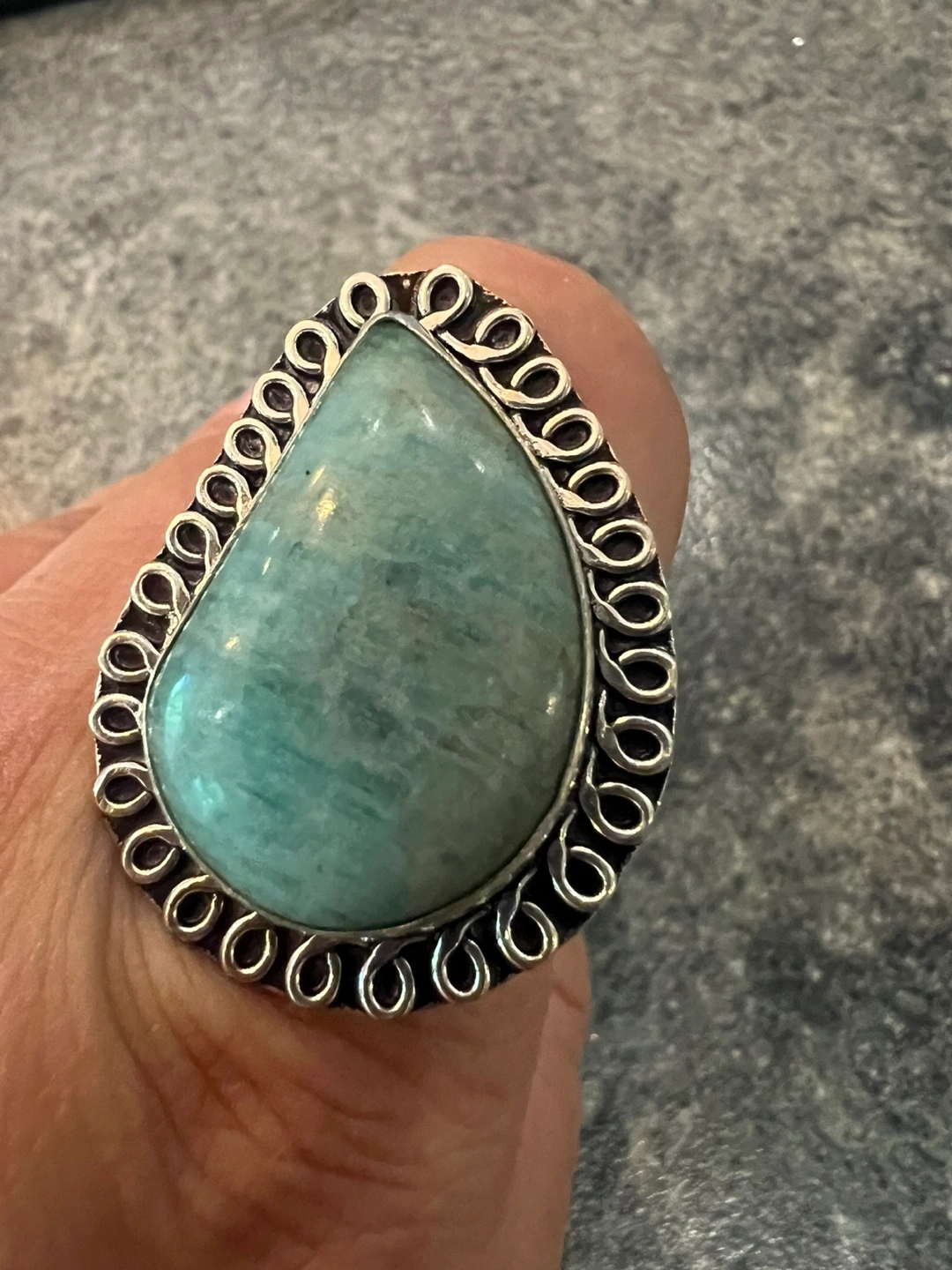 26Beautiful teardrop shaped amazonite ring set in sterling silver. It has a lovely silver detailing around the stone. It is a heavy and substantial statement ring. It is stamped 925 and weighs 10.6 grams. It is approximately a size 8.5. This is a stunning vintage piece in great condition.