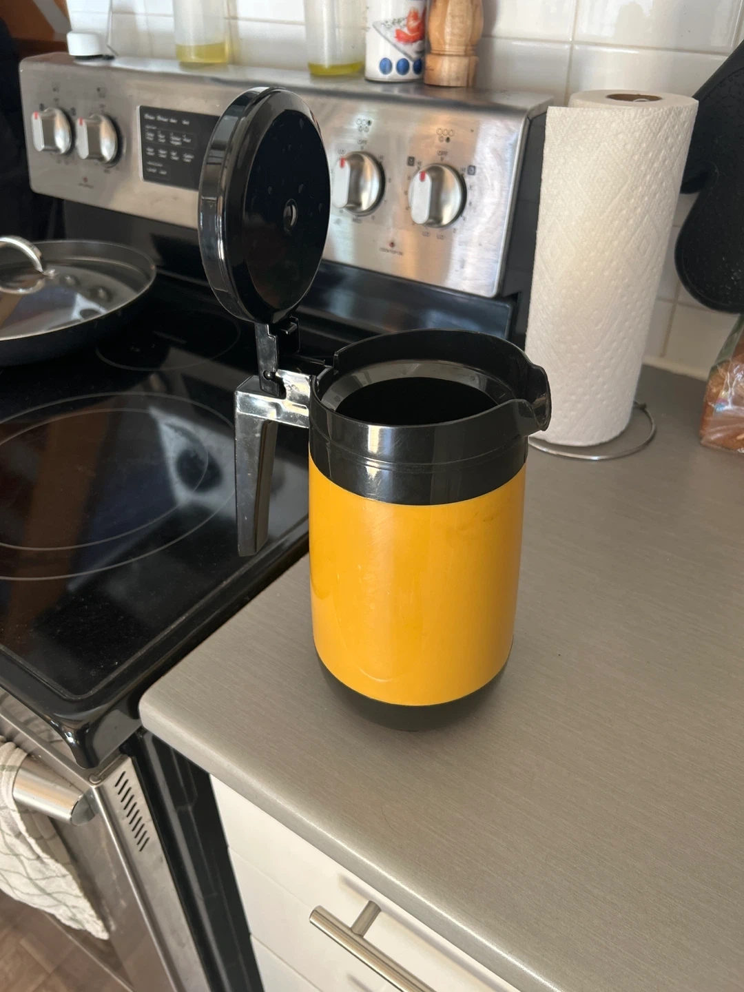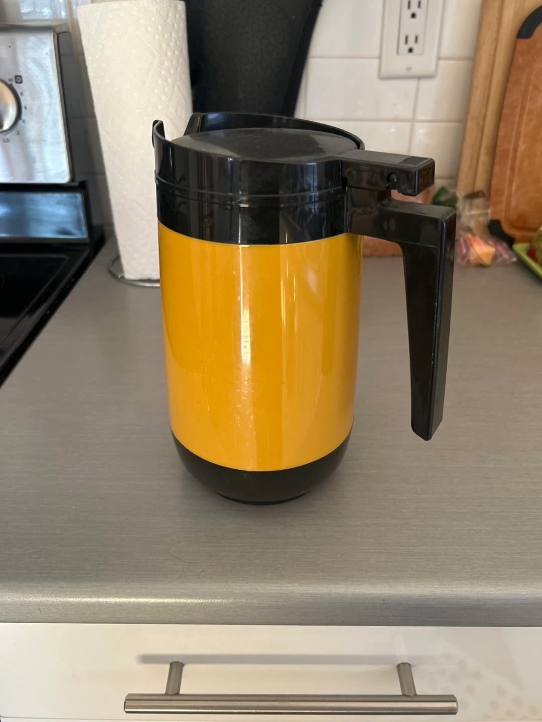 71Selling a vintage thermal carafe. It's yellow with black accents and in great condition! Perfect for keeping your beverages hot or cold. Great for coffee or tea!