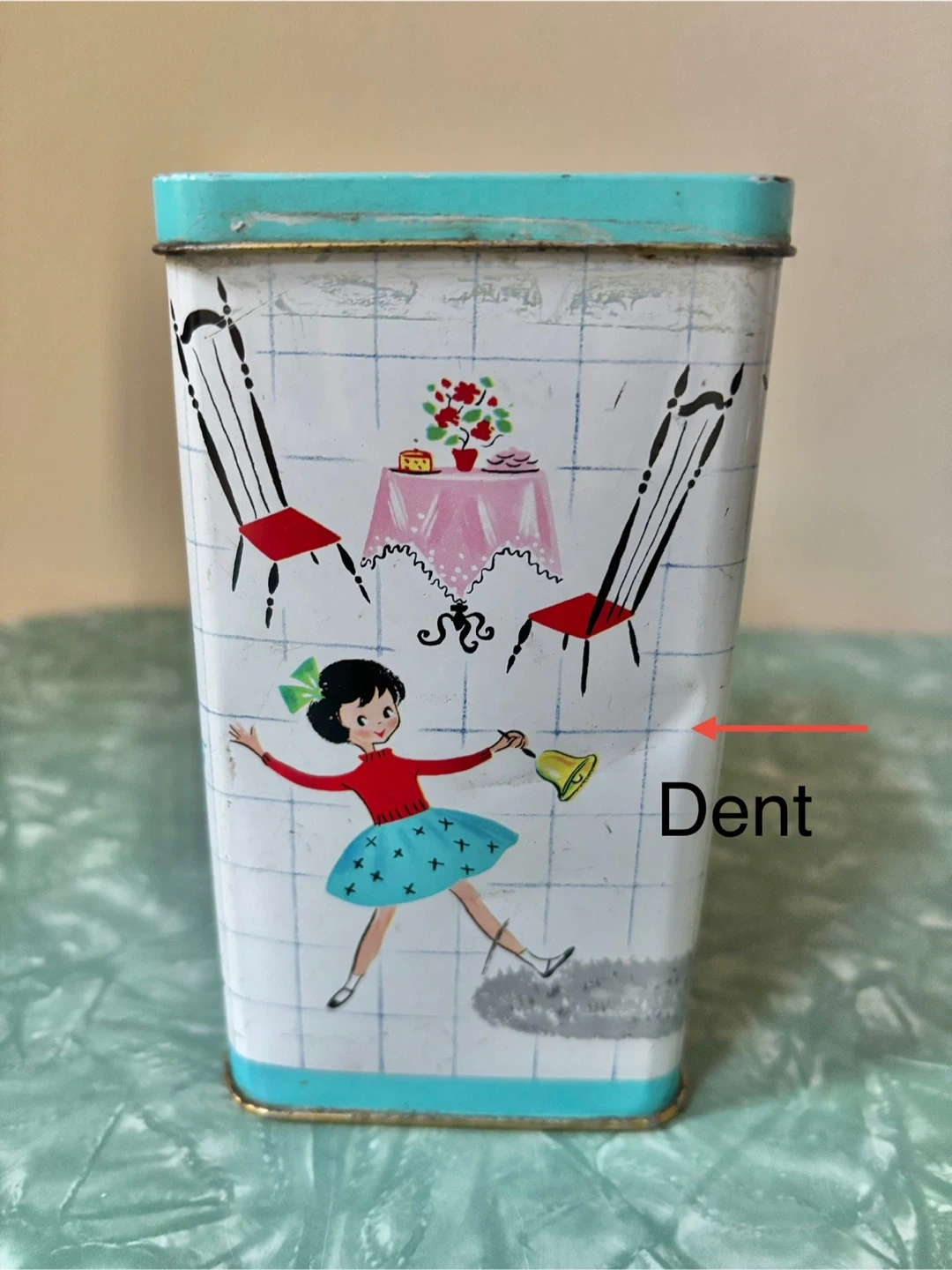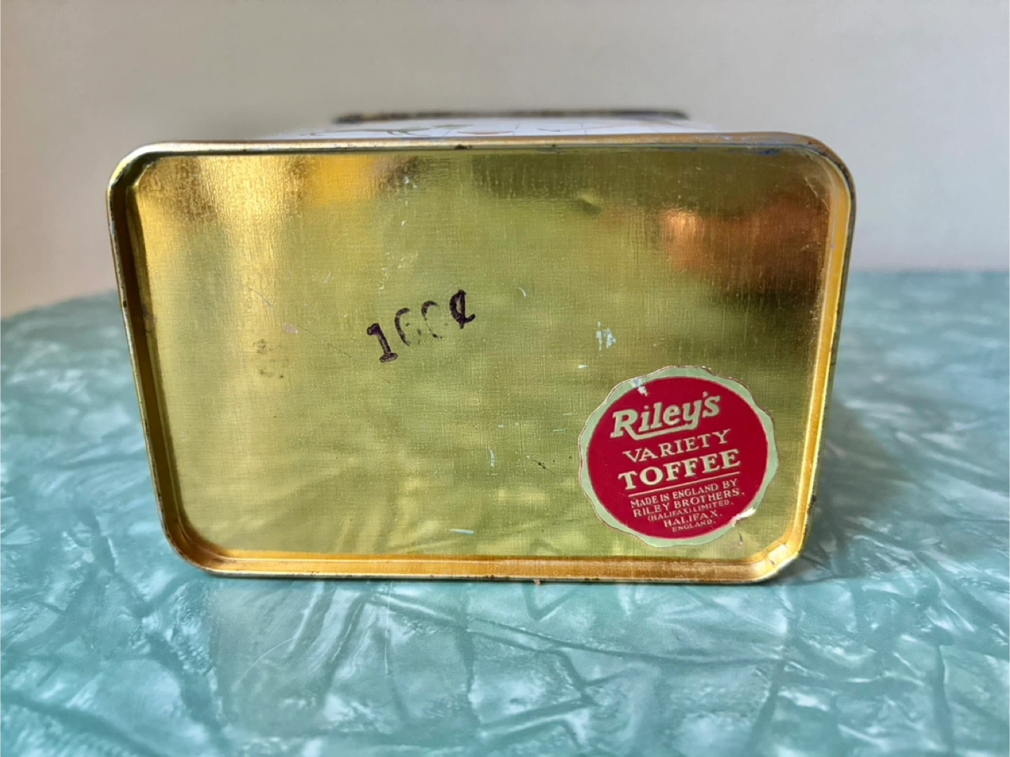 60Selling a vintage tin container with retro designs. Brand is Riley’s Toffee. Some scratches and a small dent, but overall good vintage condition.