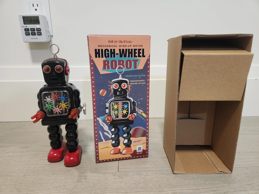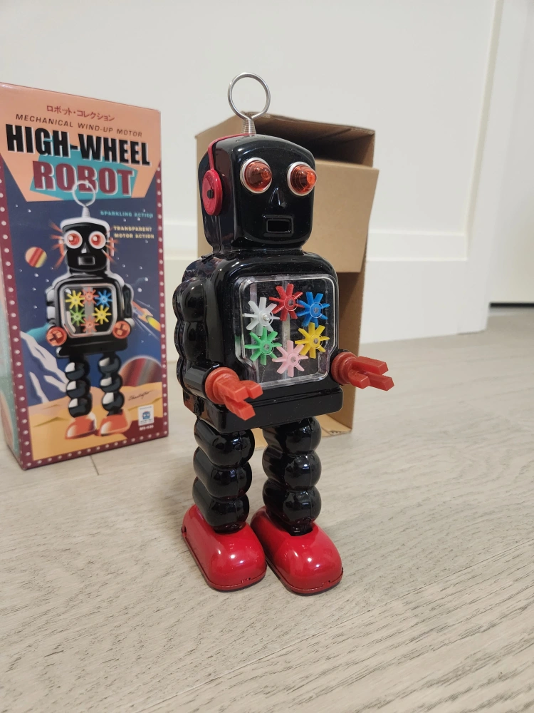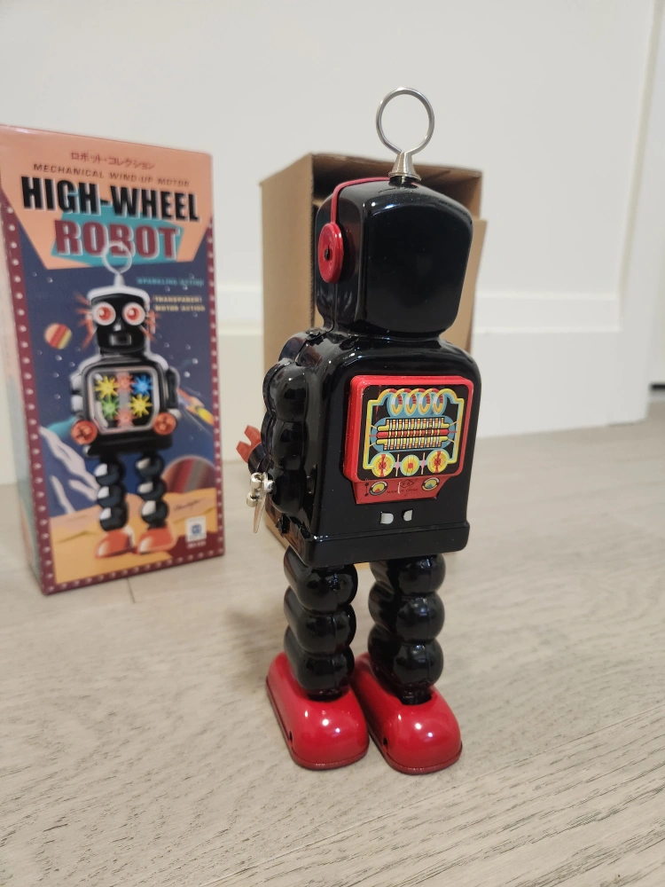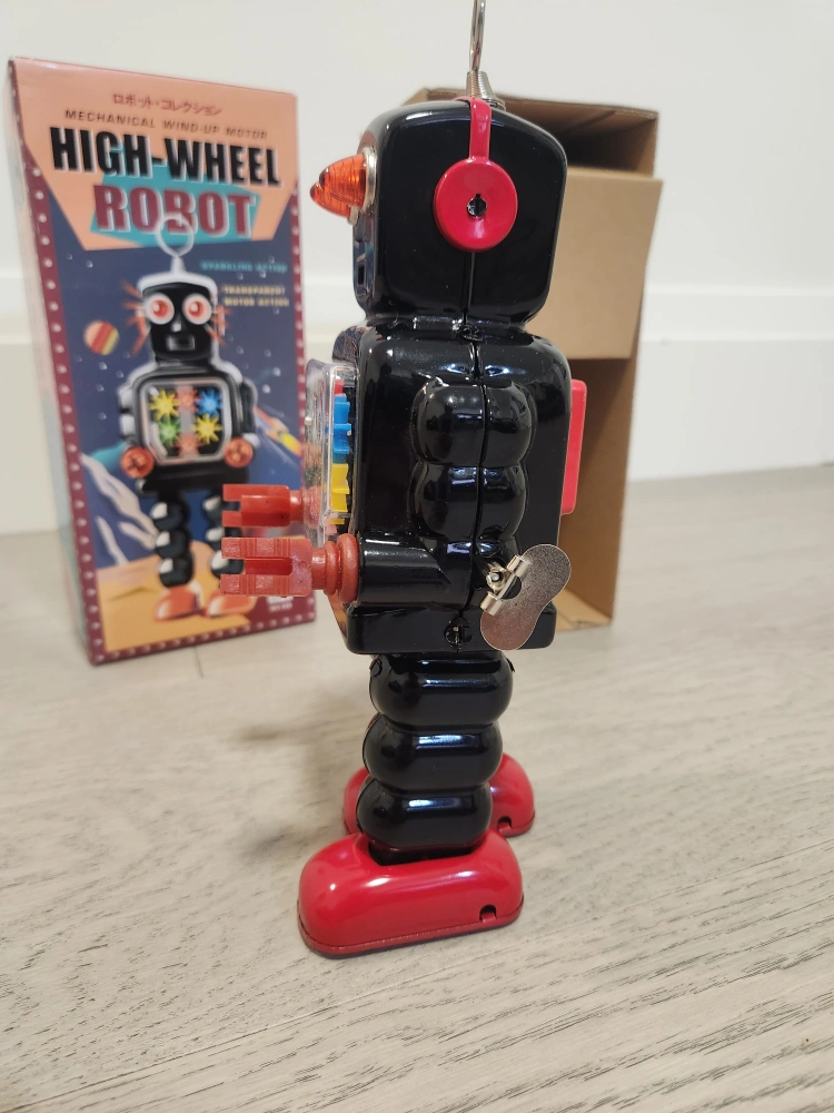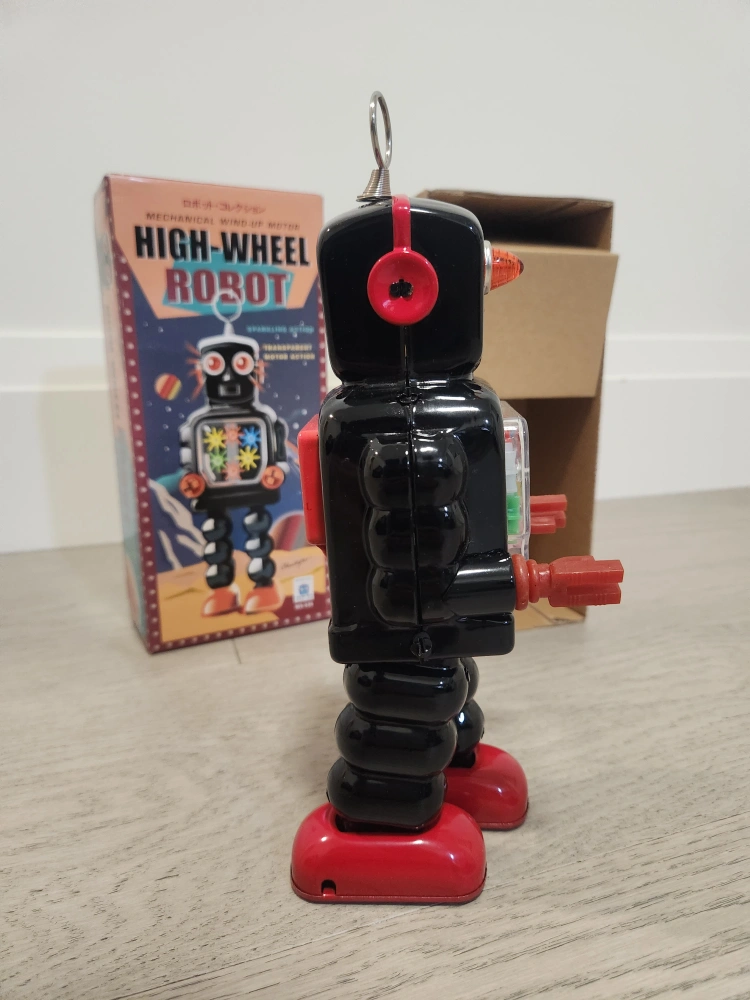 Collectible tin robot. Mechanical wind-up motor. Features sparkling action and transparent motor. Red accents. Comes in original box.