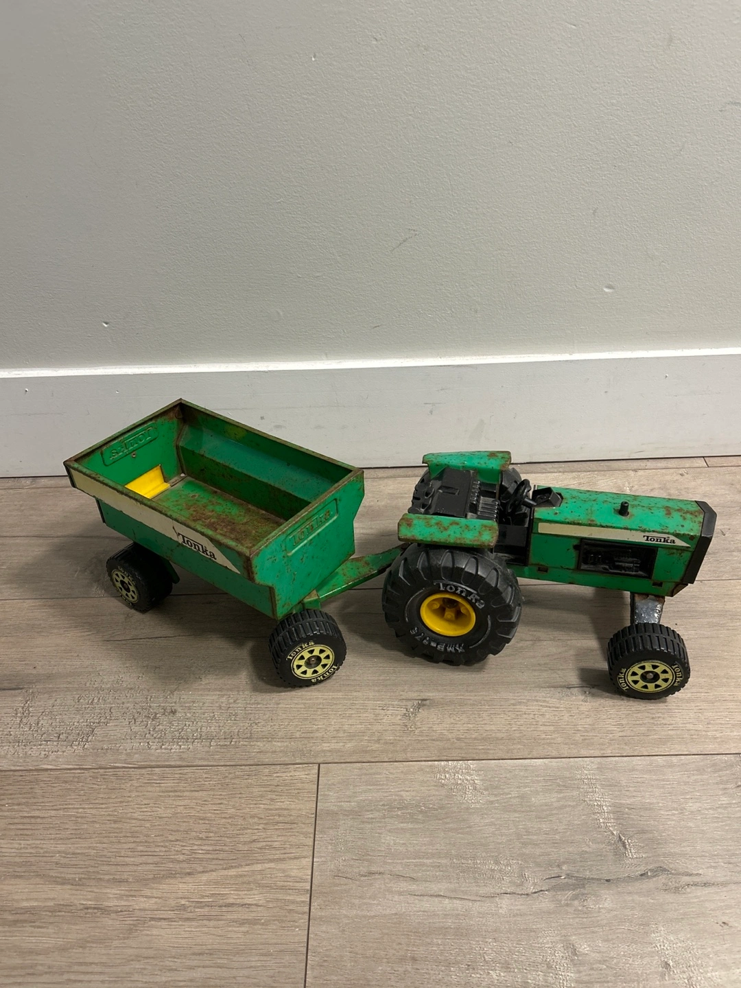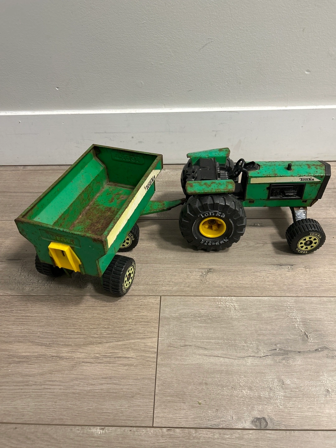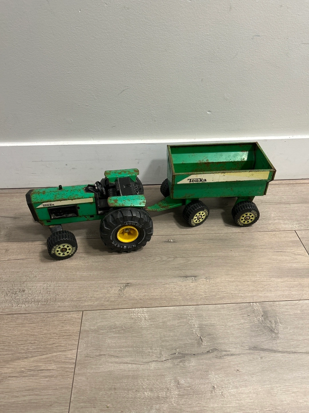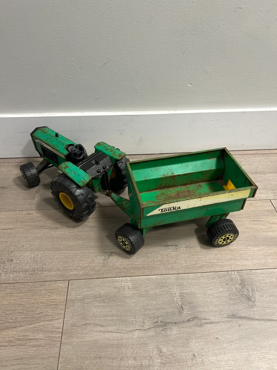 17Selling a vintage Tonka tractor with a trailer. It's green and shows signs of wear, which adds to its nostalgic charm. Perfect for collectors or anyone who loves classic toys!