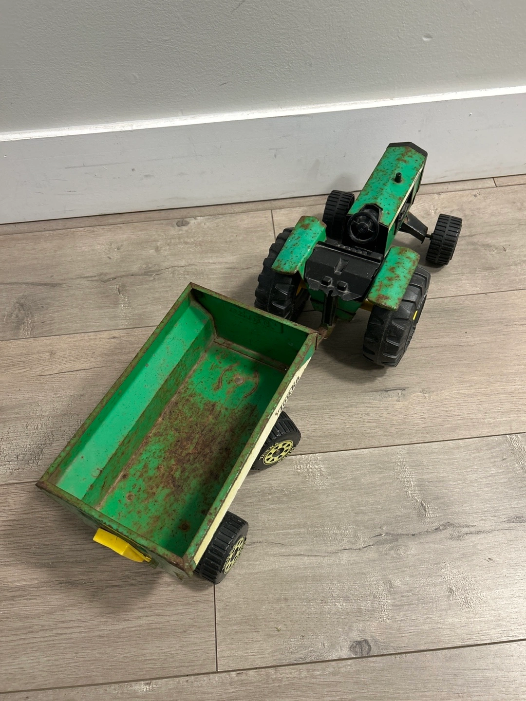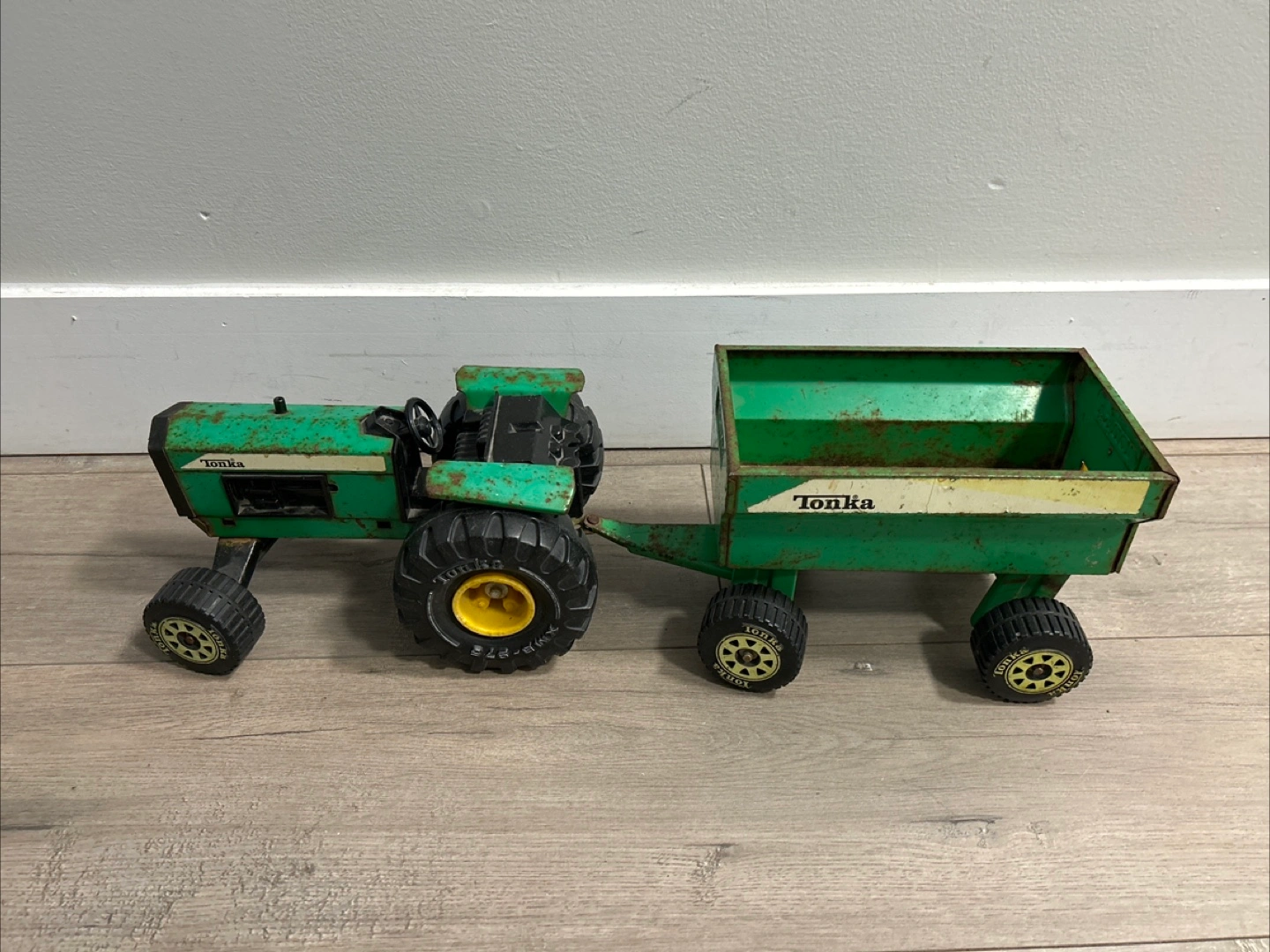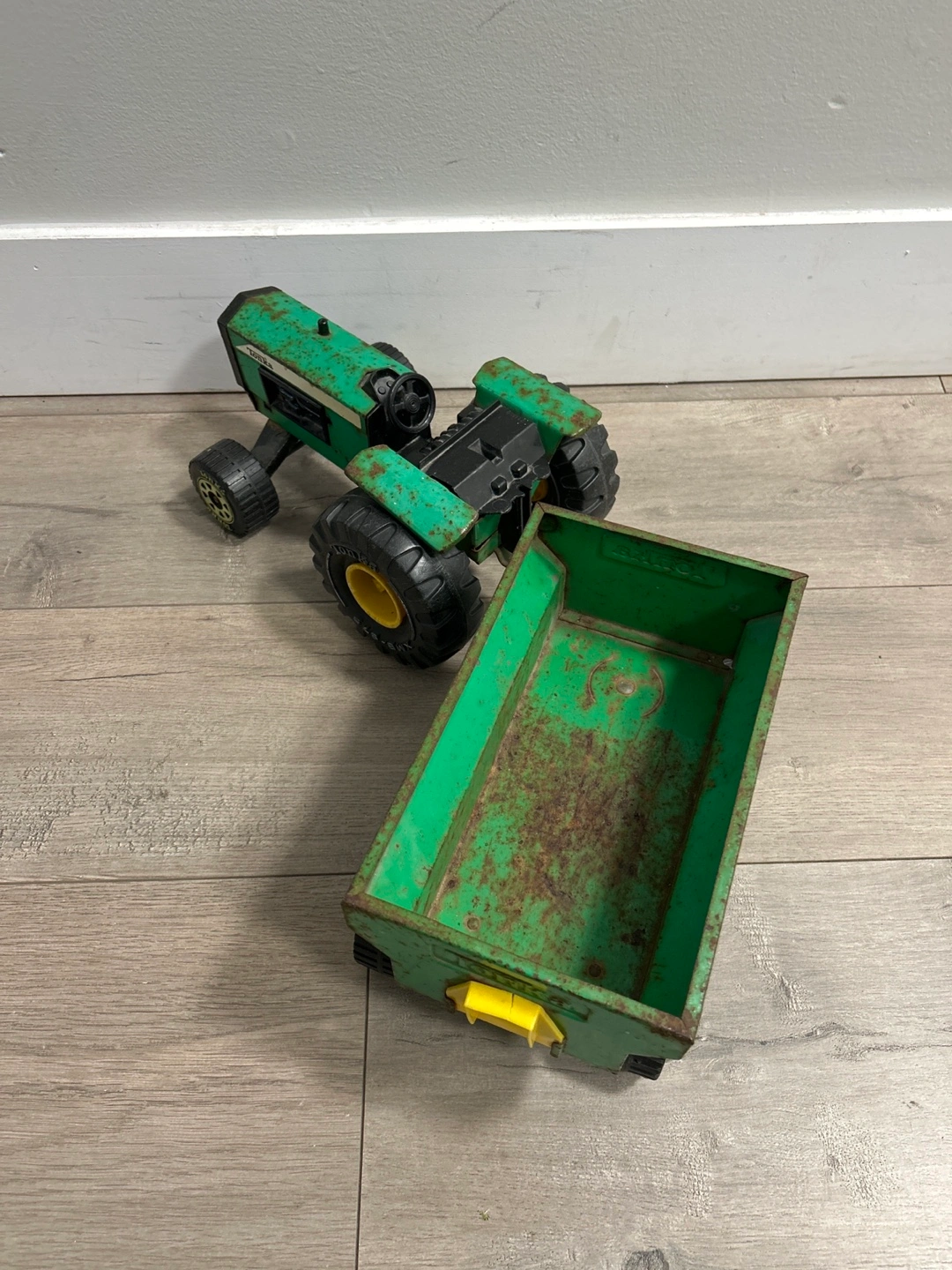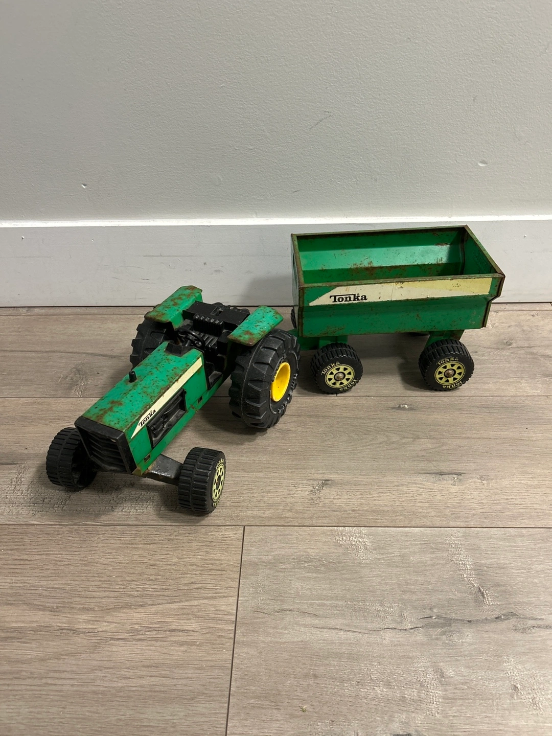 17Selling a vintage Tonka tractor with a trailer. It's green and shows signs of wear, which adds to its nostalgic charm. Perfect for collectors or anyone who loves classic toys!