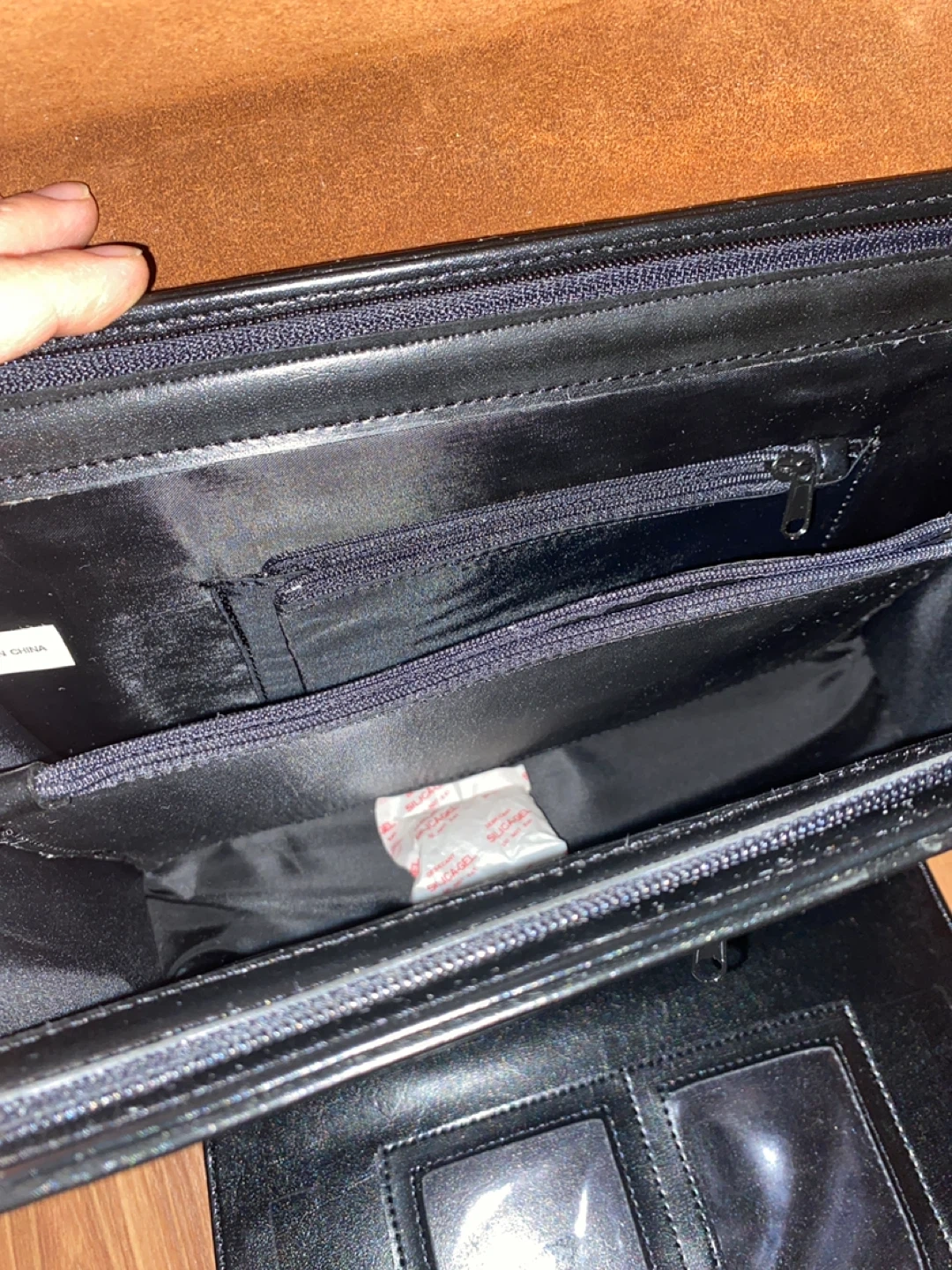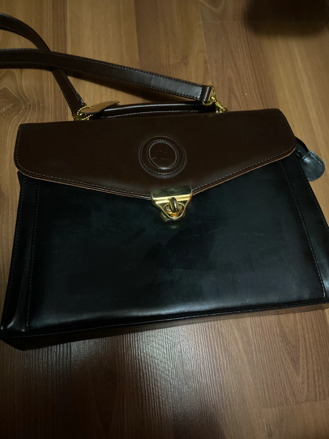 10Selling a vintage handbag in a two-tone colour scheme, featuring a dark brown top and a black bottom. It has a gold-tone clasp and a shoulder strap. The interior has multiple compartments for organization. It's in good condition for its age!