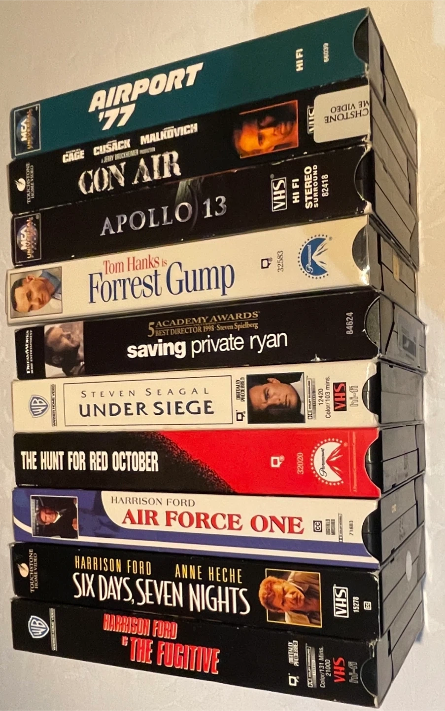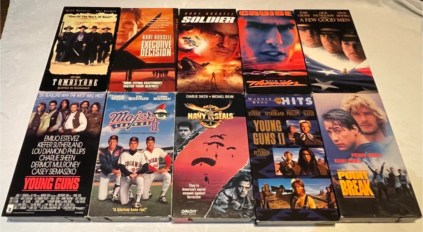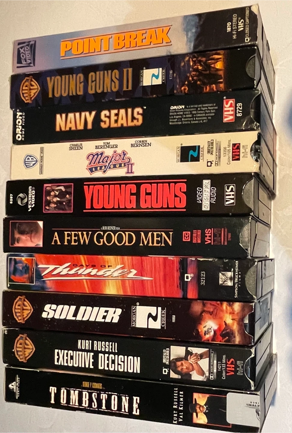 Selling a collection of VHS tapes! Includes titles like Tombstone, Executive Decision, Soldier, Days of Thunder, A Few Good Men, Young Guns, Major League II, Navy Seals, Young Guns II, Point Break, The Fugitive, Six Days Seven Nights, The Hunt for Red October, Under Siege, Saving Private Ryan, Apollo 13, Con Air, and Airport '77