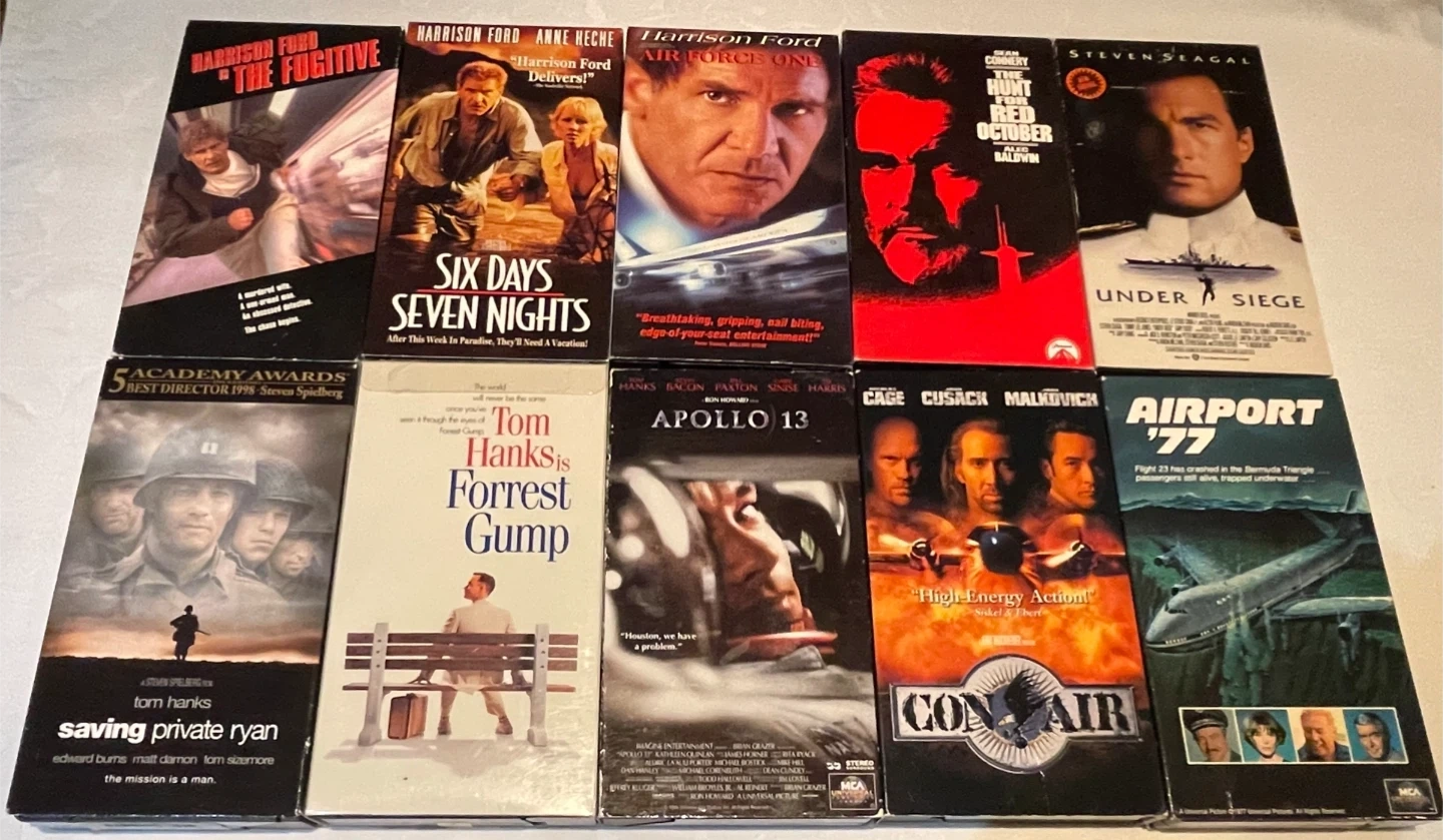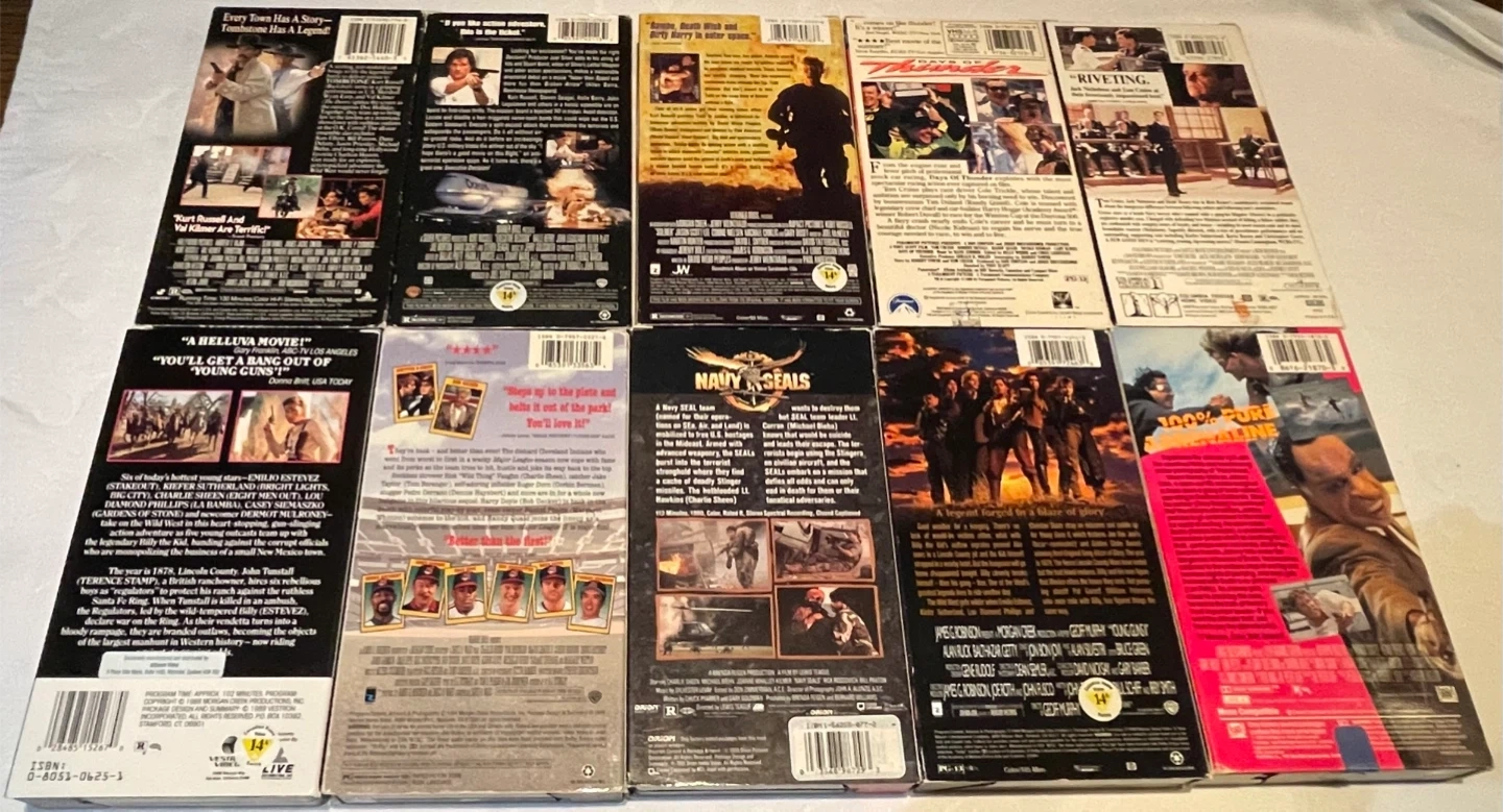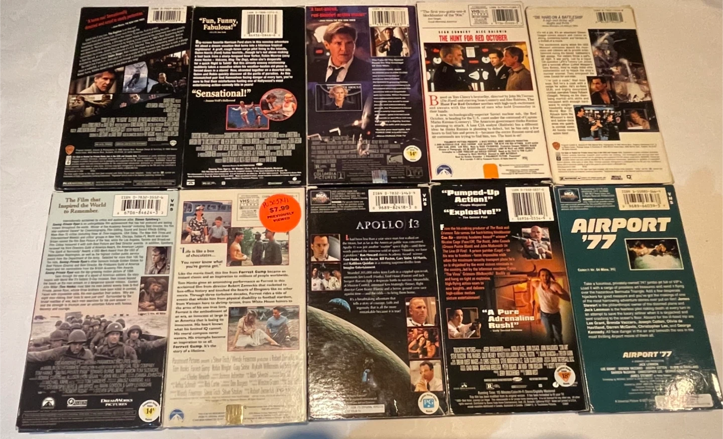 Selling a collection of VHS tapes! Includes titles like Tombstone, Executive Decision, Soldier, Days of Thunder, A Few Good Men, Young Guns, Major League II, Navy Seals, Young Guns II, Point Break, The Fugitive, Six Days Seven Nights, The Hunt for Red October, Under Siege, Saving Private Ryan, Apollo 13, Con Air, and Airport '77
