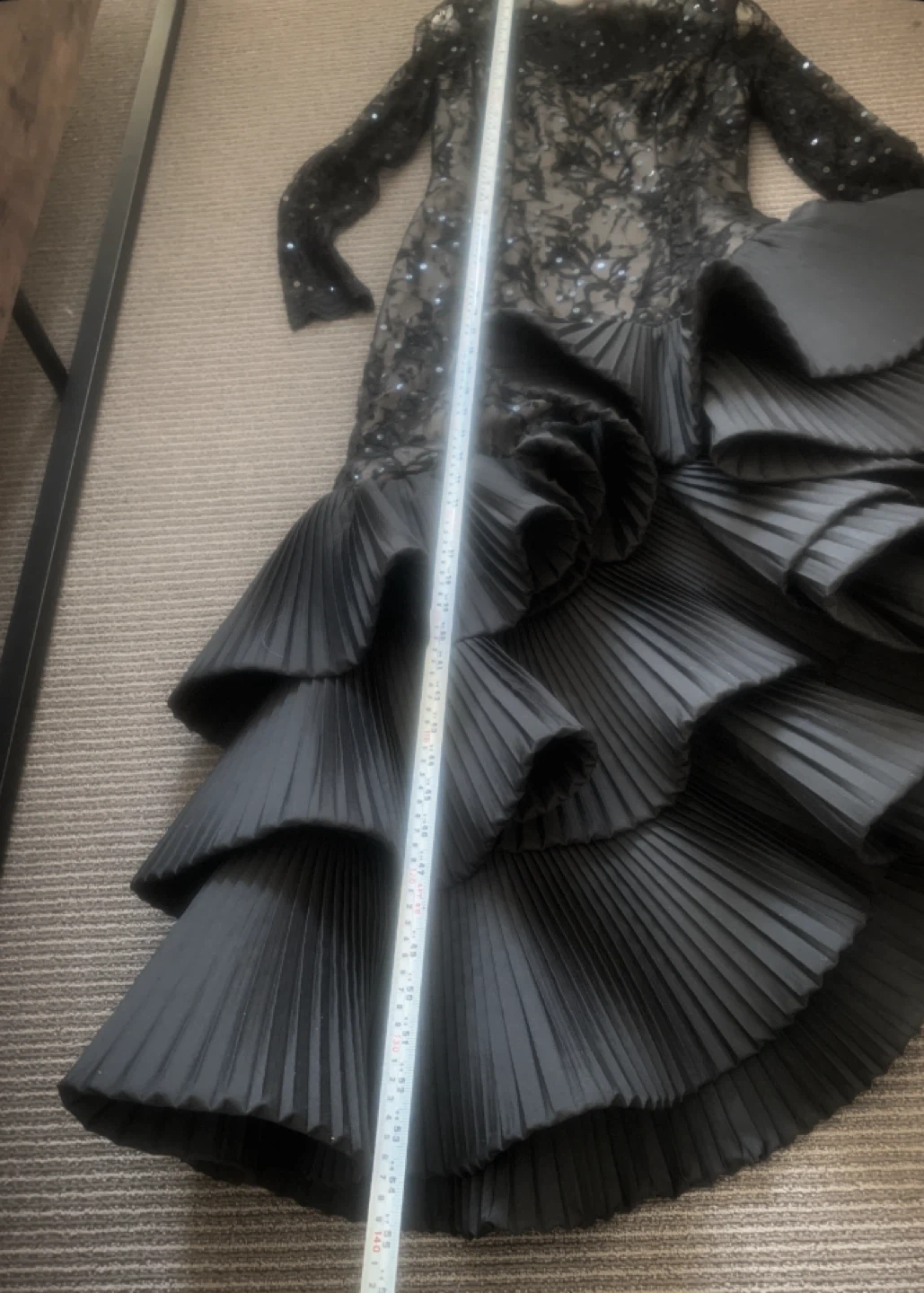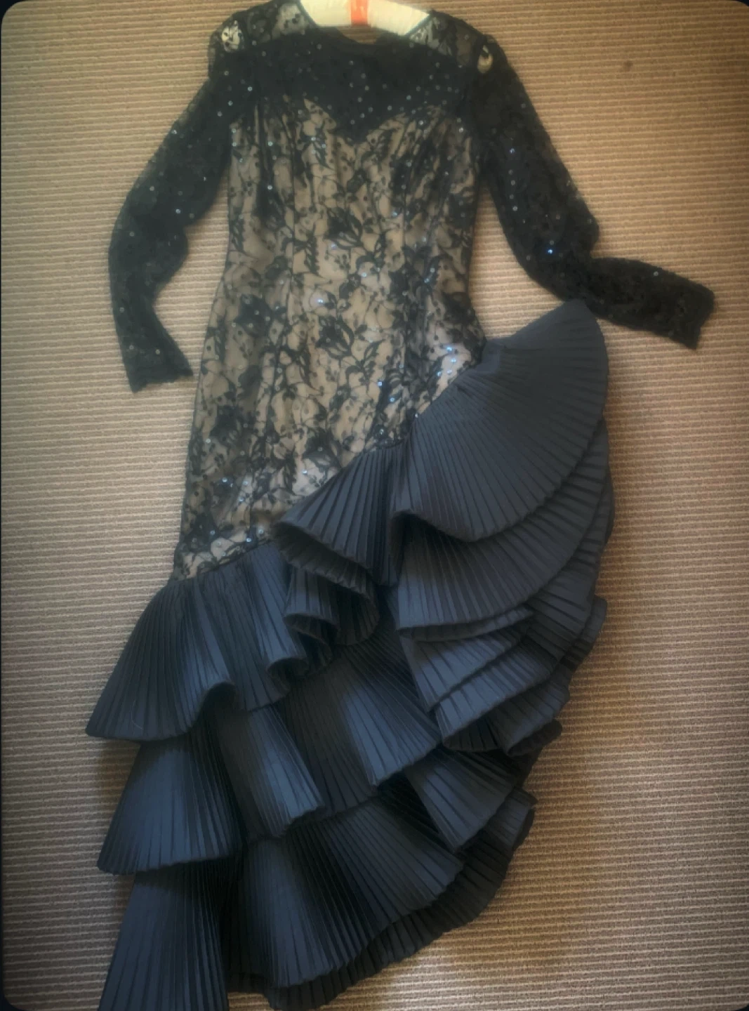 168Beautiful vintage Victor Costa black gown featuring lace detailing on the bodice and sleeves, complemented by a dramatic, tiered pleated ruffle skirt. It's a stylish piece that's sure to turn heads! Size 6. Pick up at Eglinton Ave east at Bayview.