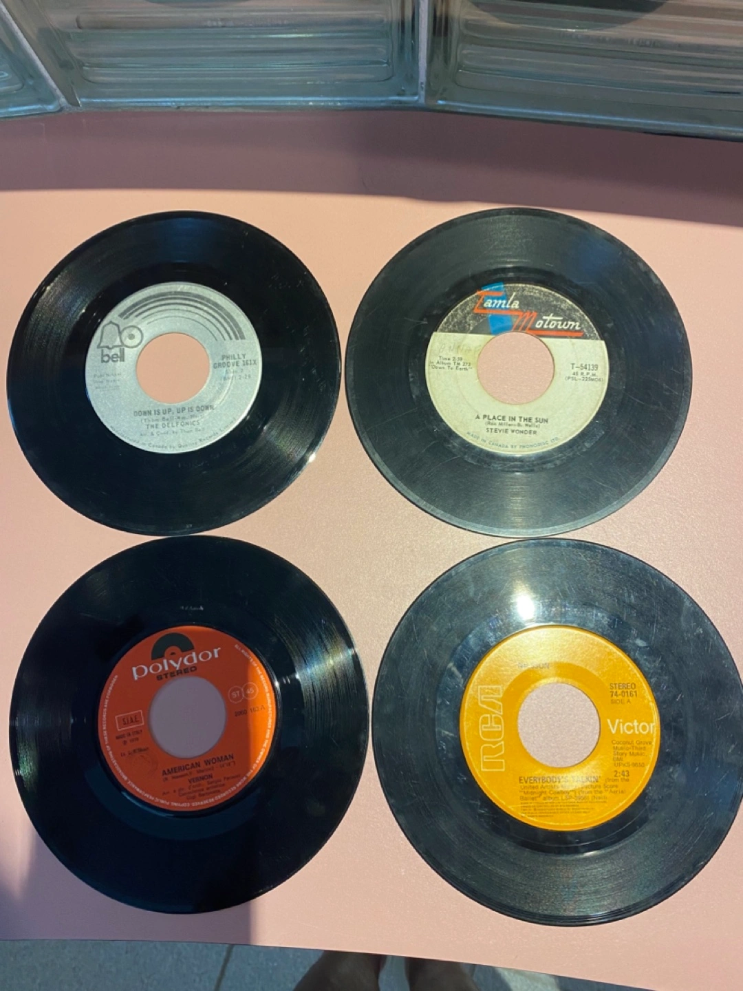 Several vinyl records on a pink surface. Vinyl records in black. Labels in various colours. A cozy listening experience can be had with this set of 4