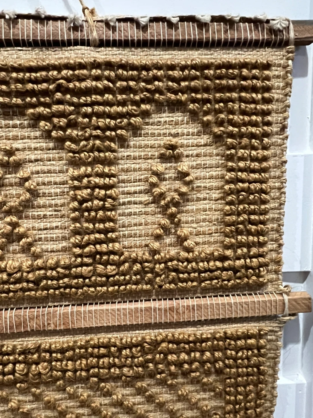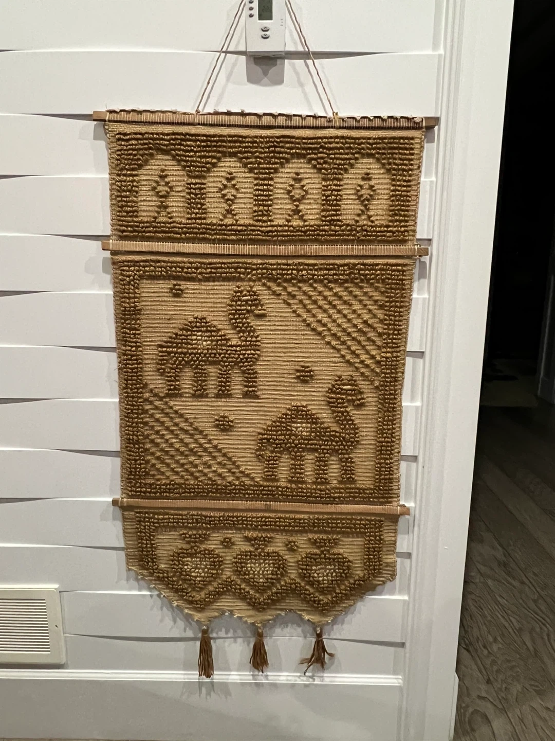 10This is a unique vintage wall hanging featuring a charming camel design. It's in great condition and would add a lovely touch to any room. The material is a textured, woven fibre in a warm, neutral tone. Perfect for adding a bit of retro flair to your home decor!