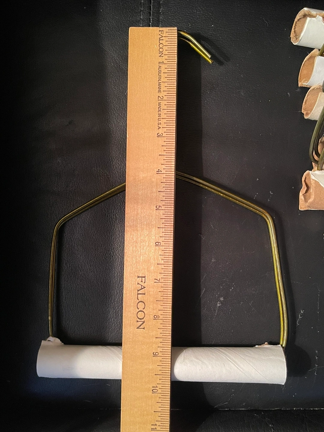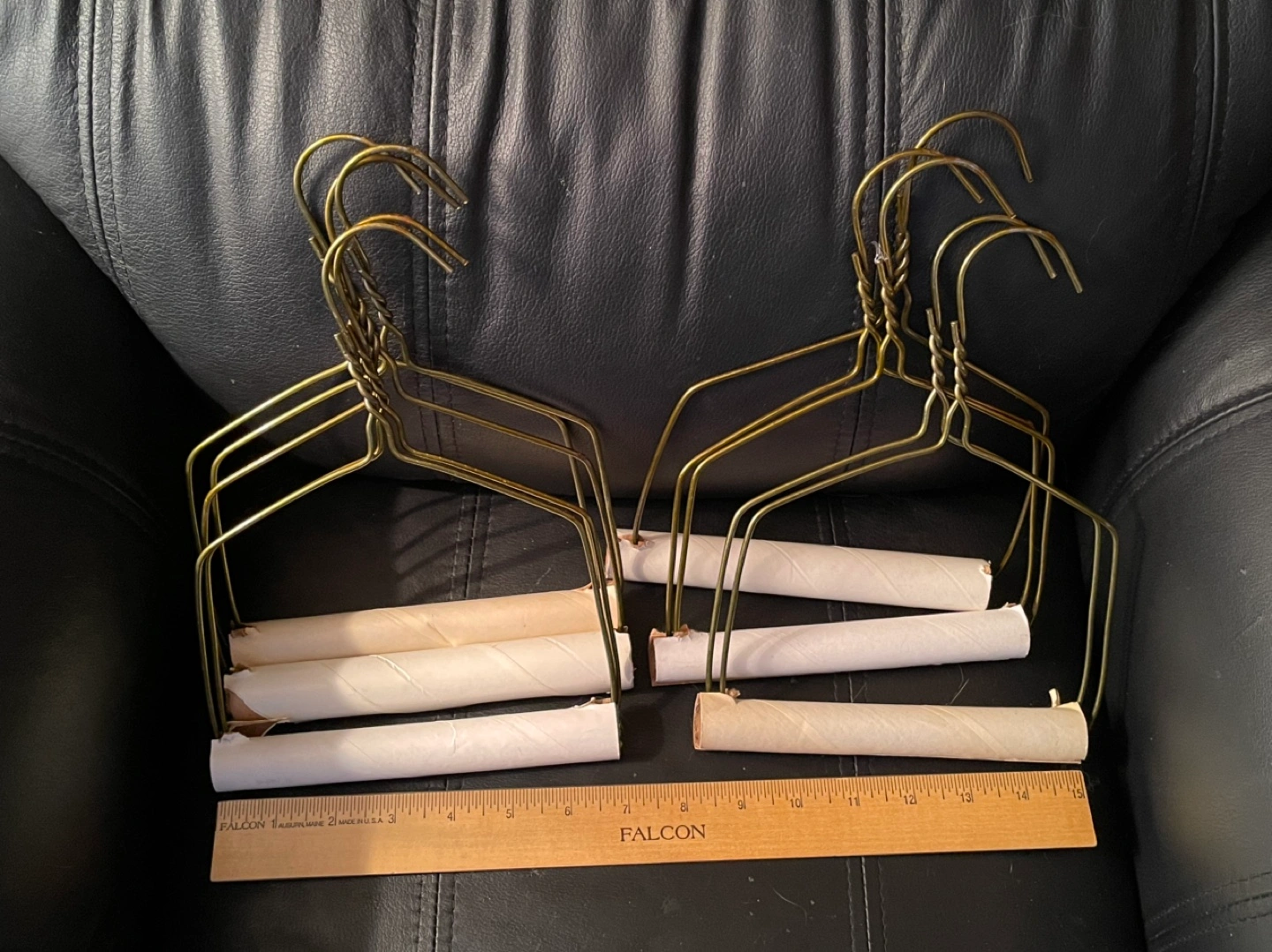 Ten vintage wire scarf hangers with six cardboard rollers. You can easily split up the hangers and add more rollers.