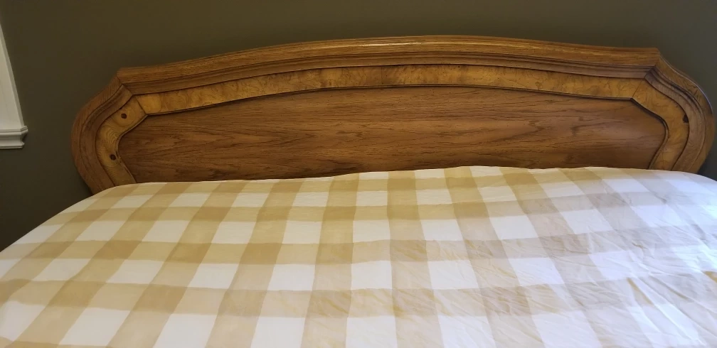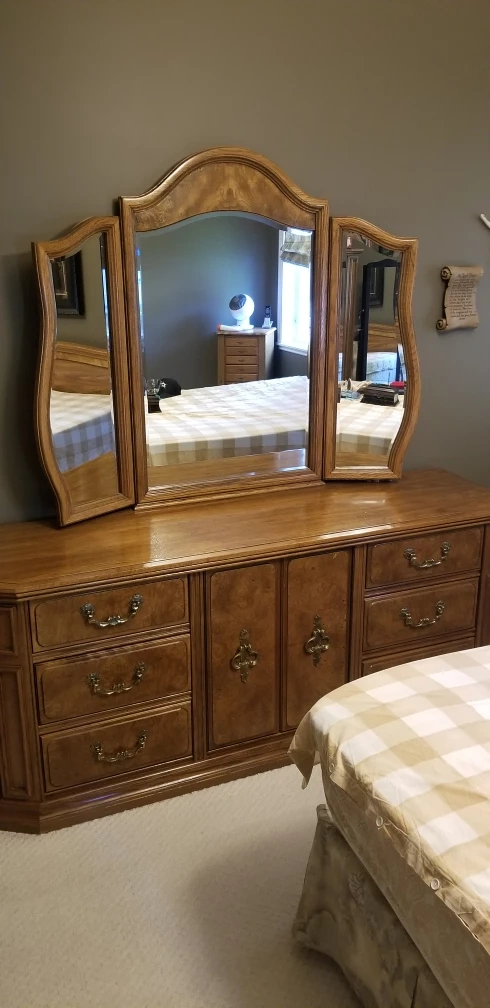 Selling a beautiful vintage solid wood bedroom set by Gerard Collins! Cedar wood interior. Includes a dresser with a large mirror, a headboard, and an armoire. The set has a lovely classic design and is in good condition for its age. It would be a great addition to any bedroom!