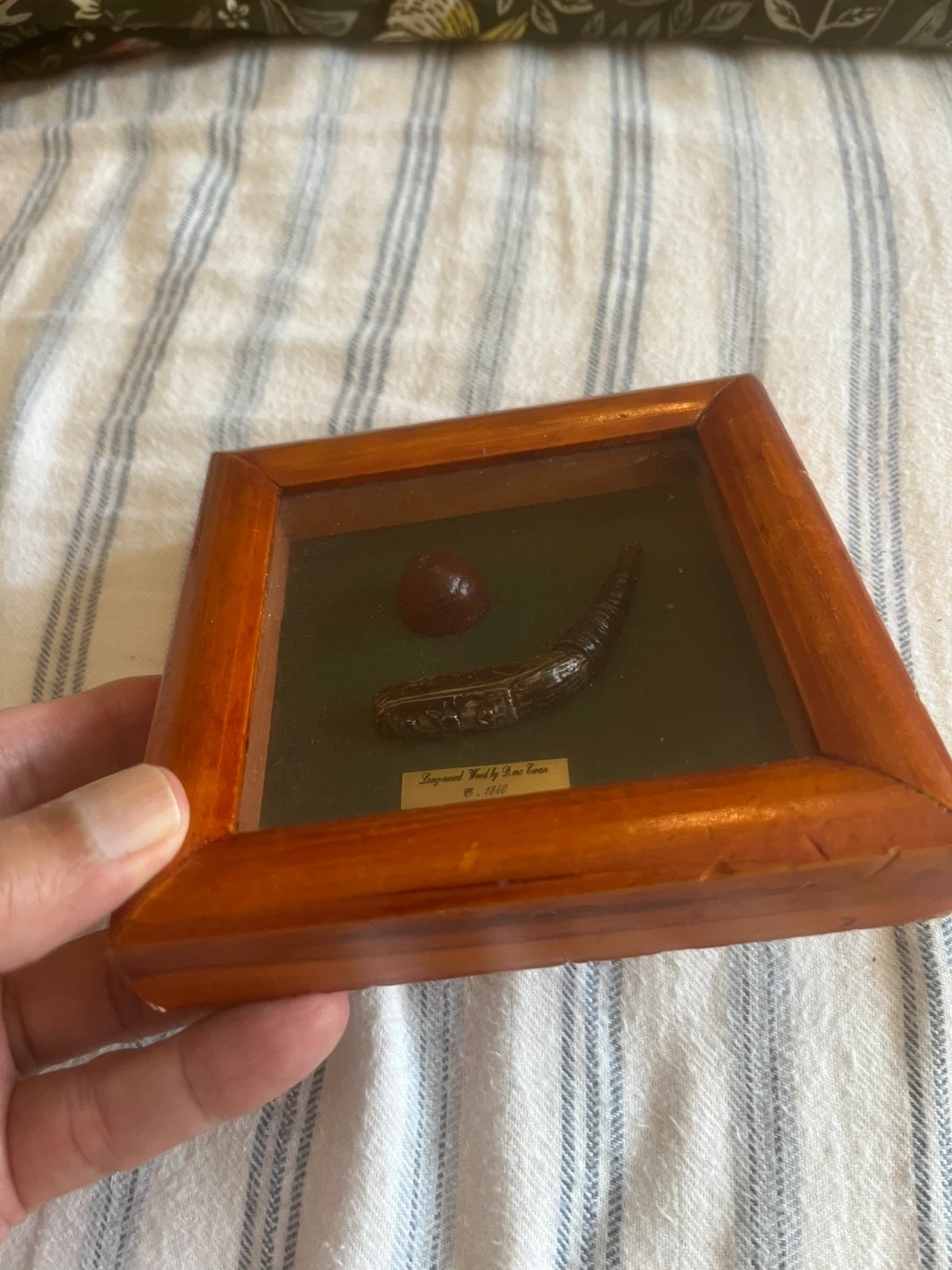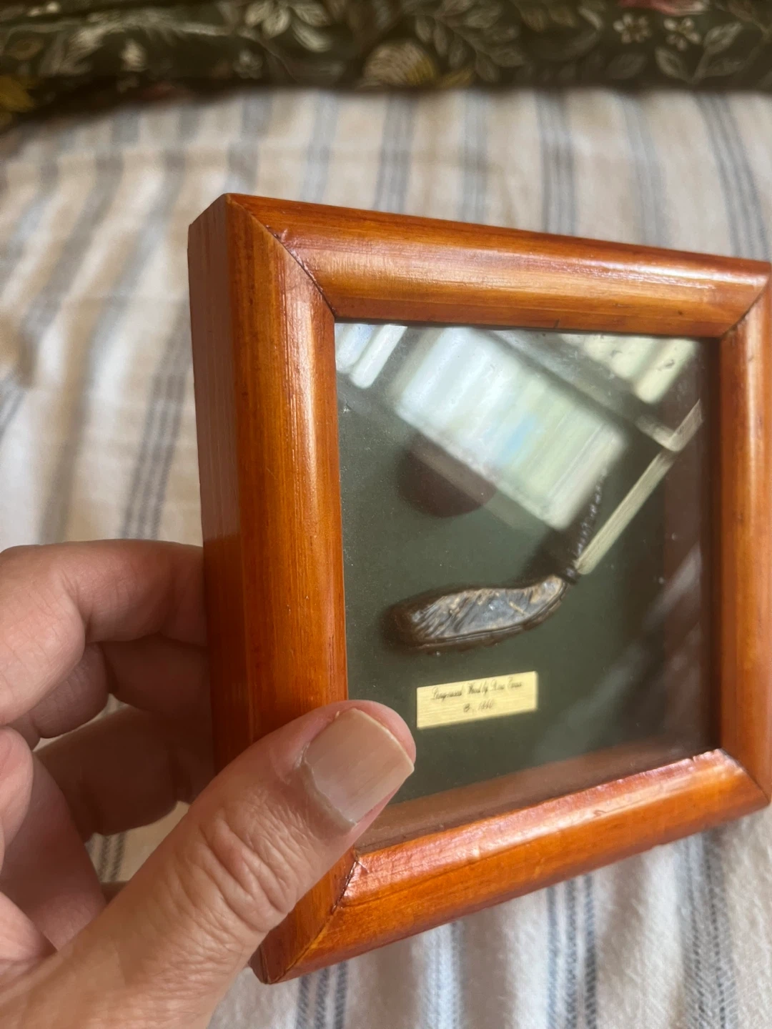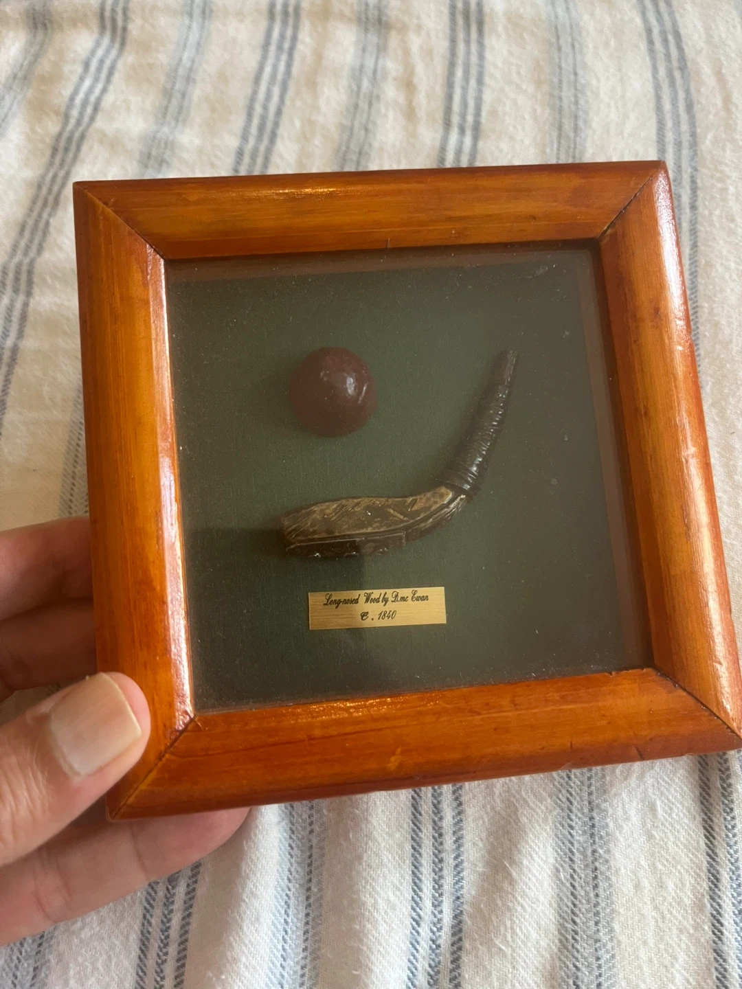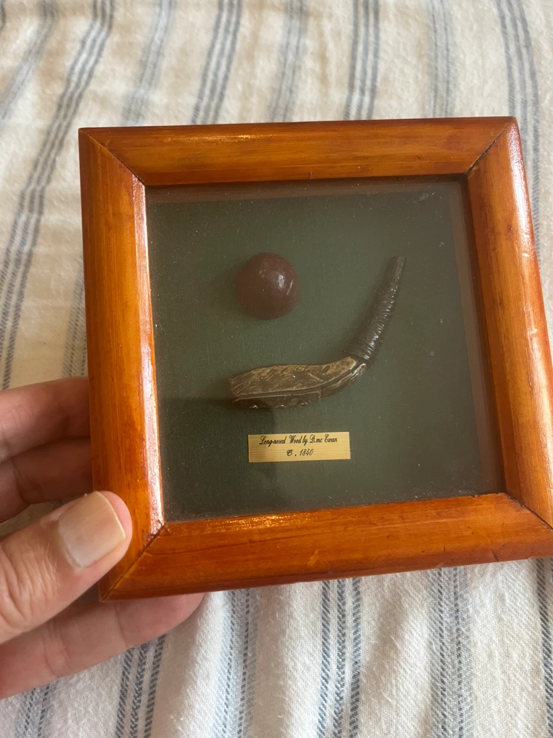 Selling a unique shadow box featuring a miniature golf club and ball, crafted from wood. The piece is labelled 'Longnosed Wood by Davie Cowan c. 1860'. Perfect for collectors or anyone looking to add a touch of vintage charm to their space