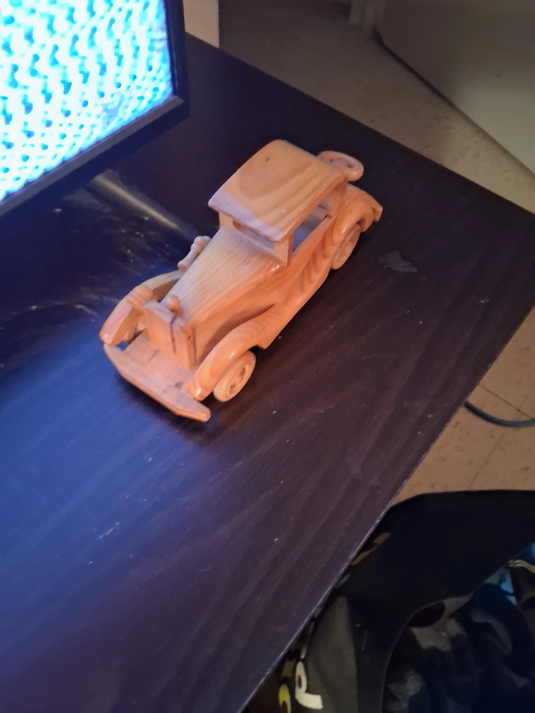 70Selling a vintage wooden car model. It's a beautiful piece with intricate details, perfect for collectors or as a decorative item. The car is made of wood and has a classic design. It shows some signs of wear, which adds to its vintage charm. Back left wheel is broken.