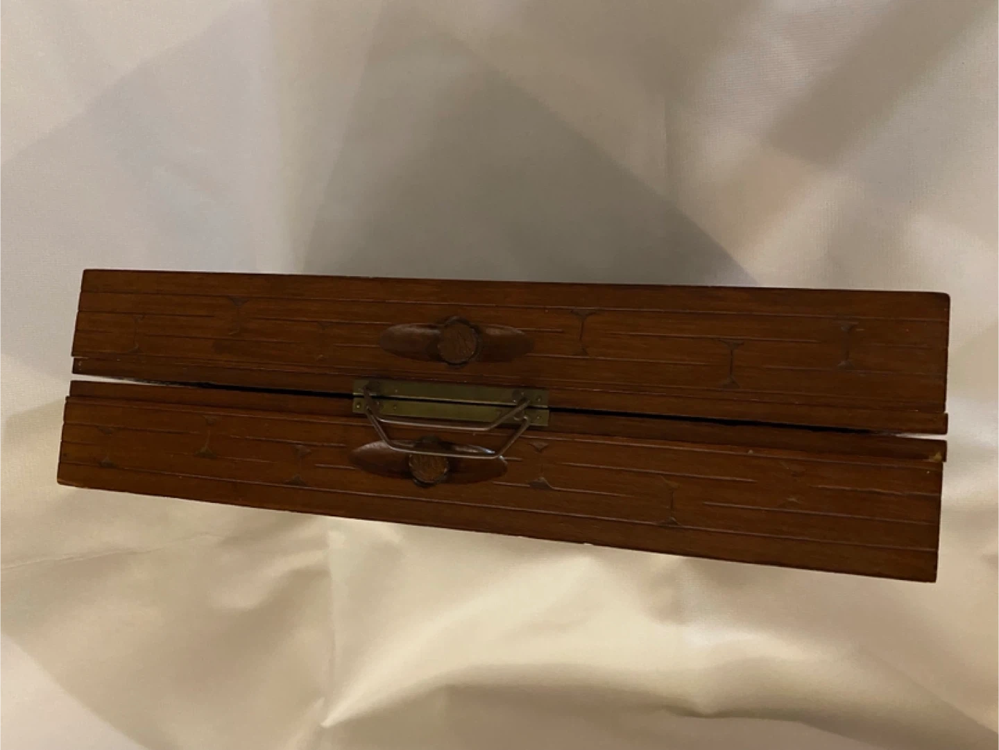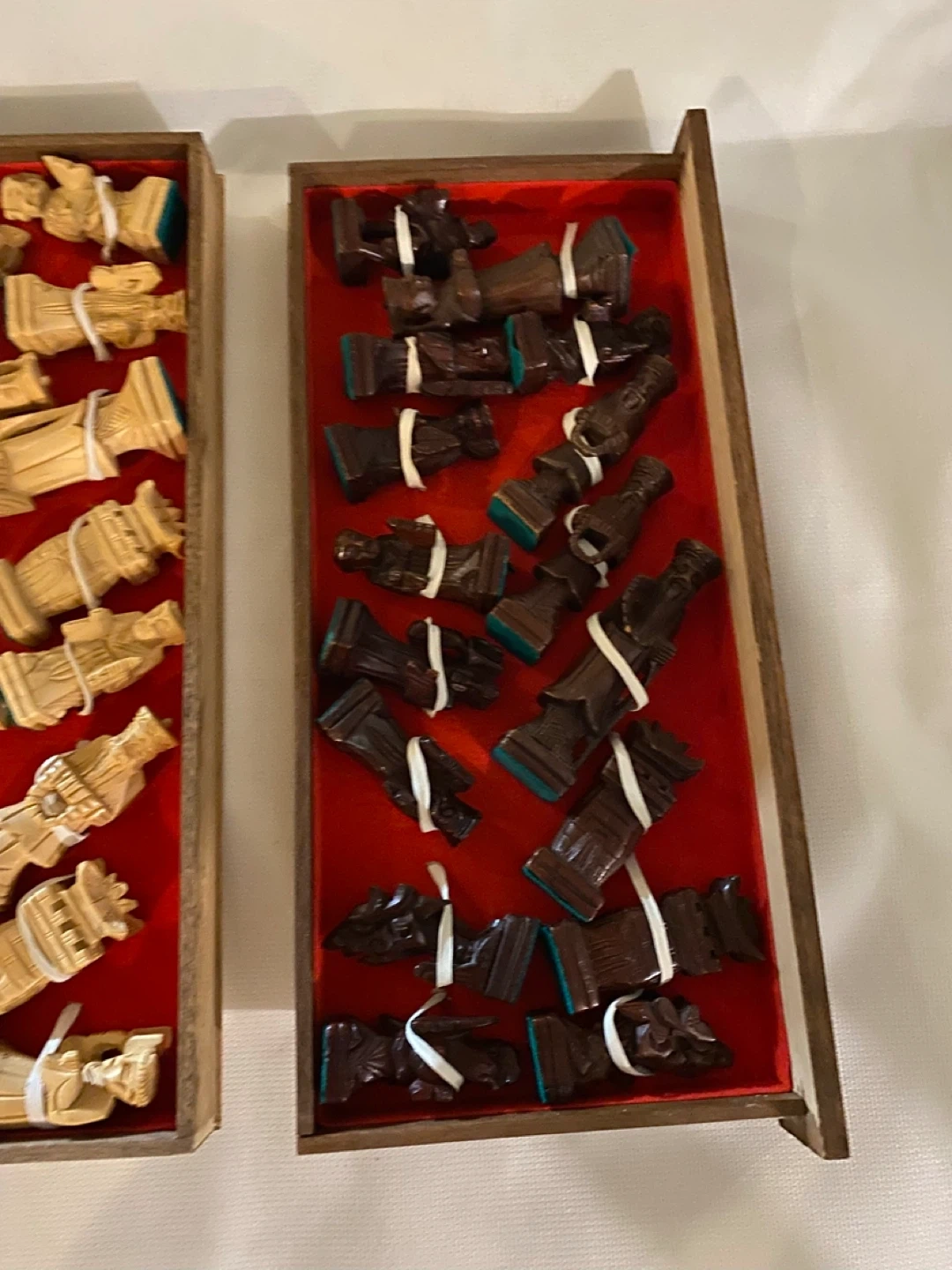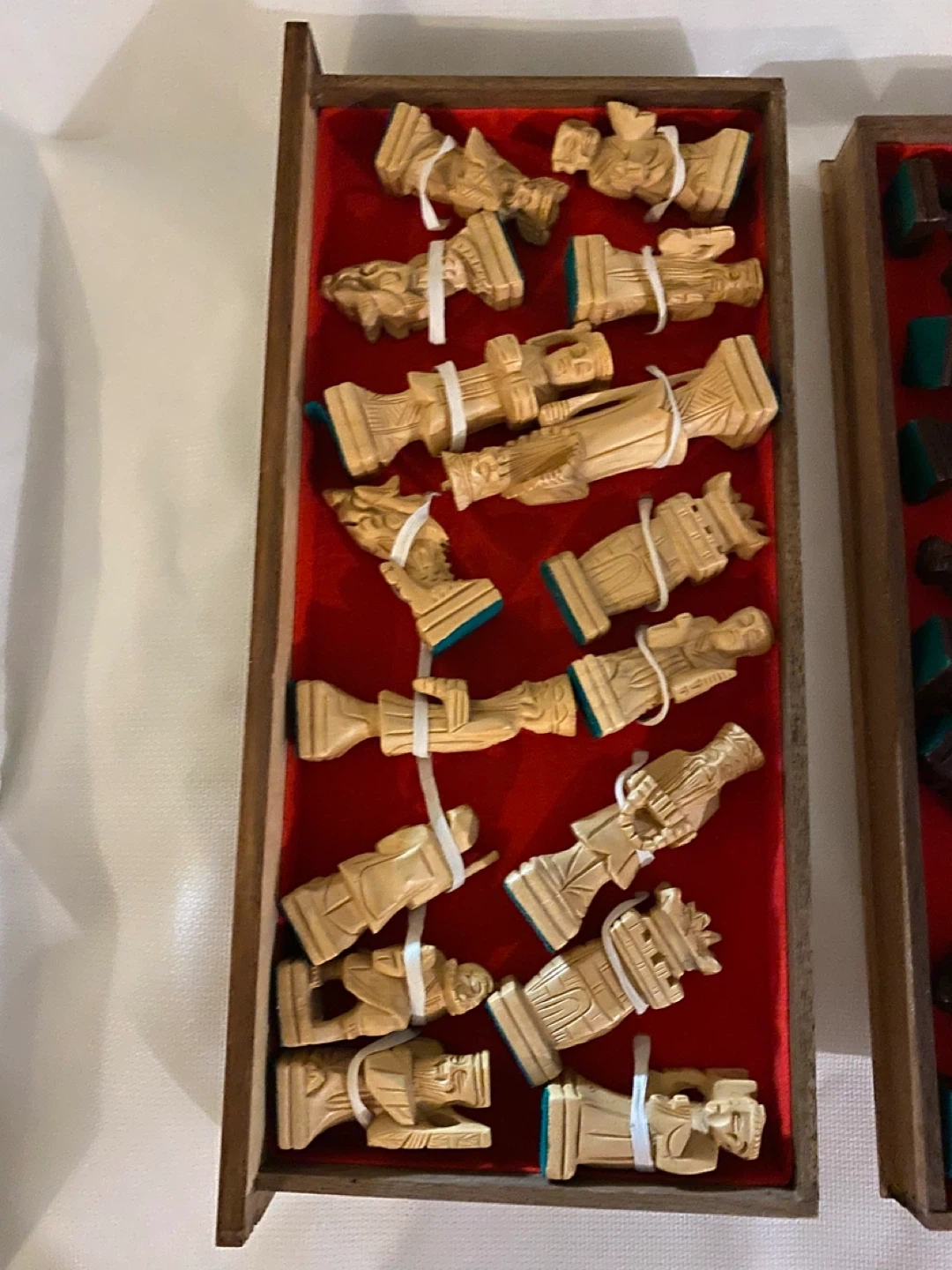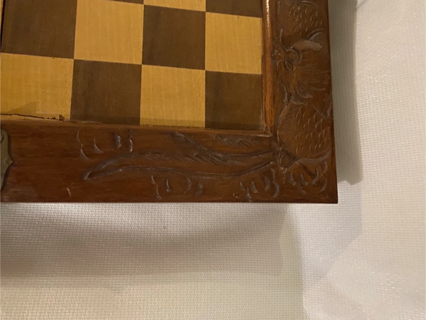 15Selling a vintage wooden chess set with beautiful carved details around the edges. It folds up into a box for easy storage and transport. The chess board itself has a classic checkerboard pattern in brown and tan. A unique piece for any chess enthusiast!