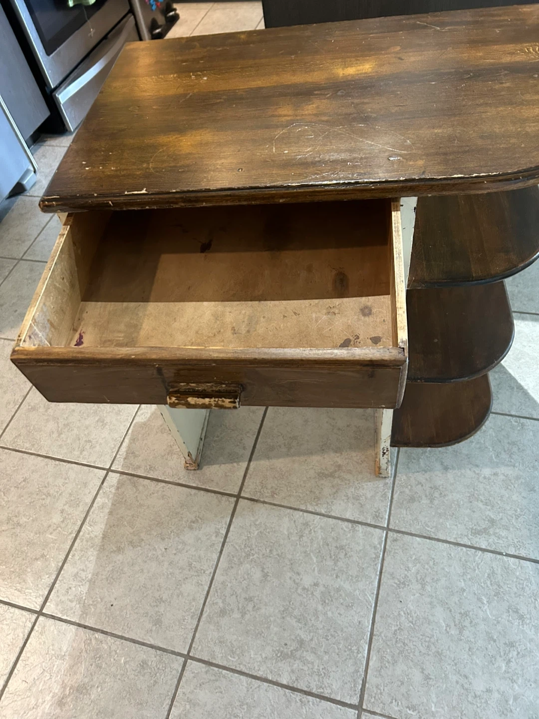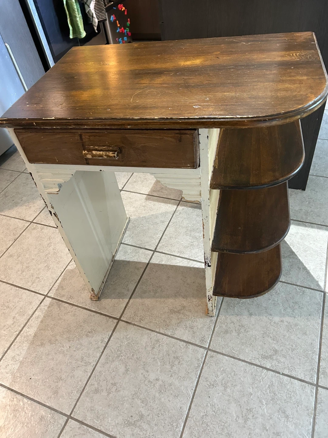Selling a vintage wooden desk featuring a drawer and side shelves. It has a unique, rustic look. Perfect for adding character to any room! 28”Wx18”Dx30.5H Dawes/Danforth. No porch pick up. I might be able to deliver nearby.