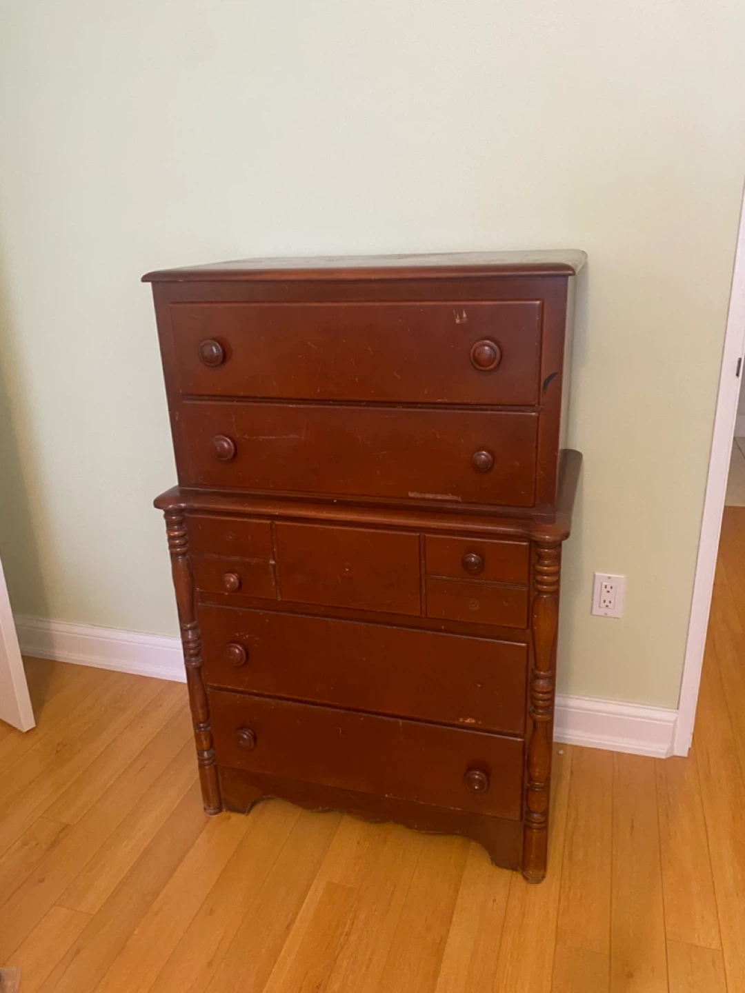 80Here's a charming vintage wooden chest of drawers! It has a lovely, classic look and would be a great addition to any bedroom or living space. It features multiple drawers for ample storage. Perfect for those who appreciate vintage furniture!