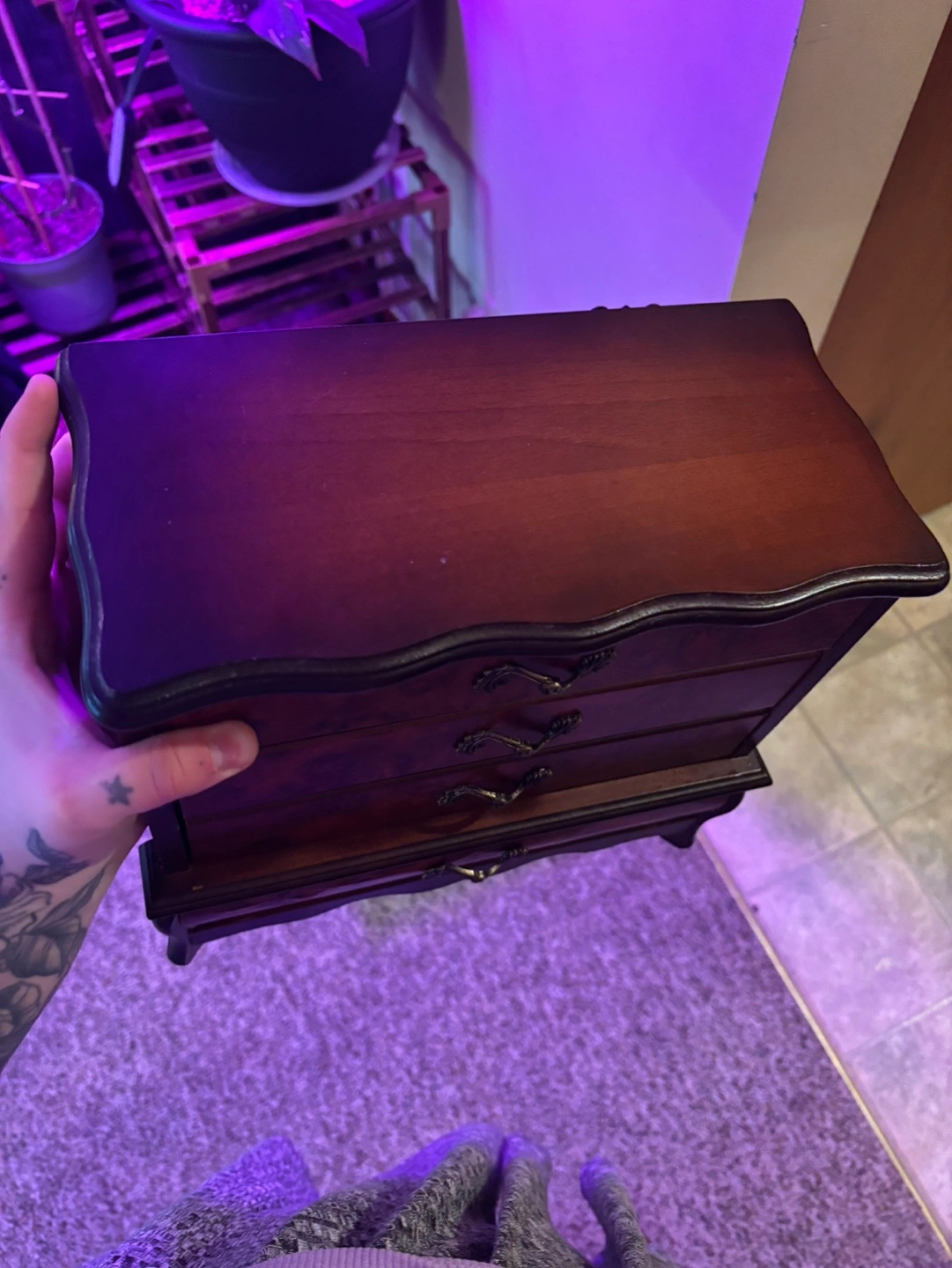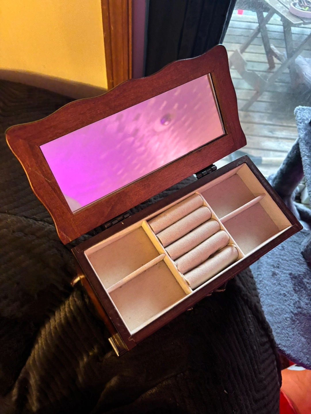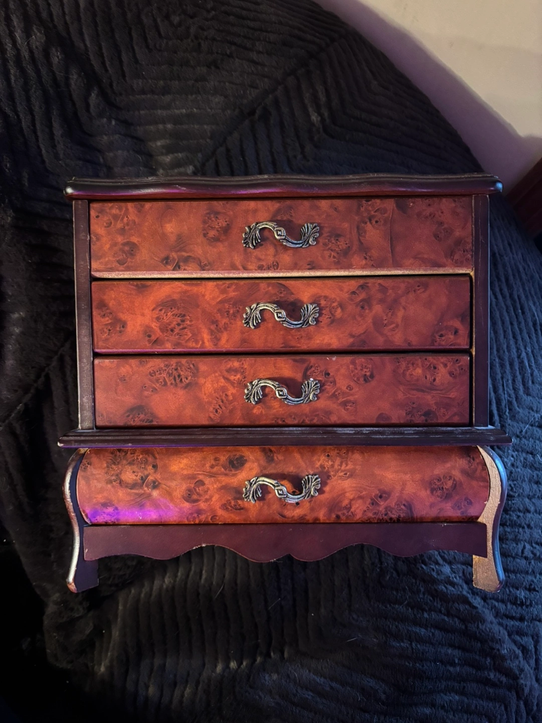 Beautiful vintage wooden jewellery box. Features three drawers and a lift-off lid with a mirror. Ideal for storing rings, earrings, necklaces, and other small jewellery items. Has some minor wear. Pick up in debert or lower truro!
