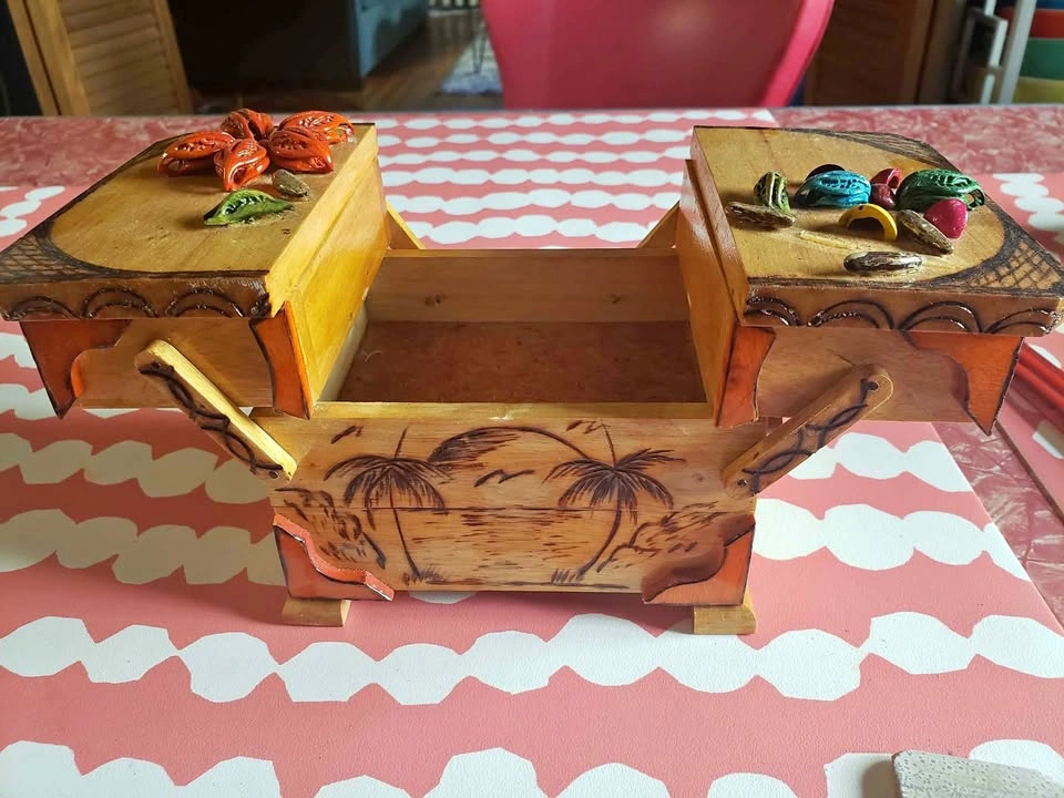 25Small vintage wooden sewing box. Hand painted and wood burn tropical palm tree design with intricate 3D flowers on the lid. Folds out into 3 compartments. Great for storing buttons and bobbins. 2 of the small design stones are missing from the top but that's an easy fix. Pick up in Upper Lonsdale North Vancouver. Cross posted with Marketplace
