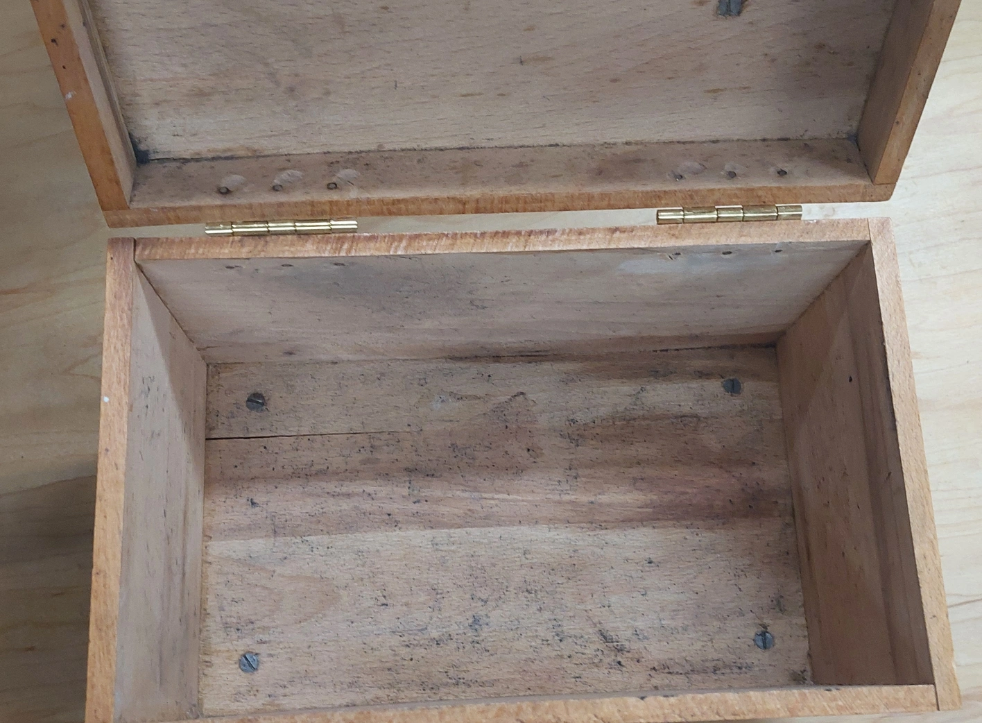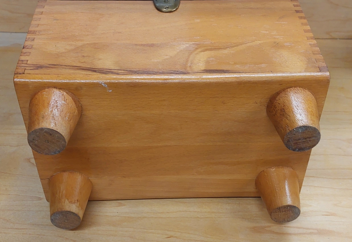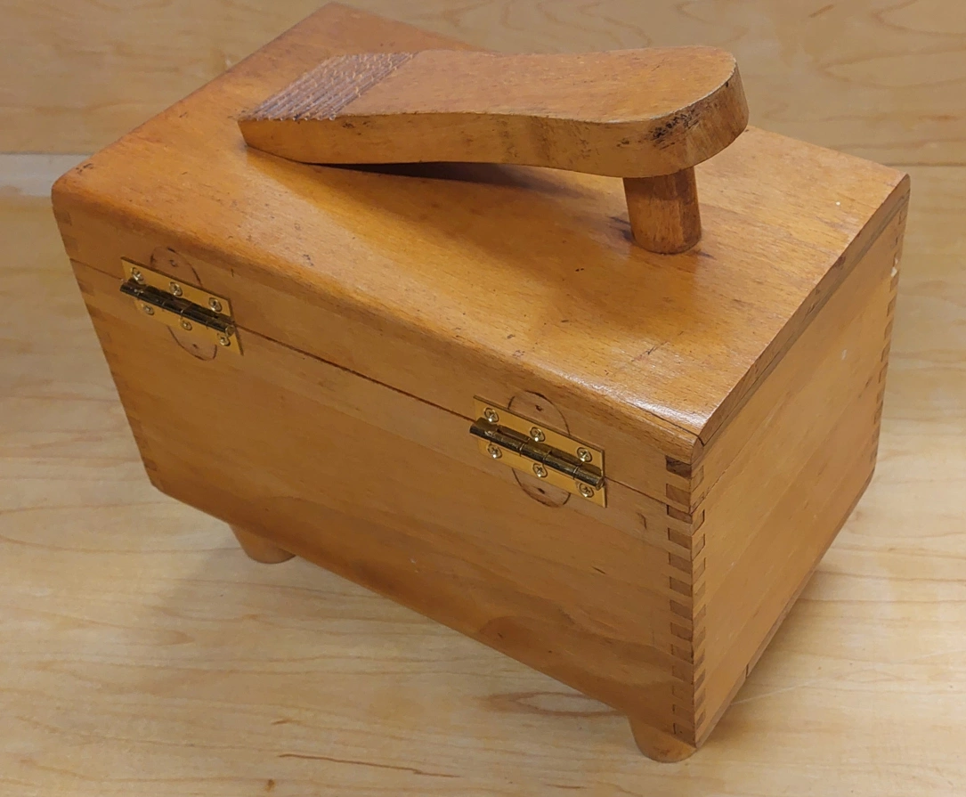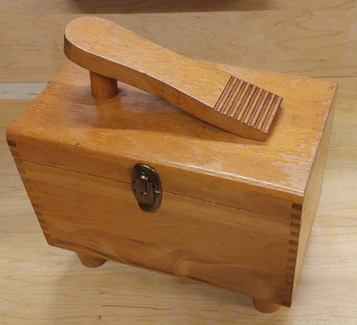 Wooden shoe shine box. Small brass clasp. Four short legs. The back hinges were broken and the original finish was mostly gone. Replaced the hinges and gave it a waterproof clear coat on the outside. Shows some wear through the new clear coat to keep the old look. 10.5" x 6.5" x 12" outer, 9.75" x 5.75" x 5" inside