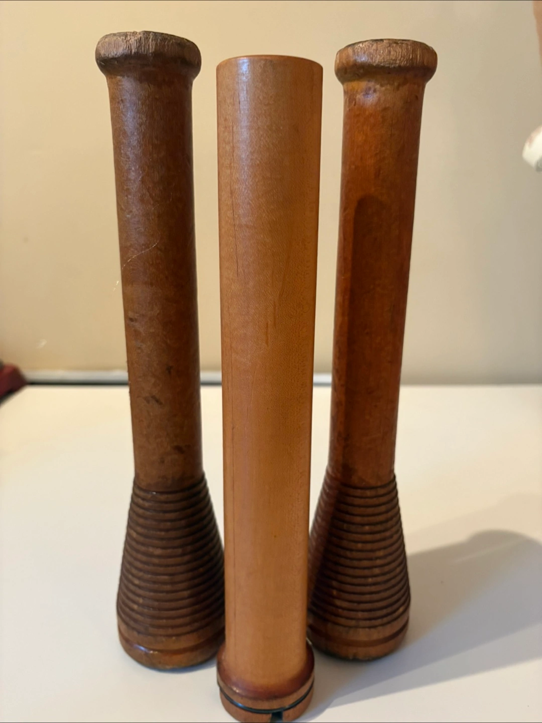 20Here's a set of three vintage wooden textile spools. They have a lovely aged look, with varying shades of brown. Perfect for adding a touch of rustic charm to your home decor or craft projects! They show some signs of wear consistent with age, but are in good condition overall