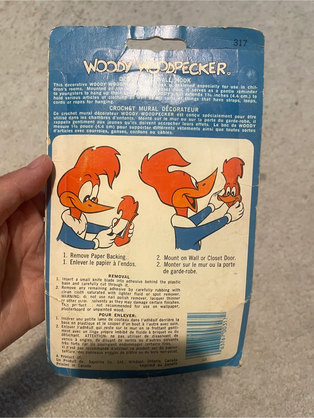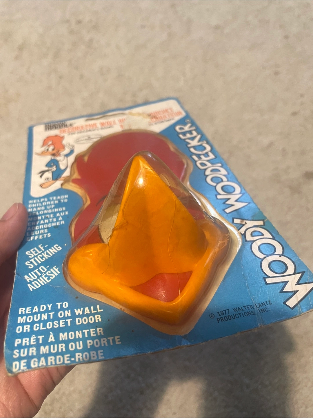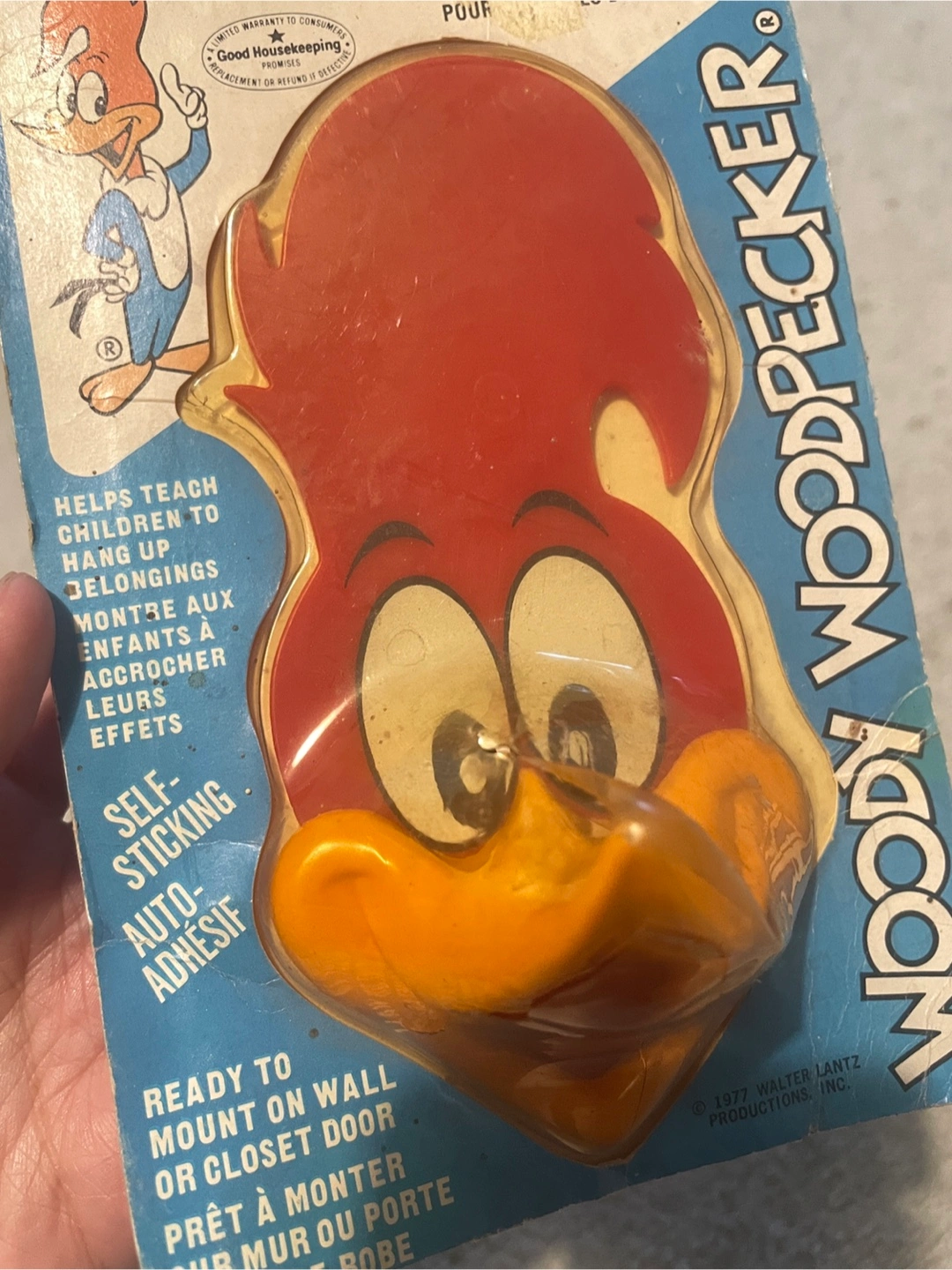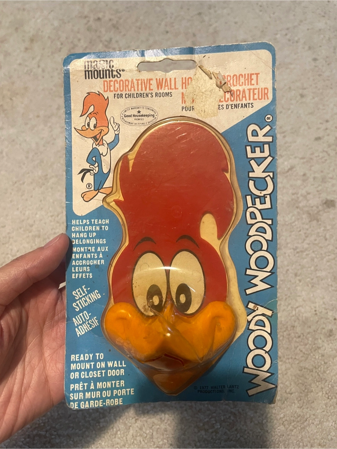 15Add a touch of nostalgia to your child's room with this vintage Woody Woodpecker decorative wall hook! This self-sticking hook is ready to mount on a wall or closet door. It's designed to help kids hang up their belongings. Made in Canada by Sapoline Co., Ltd. in Windsor, Ontario. © 1977 Walter Lantz Productions, Inc.
