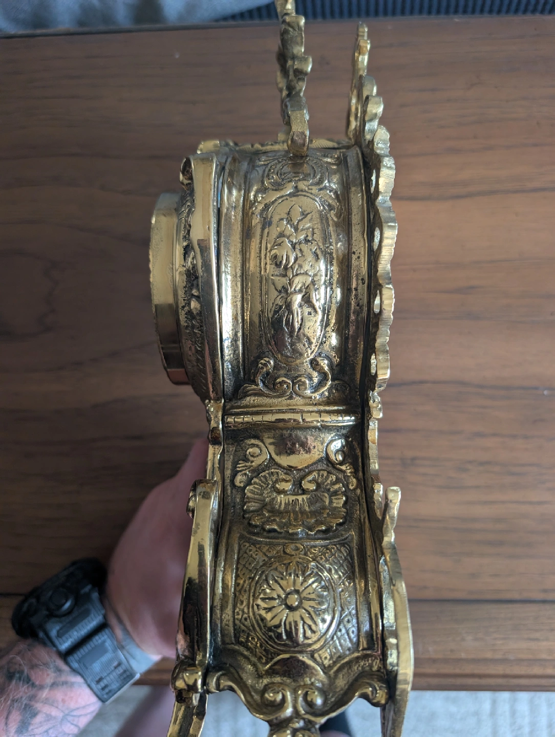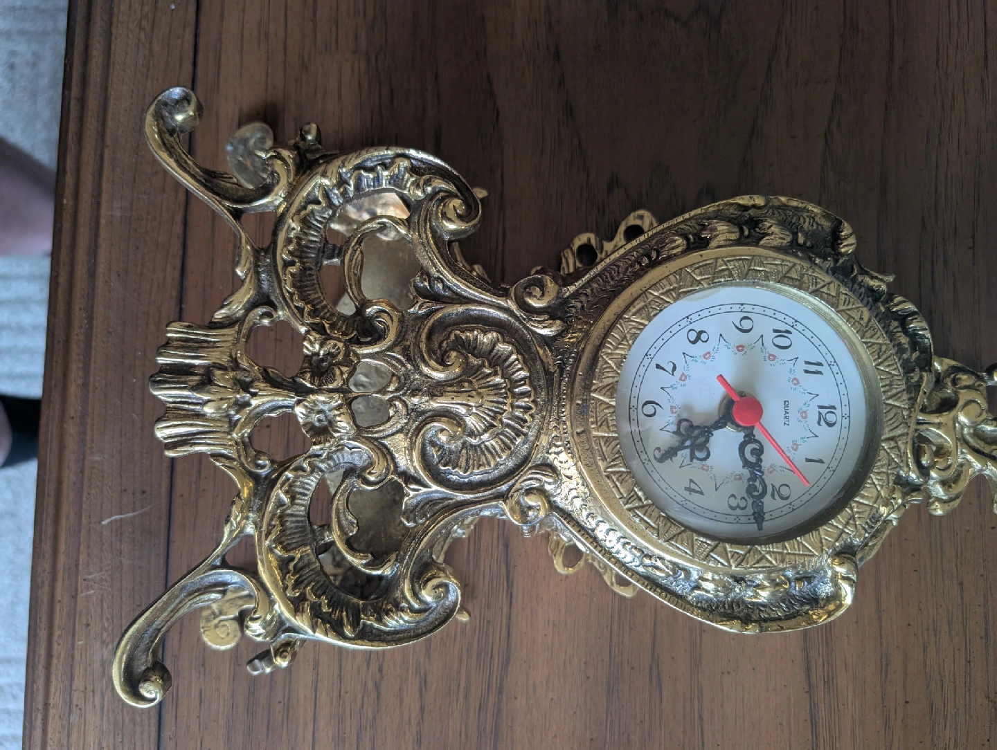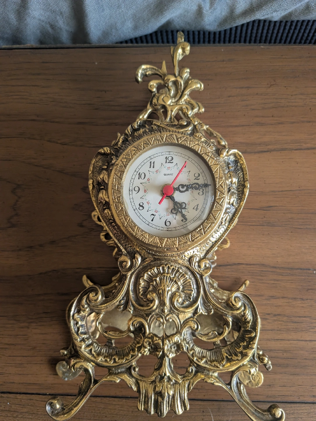 Vintage nice working in great condition battery powered rococo brass mantel ornate clock with quartz movement. 190$ make offer price negotiable pick up in forest lawn