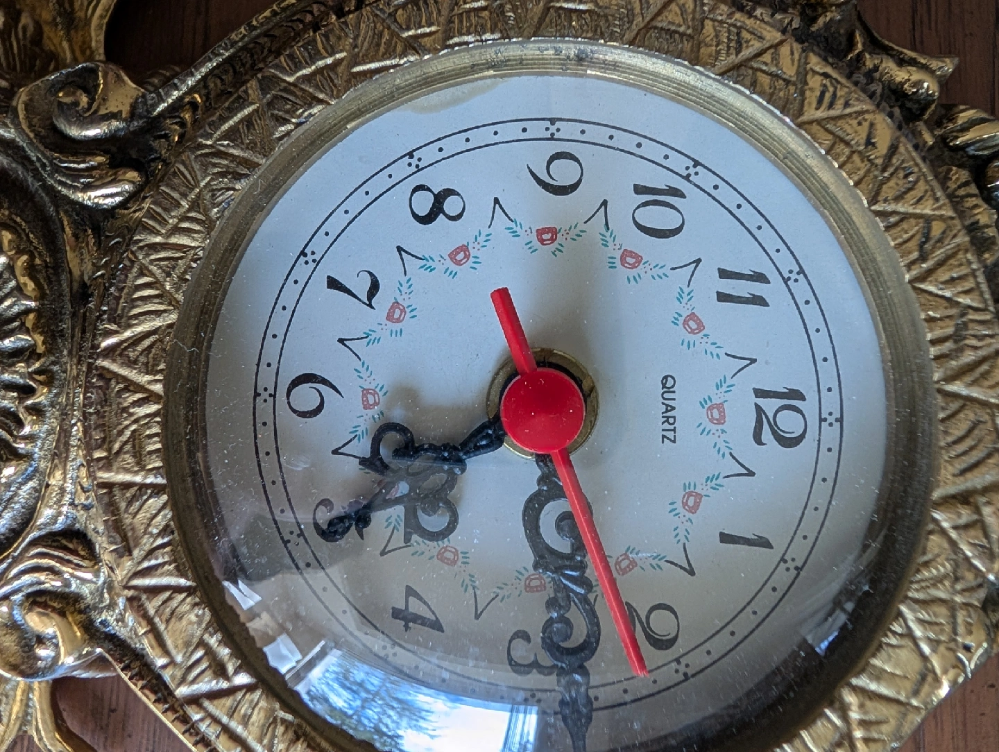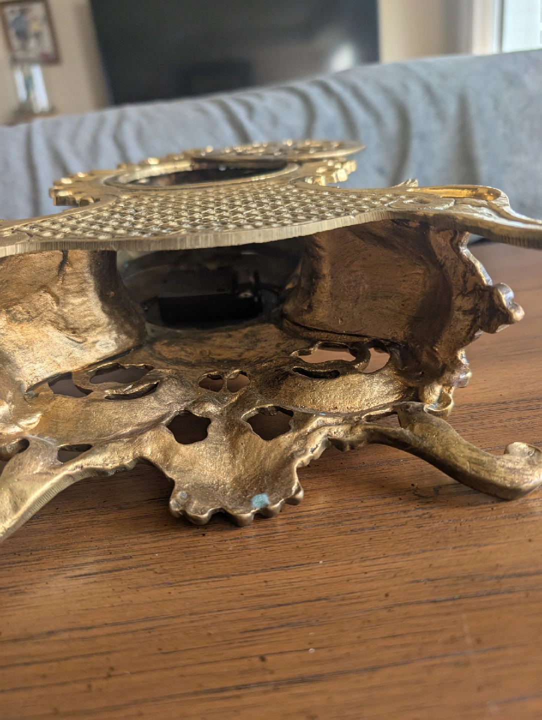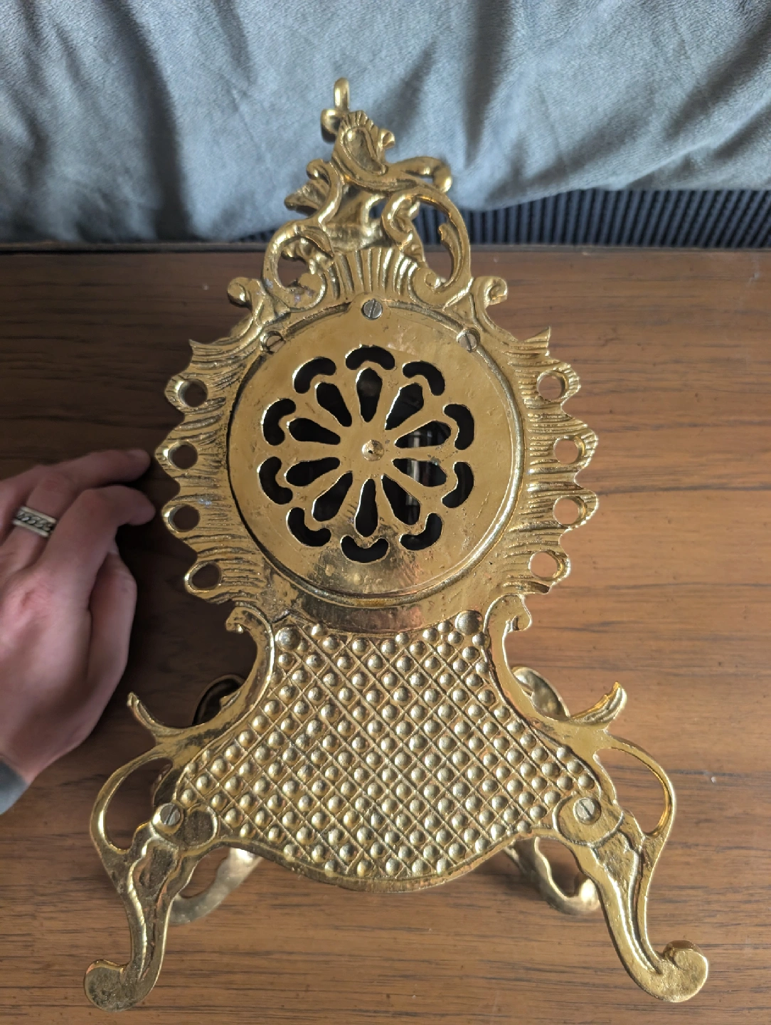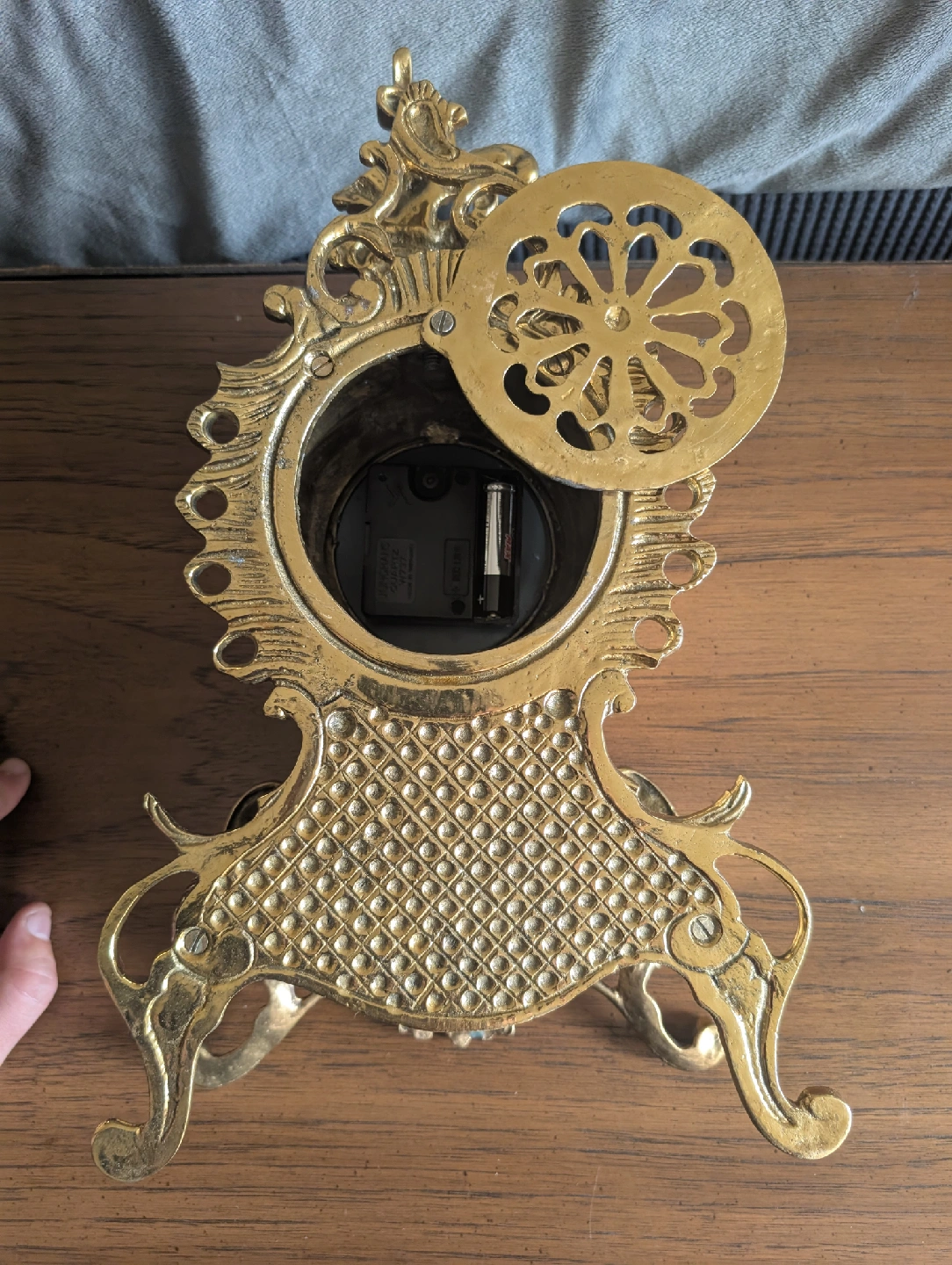 Vintage nice working in great condition battery powered rococo brass mantel ornate clock with quartz movement. 190$ make offer price negotiable pick up in forest lawn