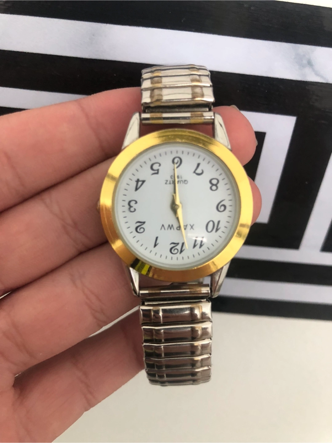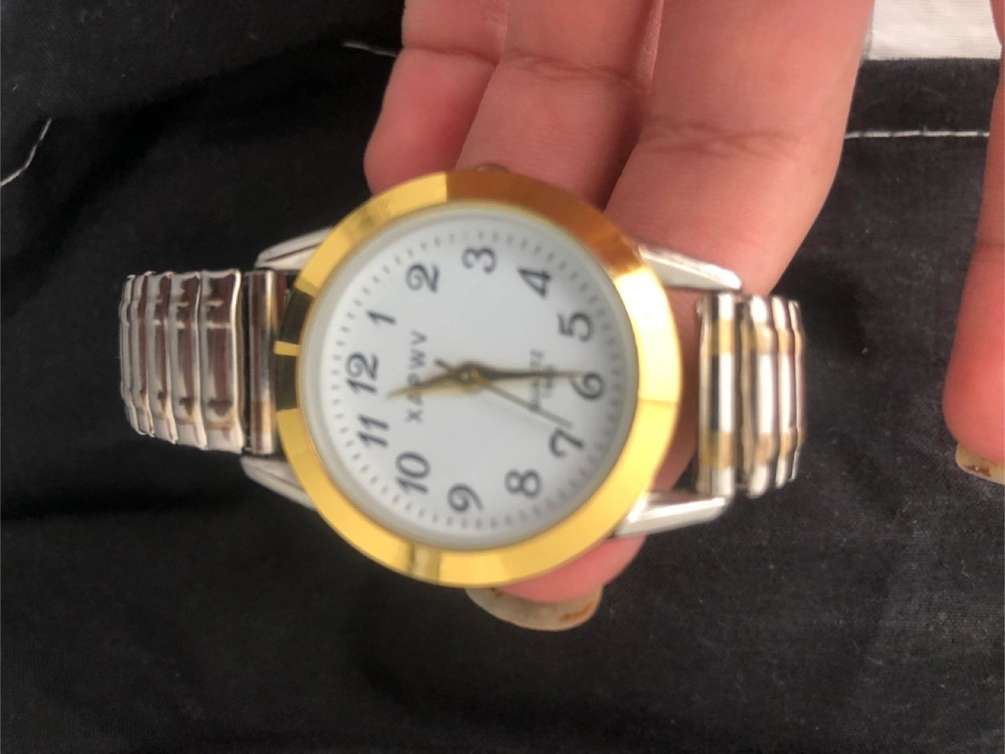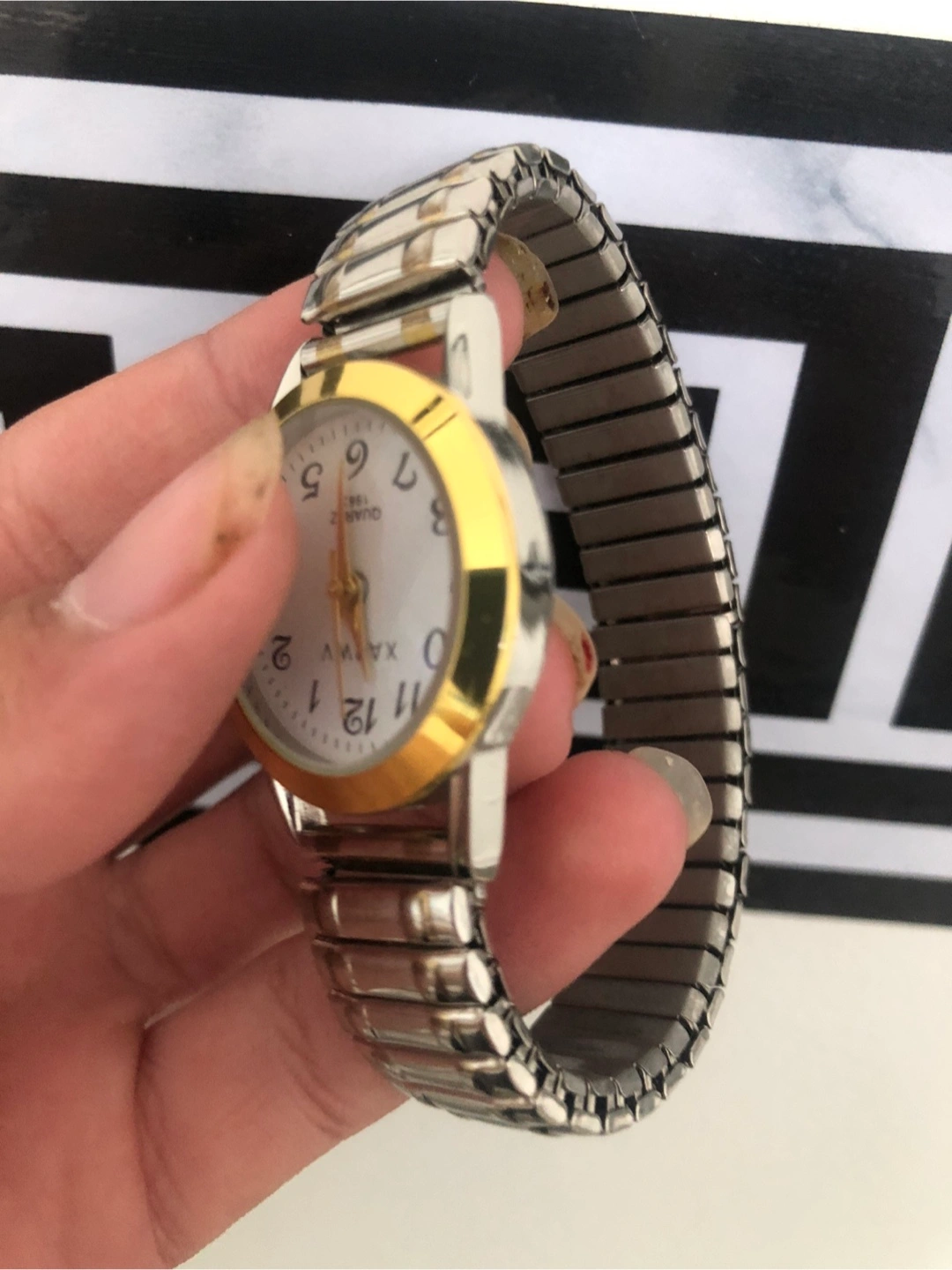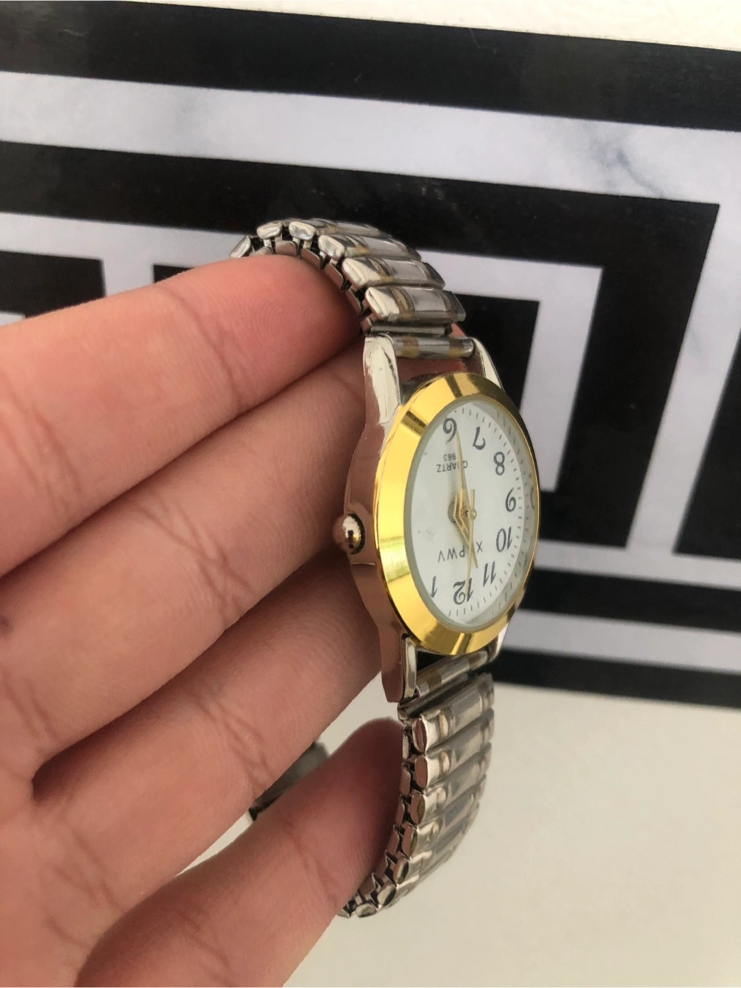 Women's watch. Features a gold-toned face and silver expandable band. Quartz movement. Pre-owned.