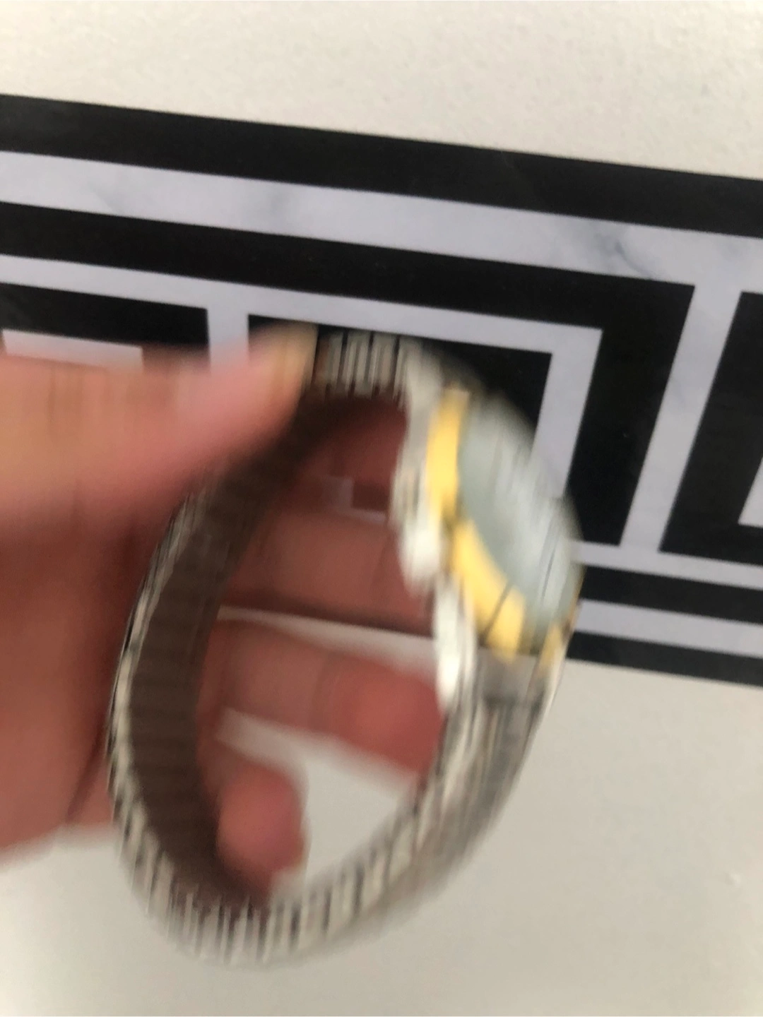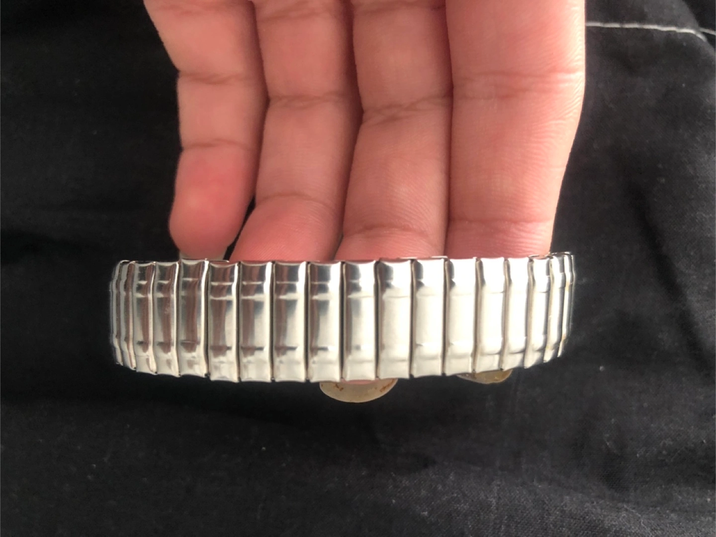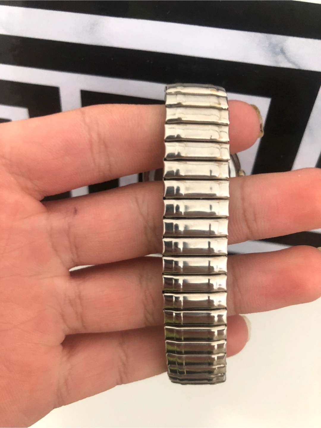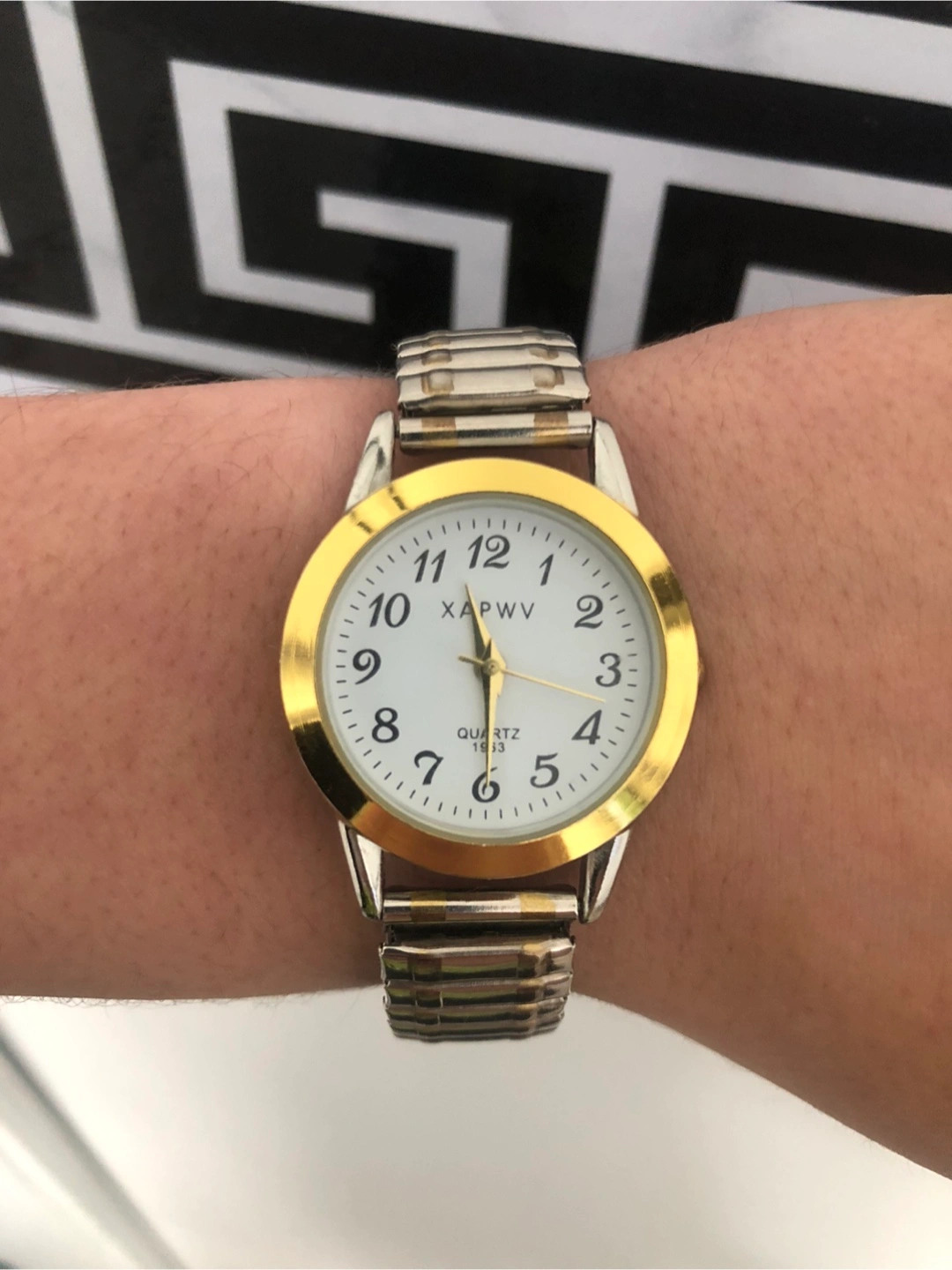 Women's watch. Features a gold-toned face and silver expandable band. Quartz movement. Pre-owned.