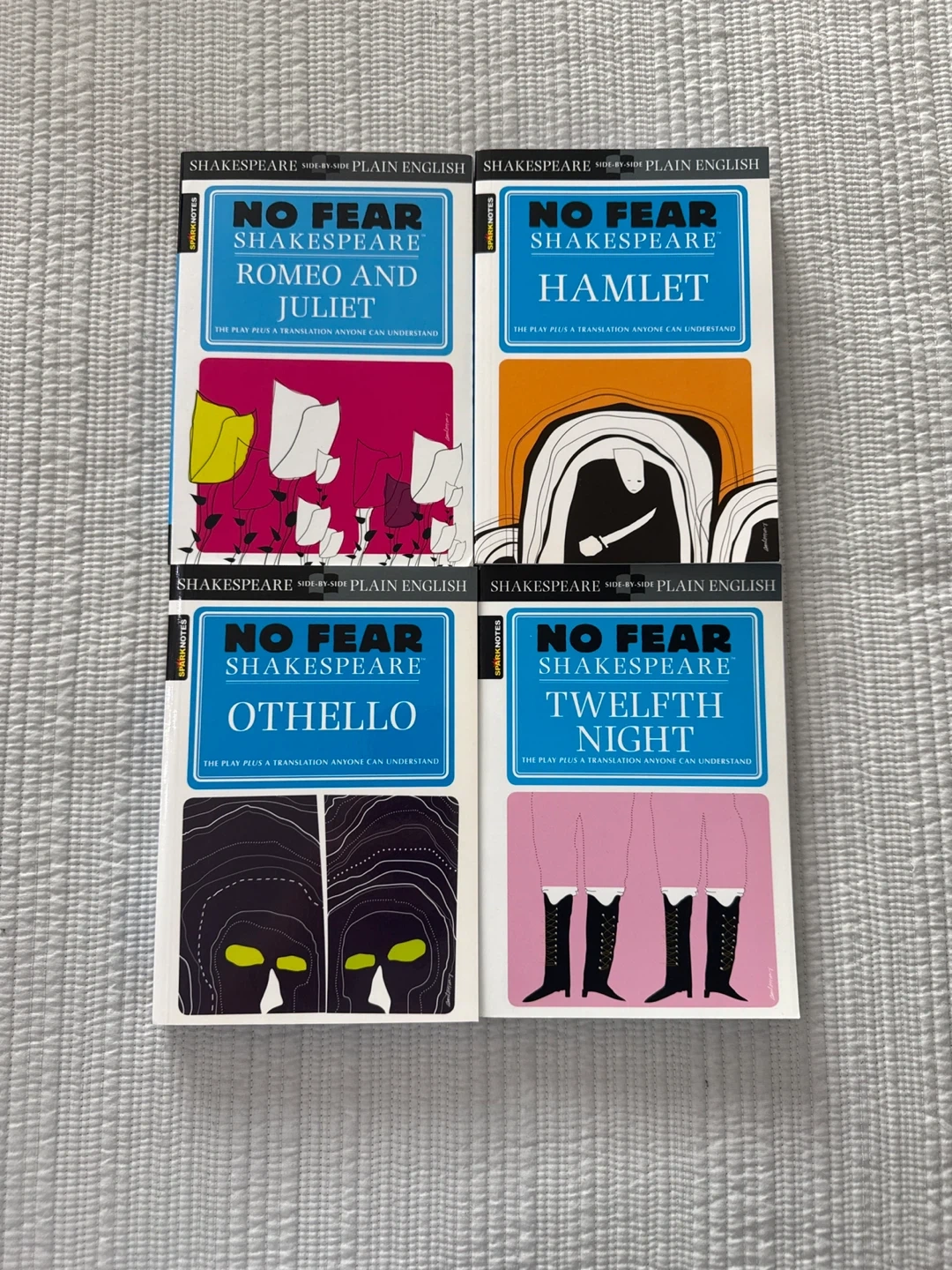 SparkNotes No Fear Shakespeare set includes Romeo and Juliet, Hamlet, Othello, and Twelfth Night. Each book offers the original Shakespearean text alongside a modern translation. Great for students needing to understand the plays! - $15.00 for all 4.