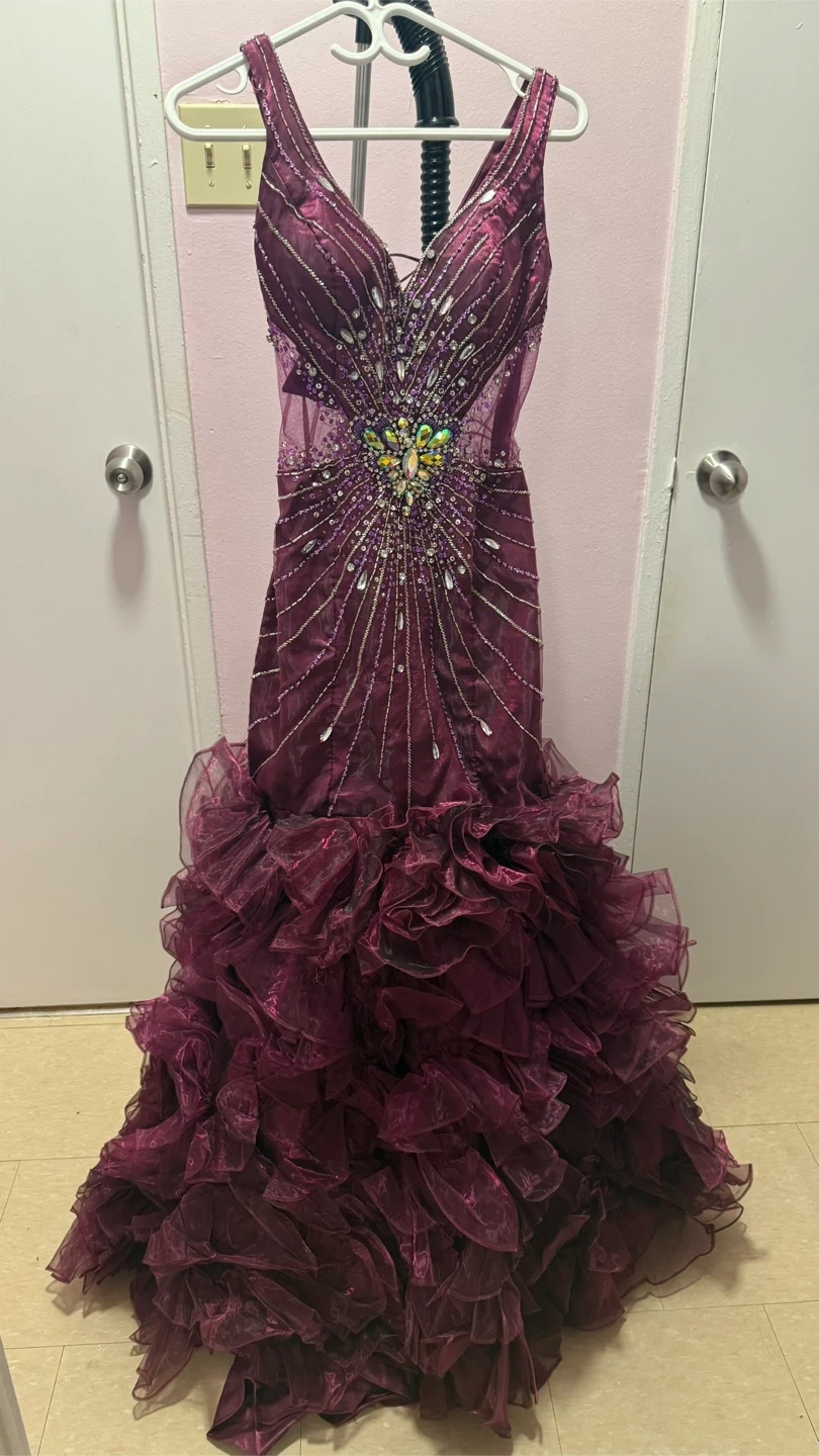 21Selling a beautiful burgundy formal dress with intricate beadwork. It's in great condition and perfect for a special occasion!