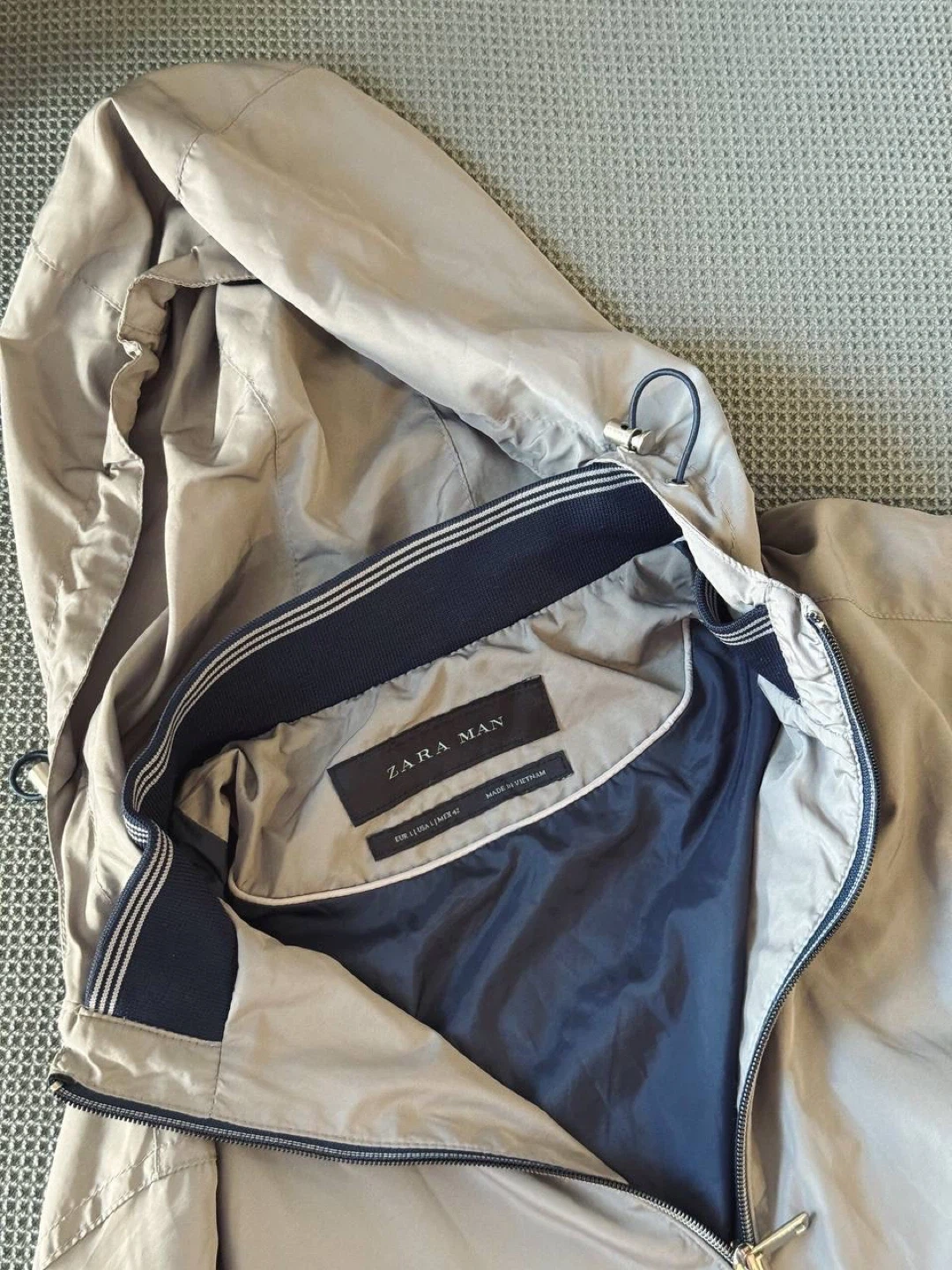 Stylish gray jacket from ZARA Man featuring a hood and two zippered pockets. Lightweight and comfortable, perfect for everyday wear.