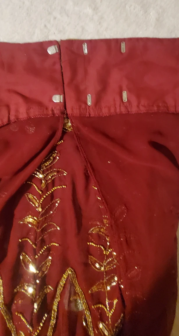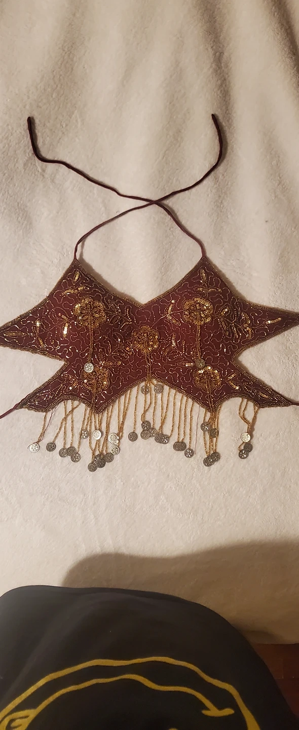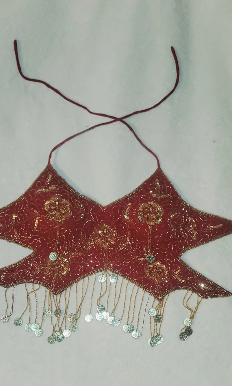 Starfish bra and matching skirt. This is a very well made outfit. Deep red (wine) coloured with tons of gold beading, very intricate. Bra is padded. The last picture has the skirt inside out, to show that the clasp can accommodate slim and wide hips.