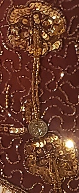 Some beading is missing or pulled. If you're handy, can be easily restored. If not, it still makes a stunning costume as it is.