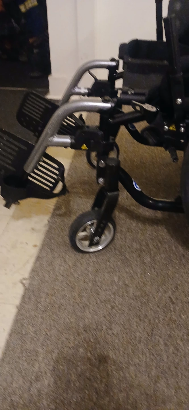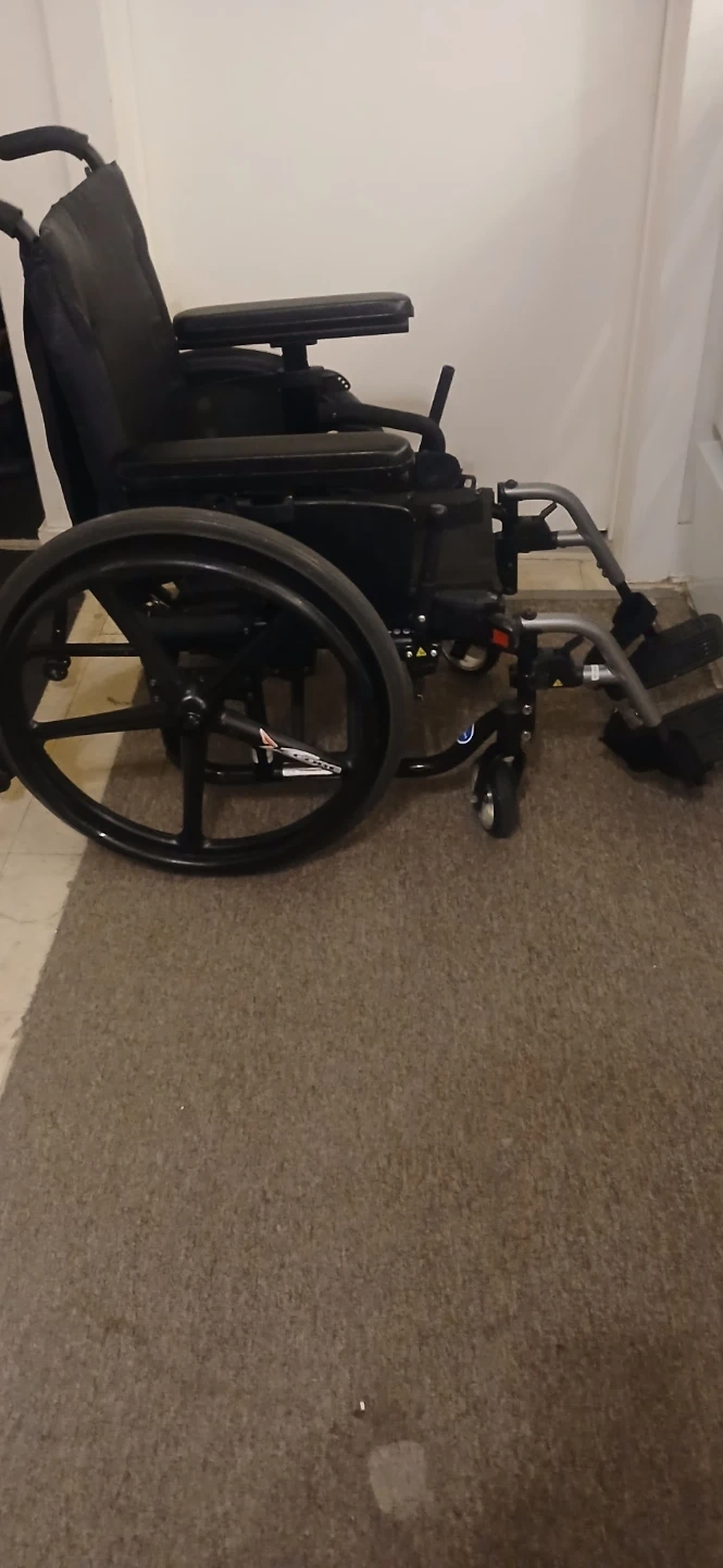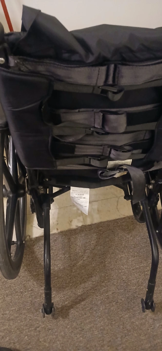 This is a lightweight Quickie Helium wheelchair. It's designed for easy transport and mobility. Comes with a seatbelt for added safety. This wheelchair would be useful for individuals needing assistance with mobility.