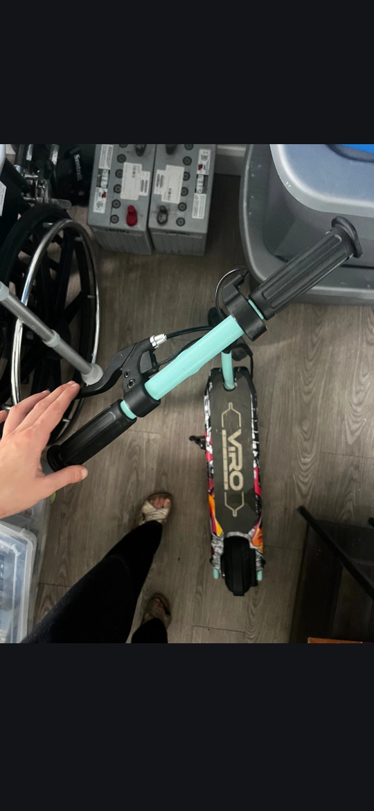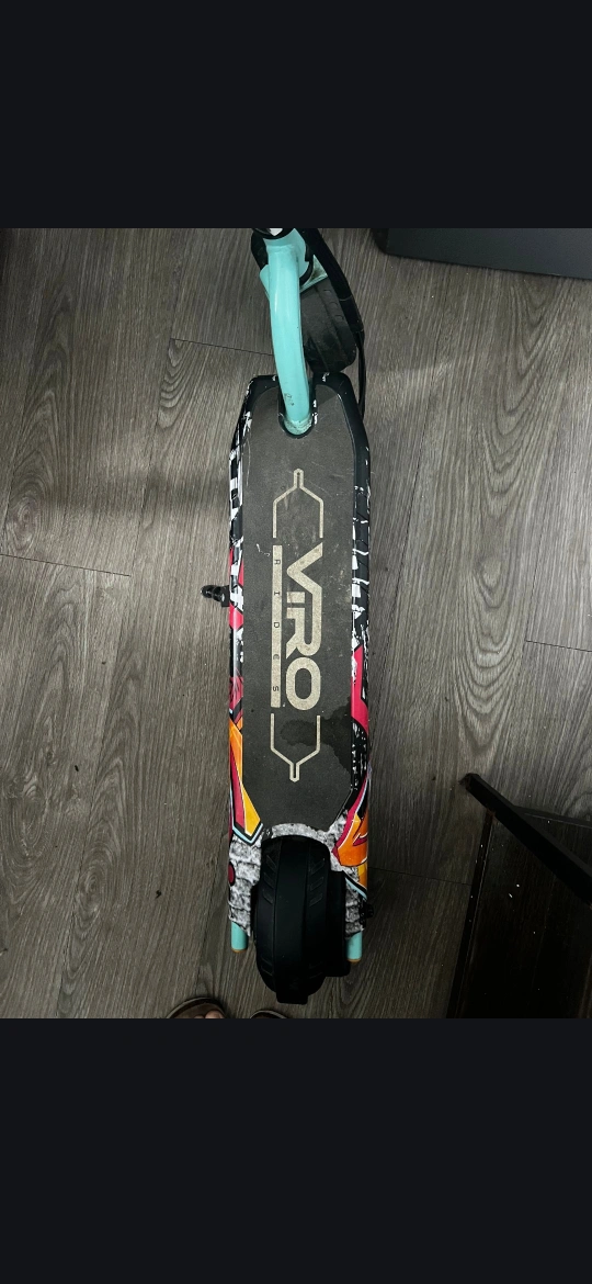 10Selling a Viro Rides electric scooter. It has some cool graphics and a light blue handle. It can go up to 10 mph and has a maximum rider weight limit of 120 lbs. Please use caution and wear protective gear when riding! No plug avaliable on amazon $15. still has power to test