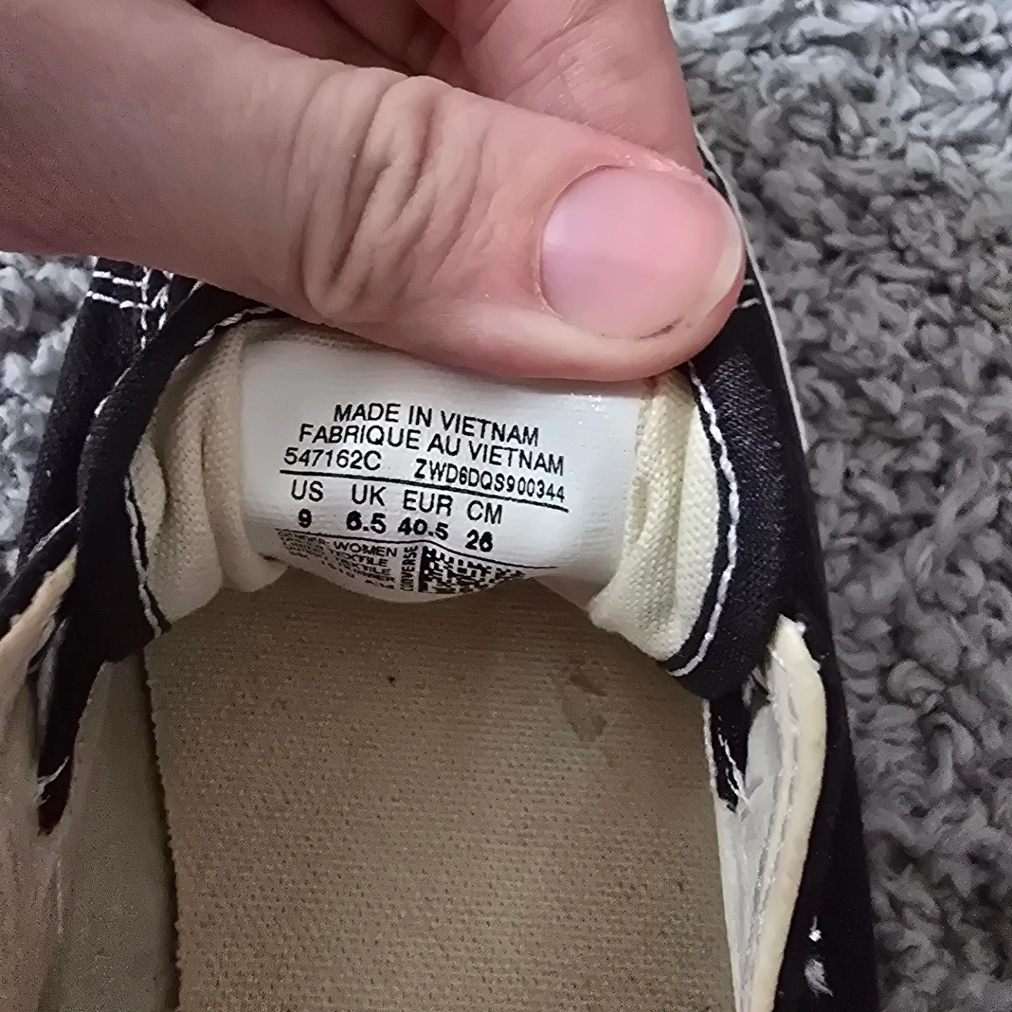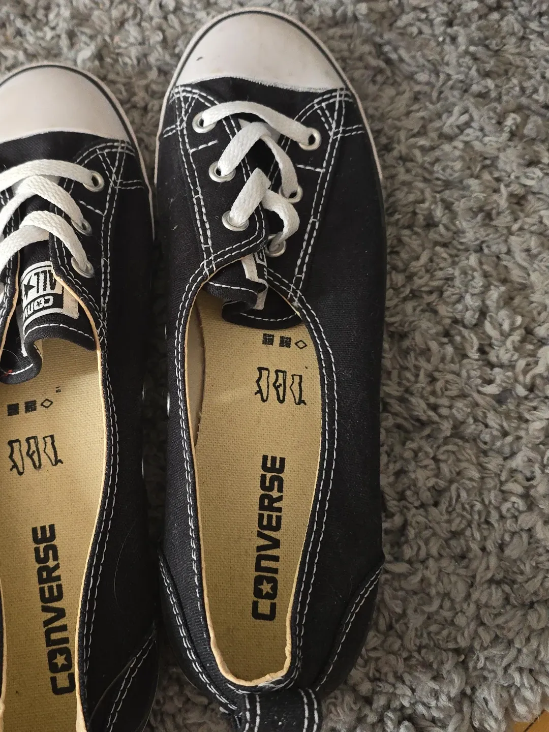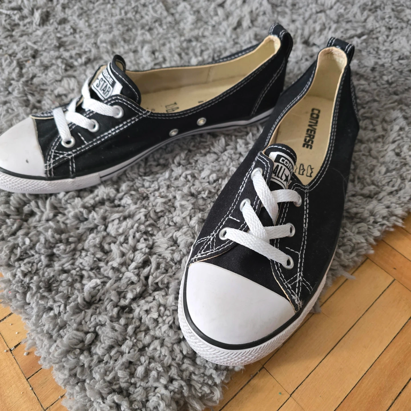 These are black Converse ballet flats with white laces and stitching. They're a women's size 9 US, 6.5 UK, 40.5 EUR, and 26 CM. Canvas material with rubber toe caps. Toe caps a little scuffed but plenty of life still in them.