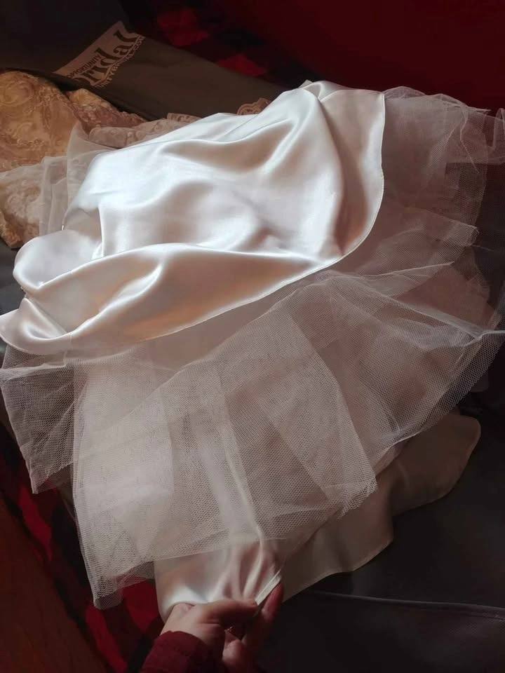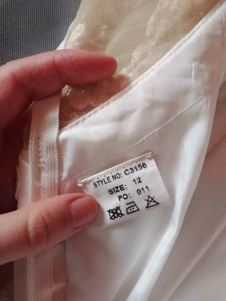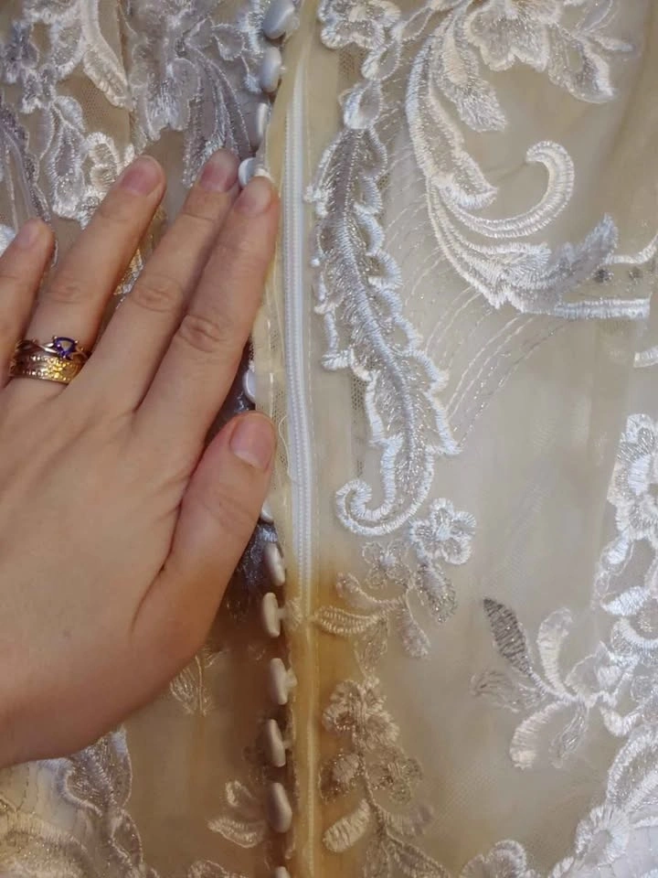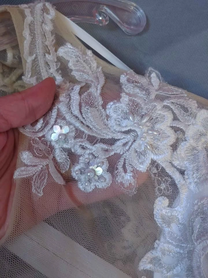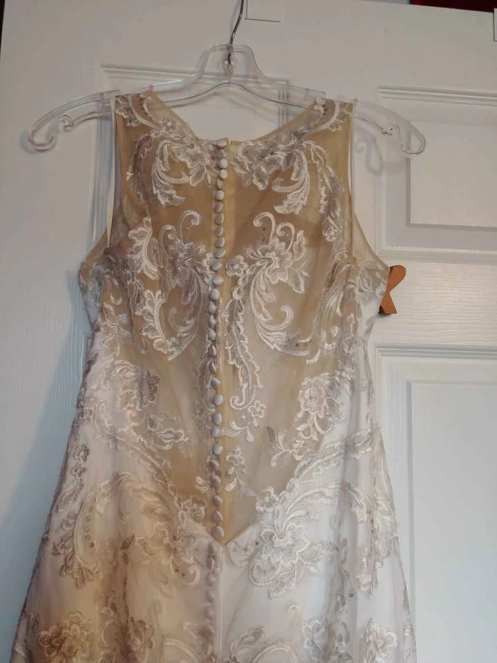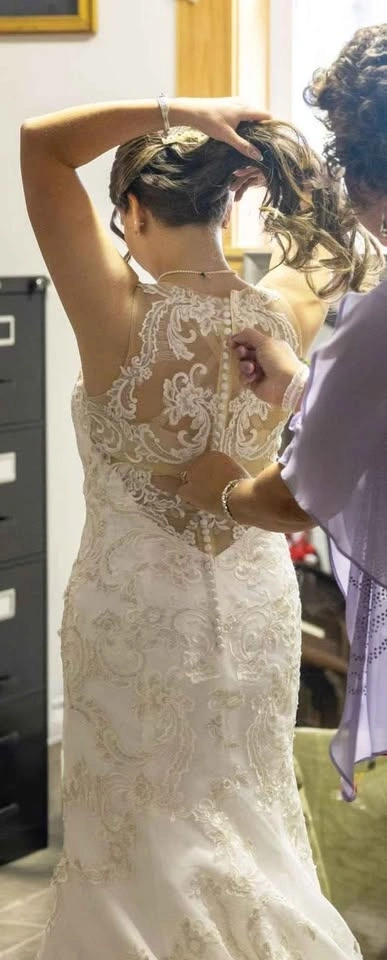 Stunning wedding dress! Size 12, mermaid fit with a beautiful train. Has a bustle hook for the train. Intricate lace floral design with delicate heirloom beadwork. Modest plunge neckline. Back has sheer lace and button closures. Inside has crinoline underskirt and silk lining.
