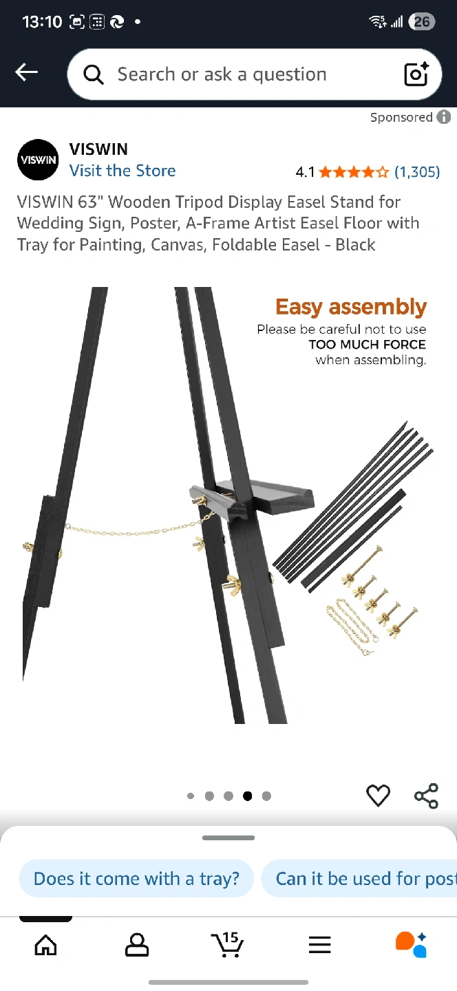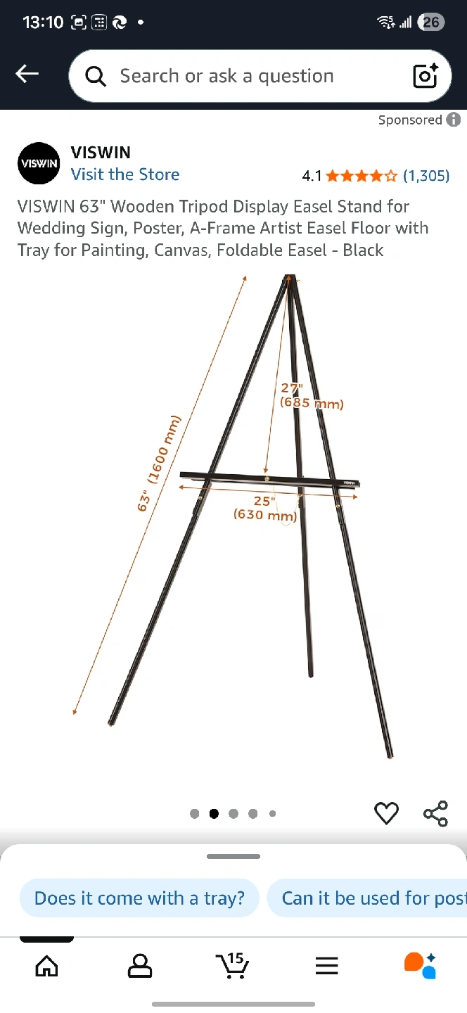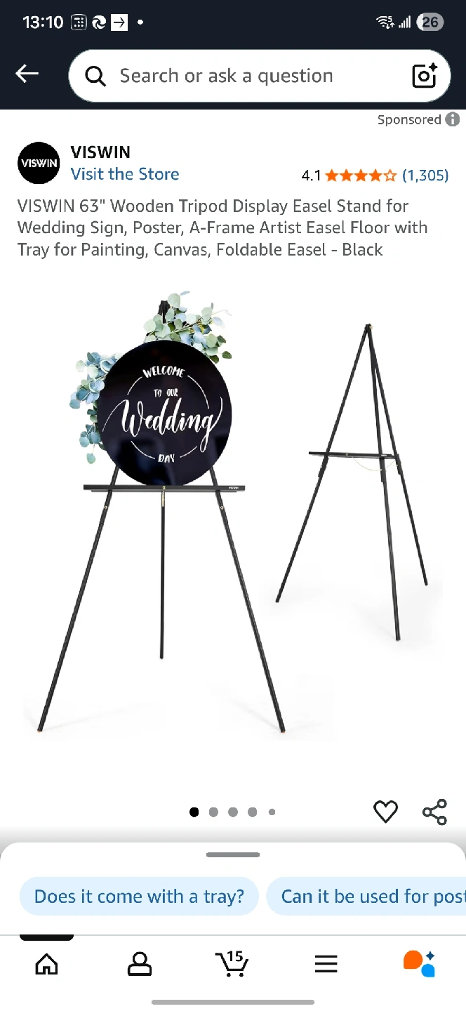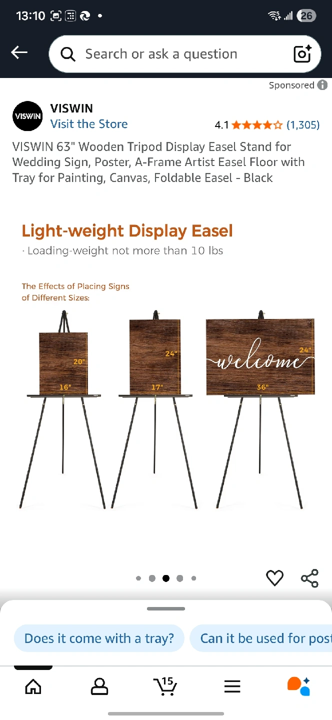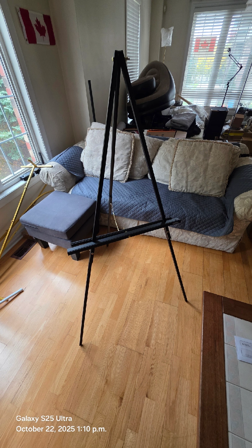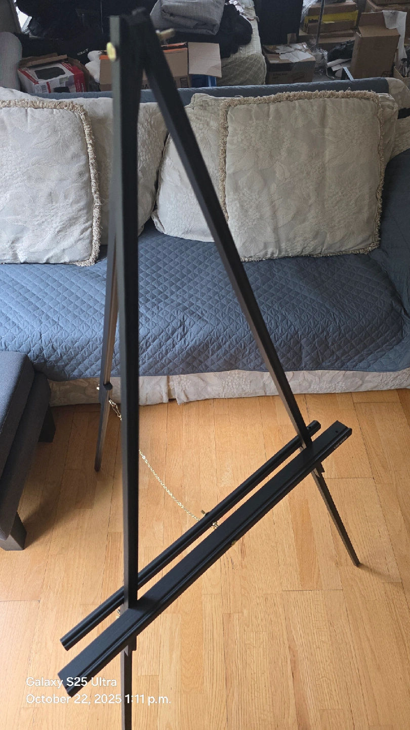 159This is a VISWIN 63" wooden tripod display easel. It's perfect for displaying wedding signs, posters, or artwork. It's an A-frame artist easel that can be used on the floor. It also has a tray for painting or canvas.