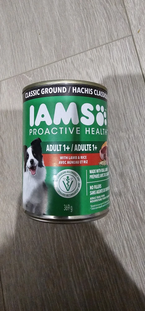 Selling a can of Iams Proactive Health Adult 1+ dog food. It's the classic ground recipe with lamb and rice, perfect for adult dogs. The can contains 369g of food. Best Before 2027 September 19
