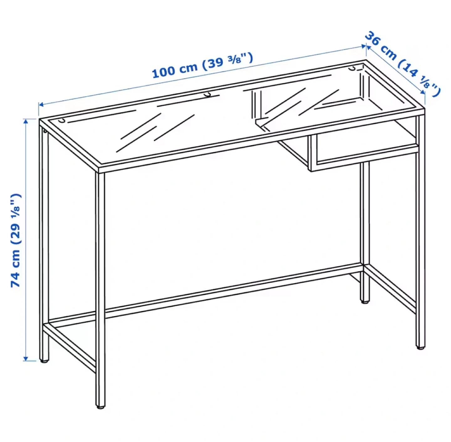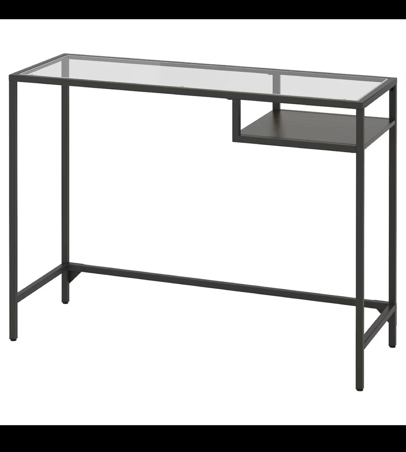 20Stylish and functional writing desk. Glass top, black metal frame, and small shelf. Minimalist design, perfect for small spaces. Excellent condition. Dimensions: 100cm W x 74cm H x 36cm D.