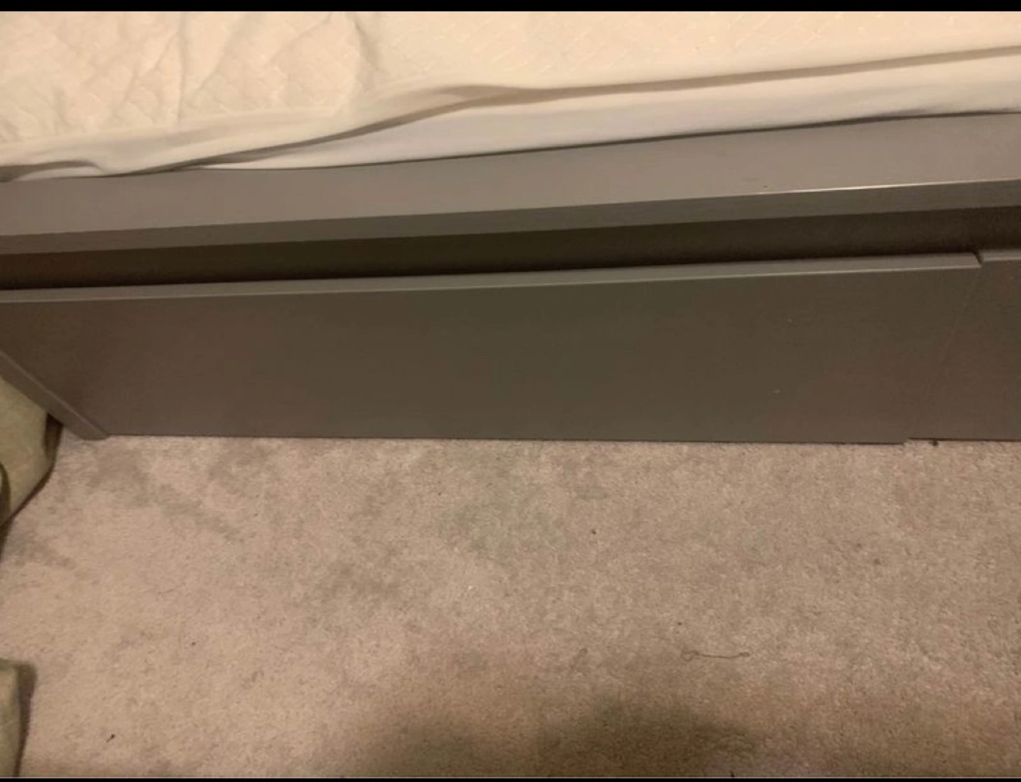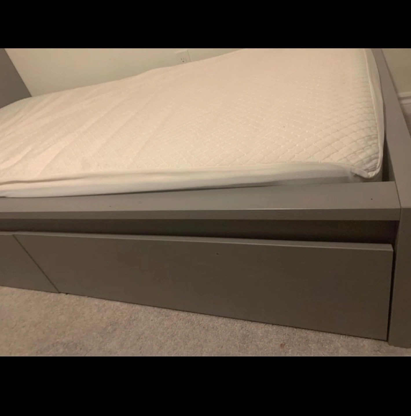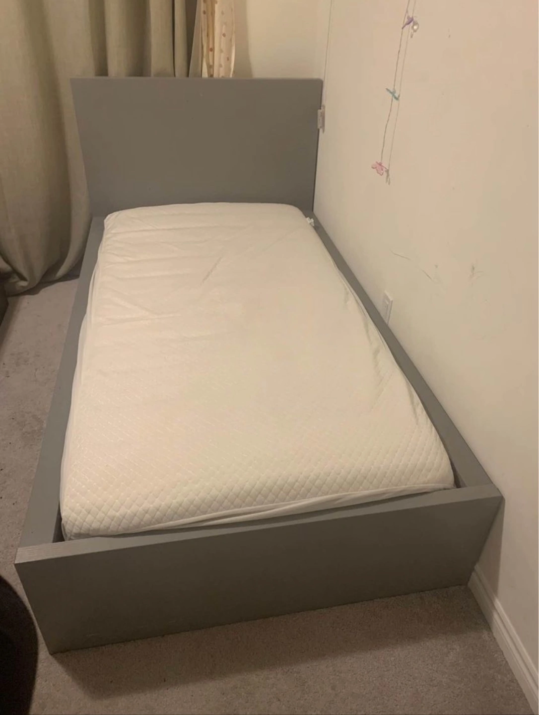 Ikea twin size Malm bed grey with 2 drawers, just bought a year ago. Twin mattress is included. Mattress is clean with no stain at all. I will also include mattress protector.