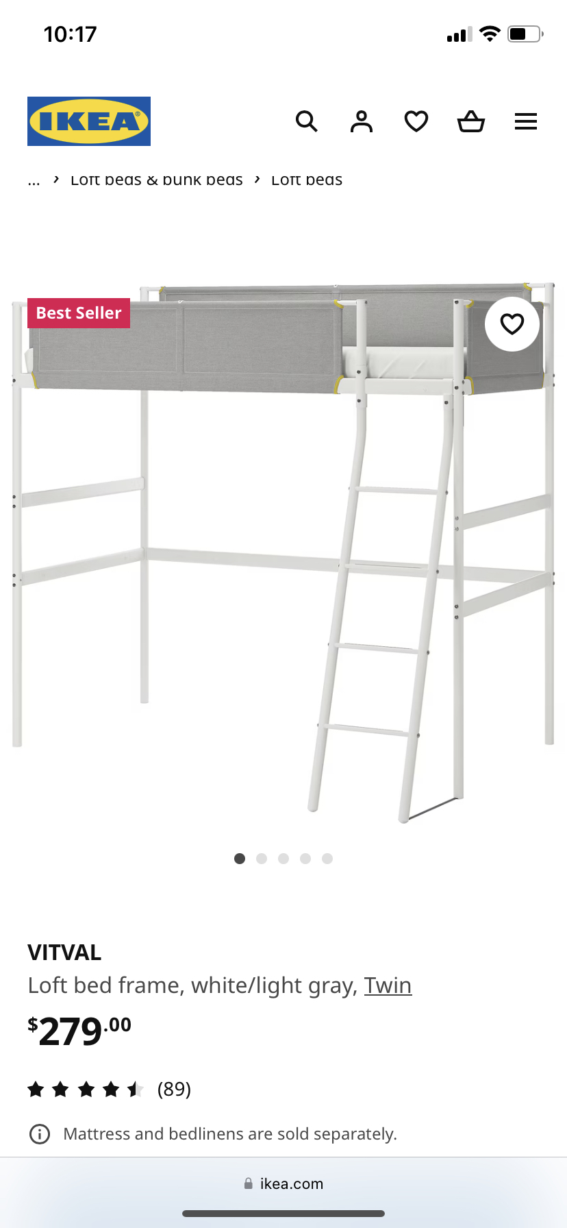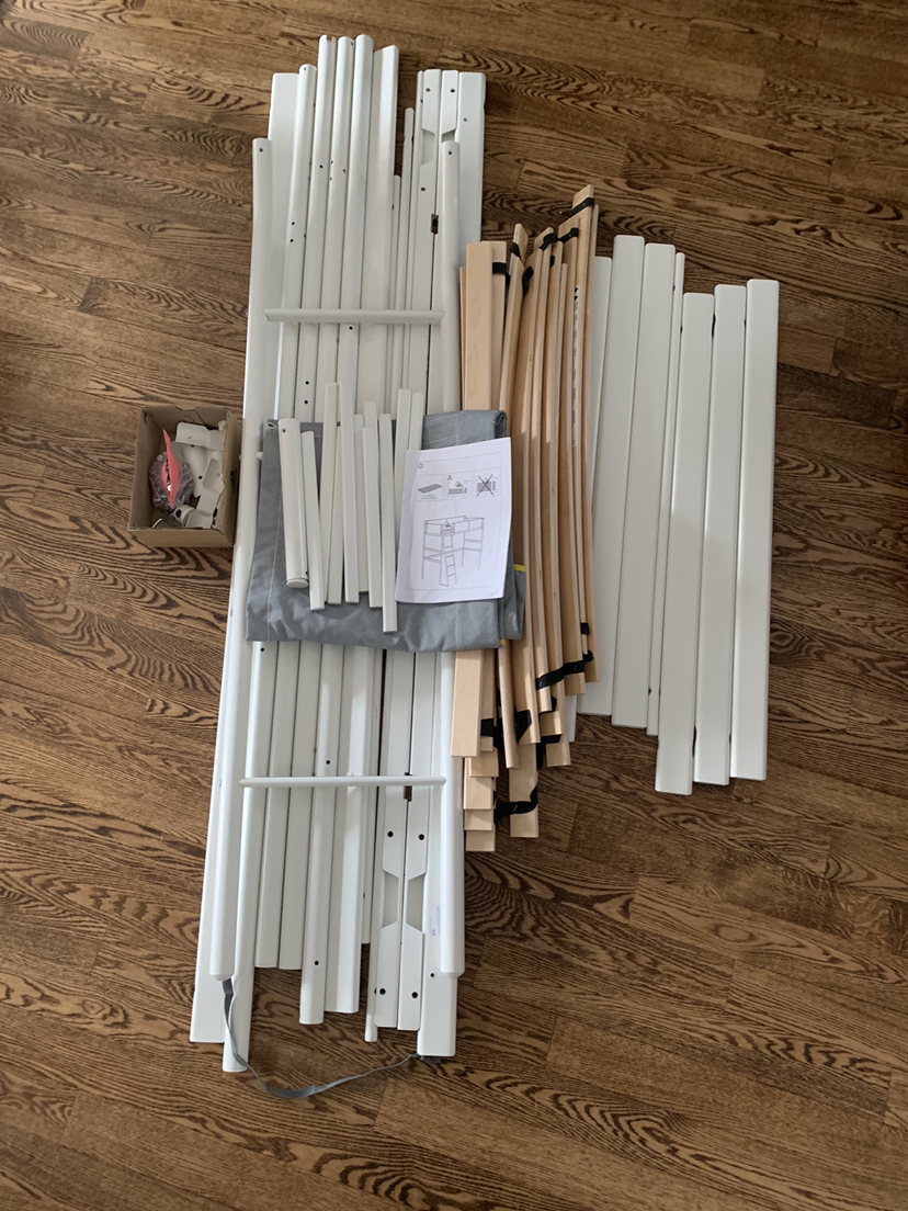 Loft bed frame, white/light gray, Twin: This loft bed is in a very good shape. It is dismantled; the ladder we left assembled. No parts are missing! It is the details that make this loft bed unique. Soft shapes, sturdy ladder and fabric guardrails with yellow accents. Original price: $279