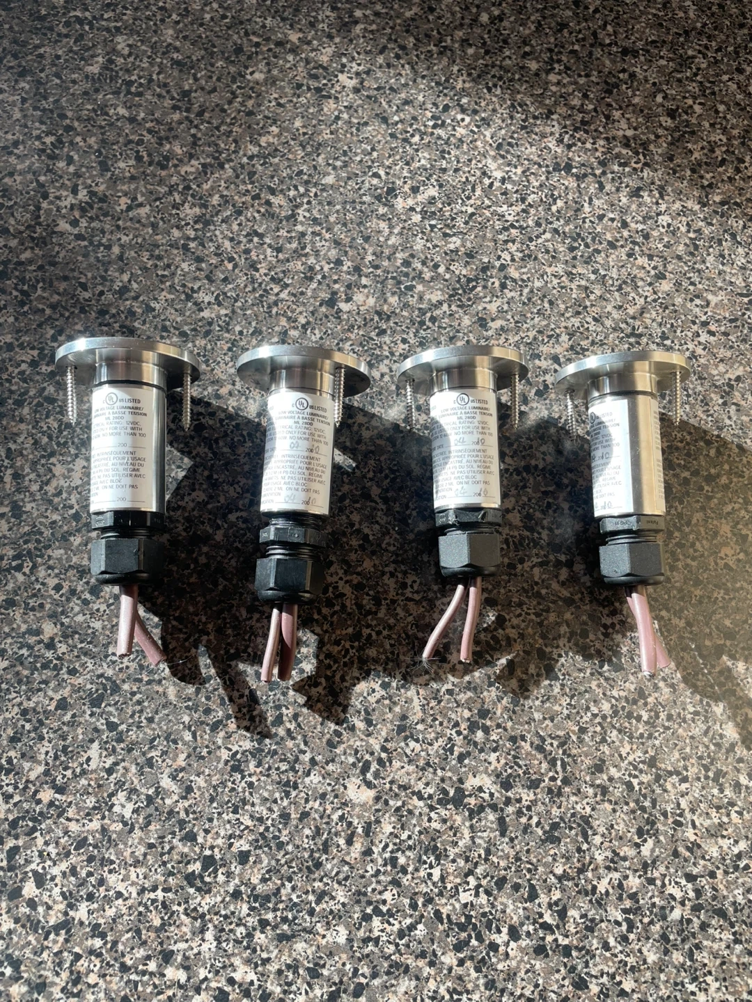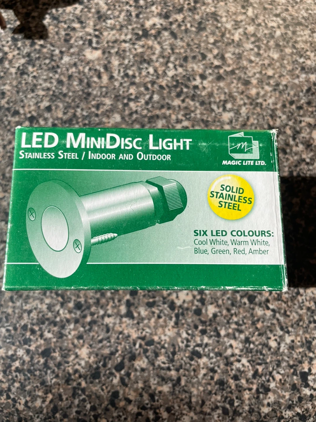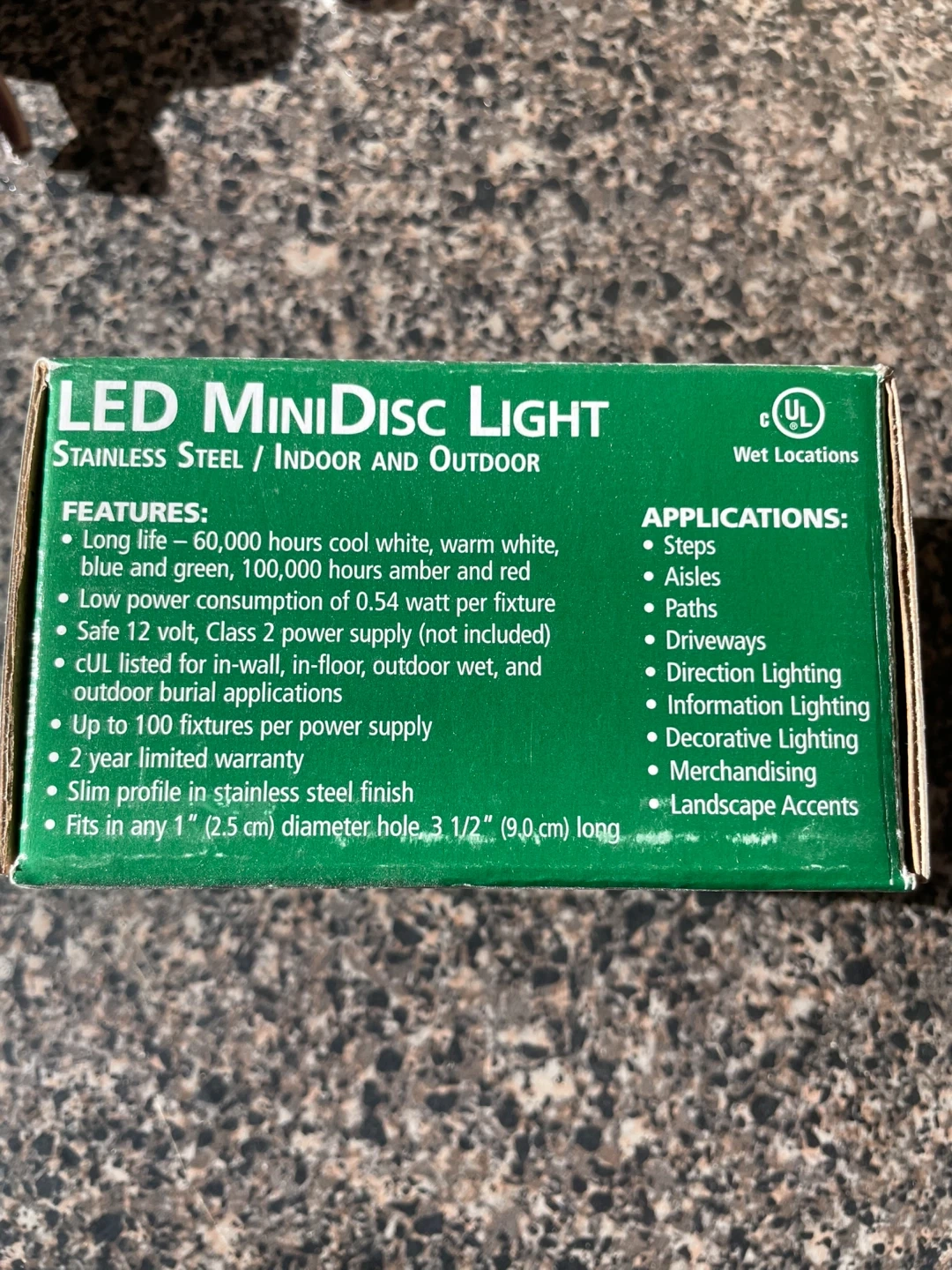 Set of four LED MiniDisc lights in stainless steel. These lights are suitable for indoor and outdoor use. They are cUL listed for wet locations. Each light draws only 0.54 watts and fits in any 1" to 1.5" diameter hole.