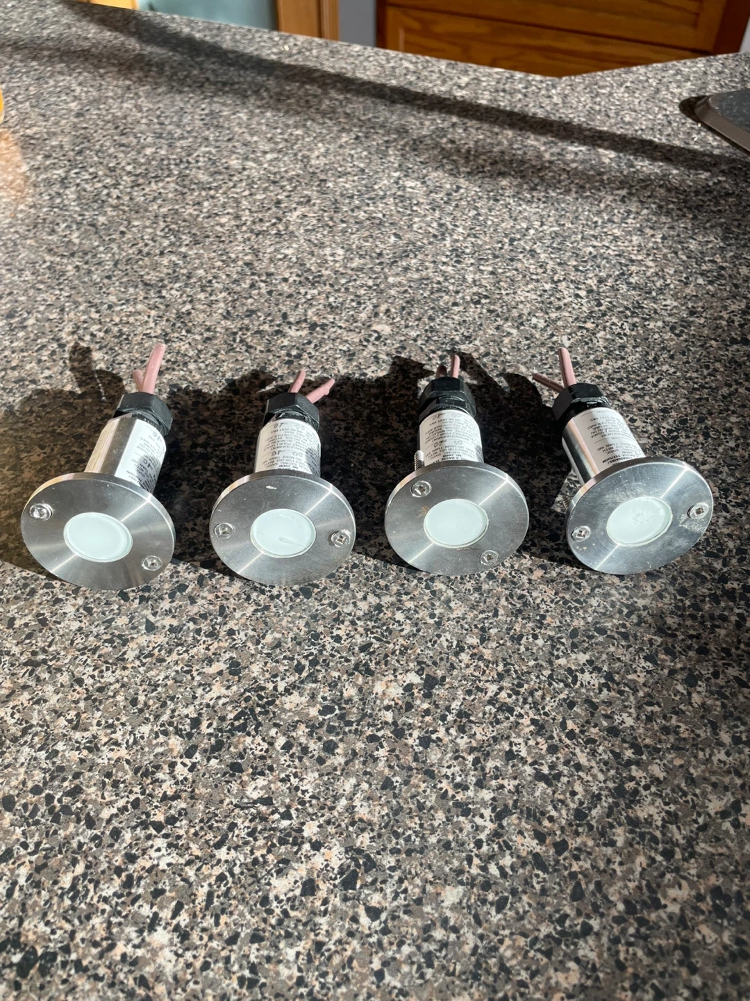 Set of four LED MiniDisc lights in stainless steel. These lights are suitable for indoor and outdoor use. They are cUL listed for wet locations. Each light draws only 0.54 watts and fits in any 1" to 1.5" diameter hole.