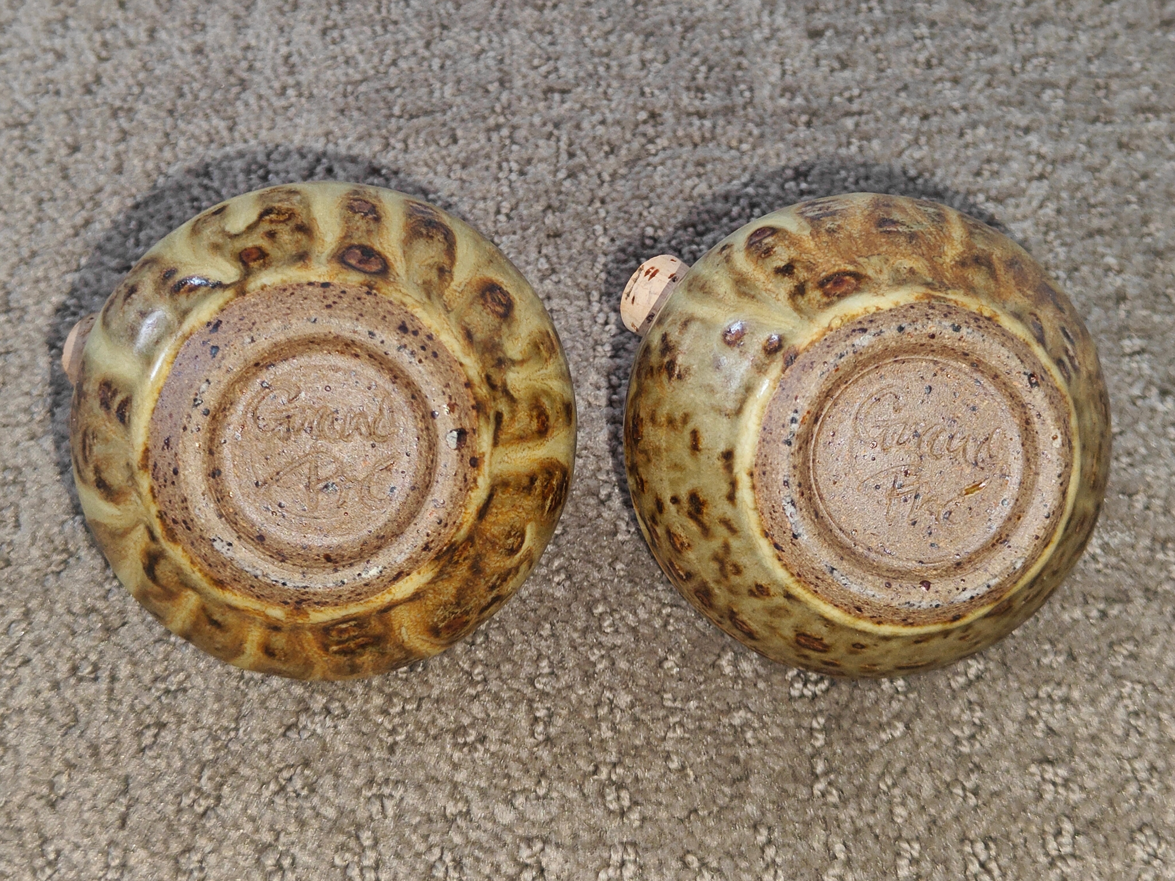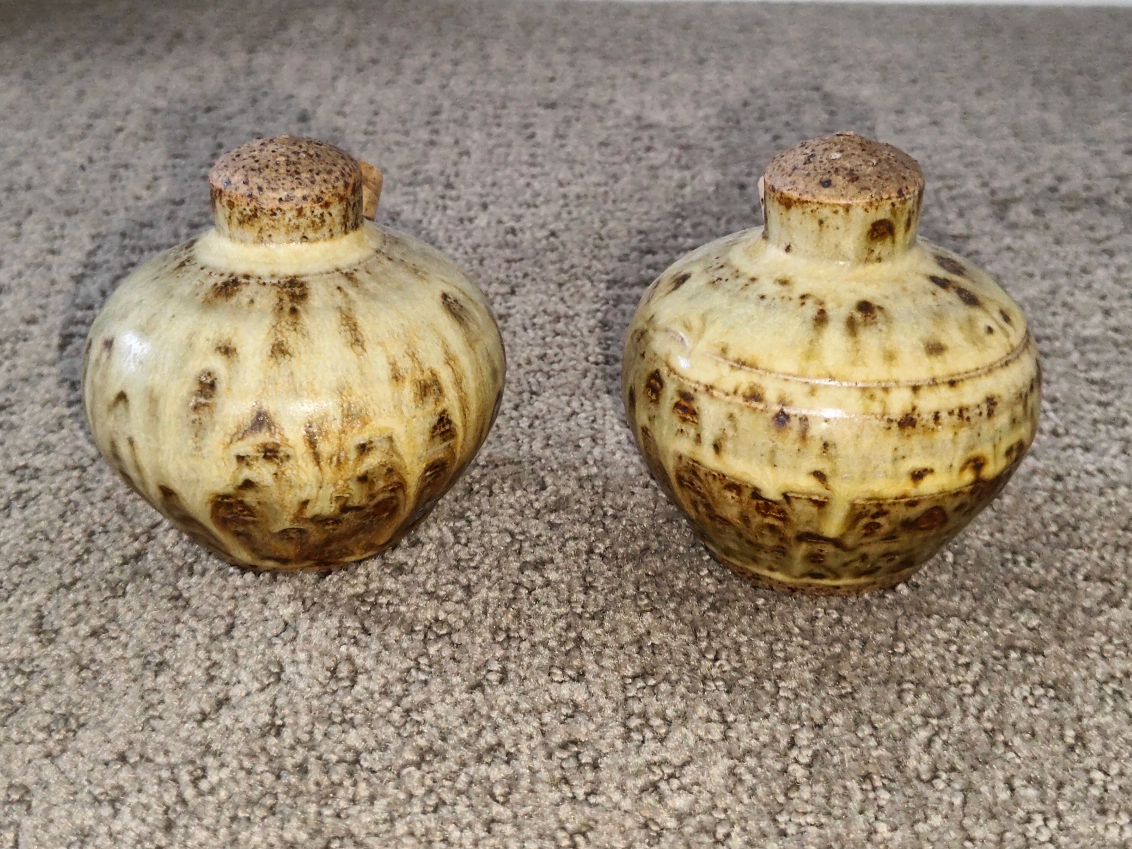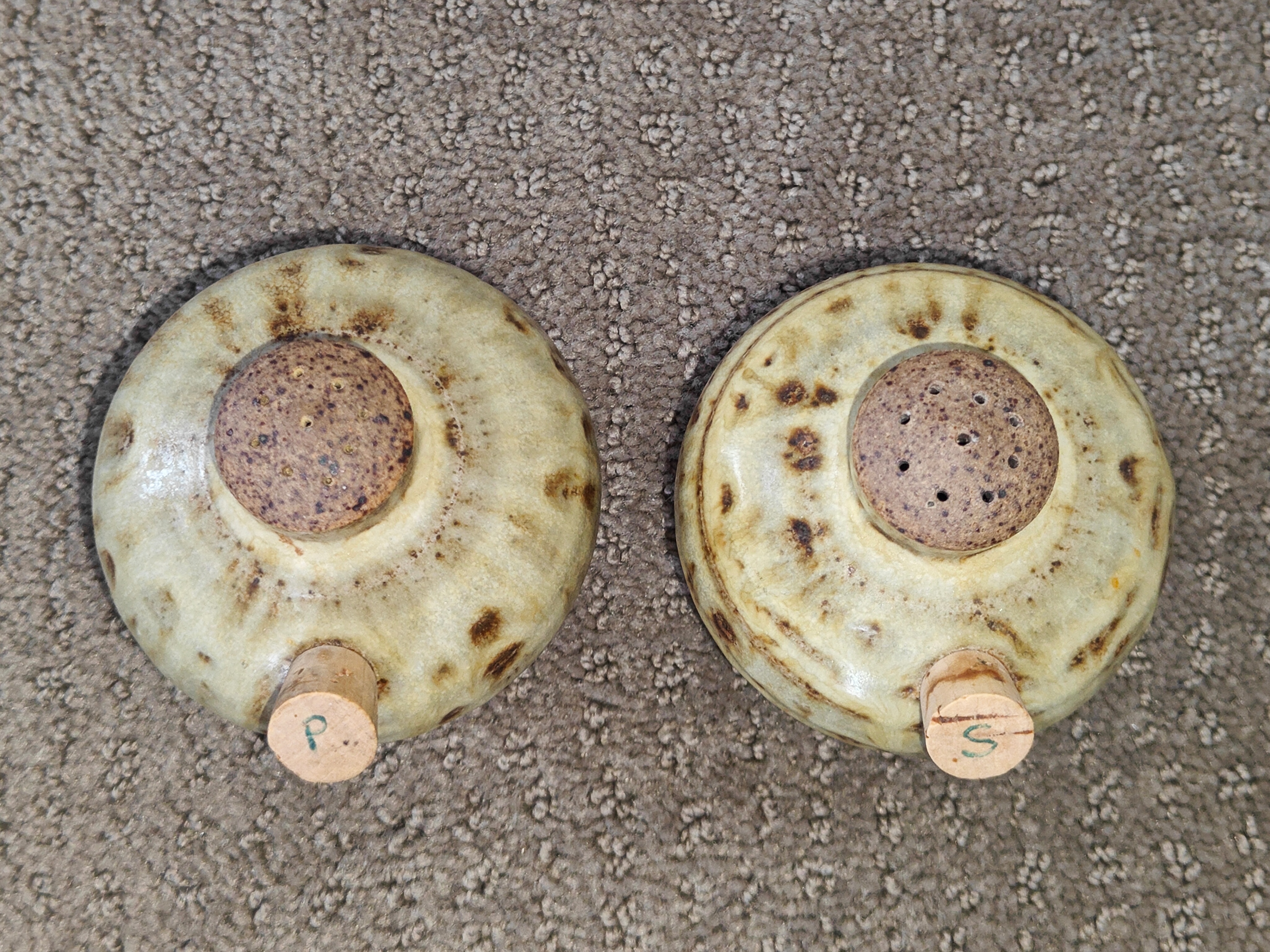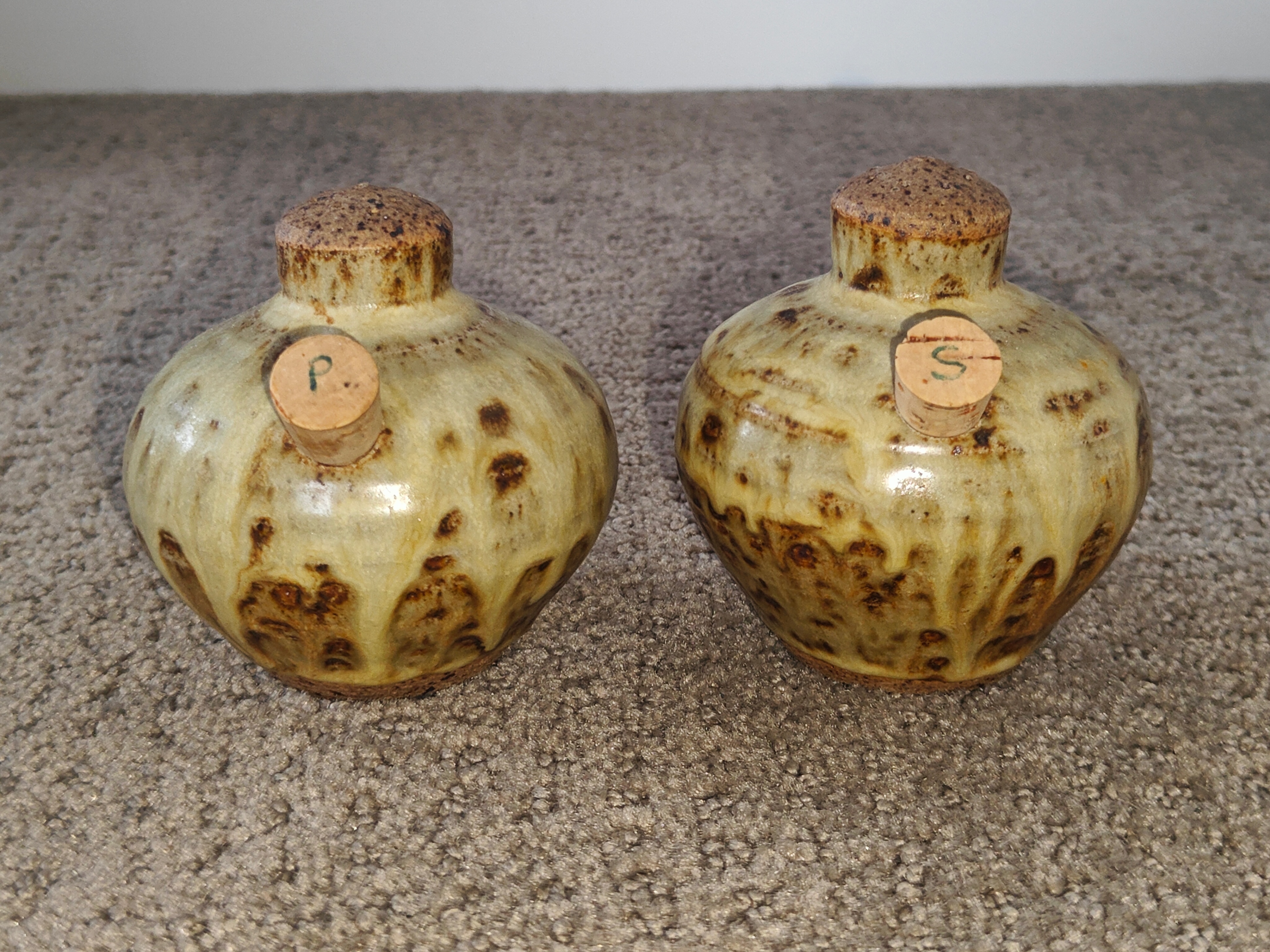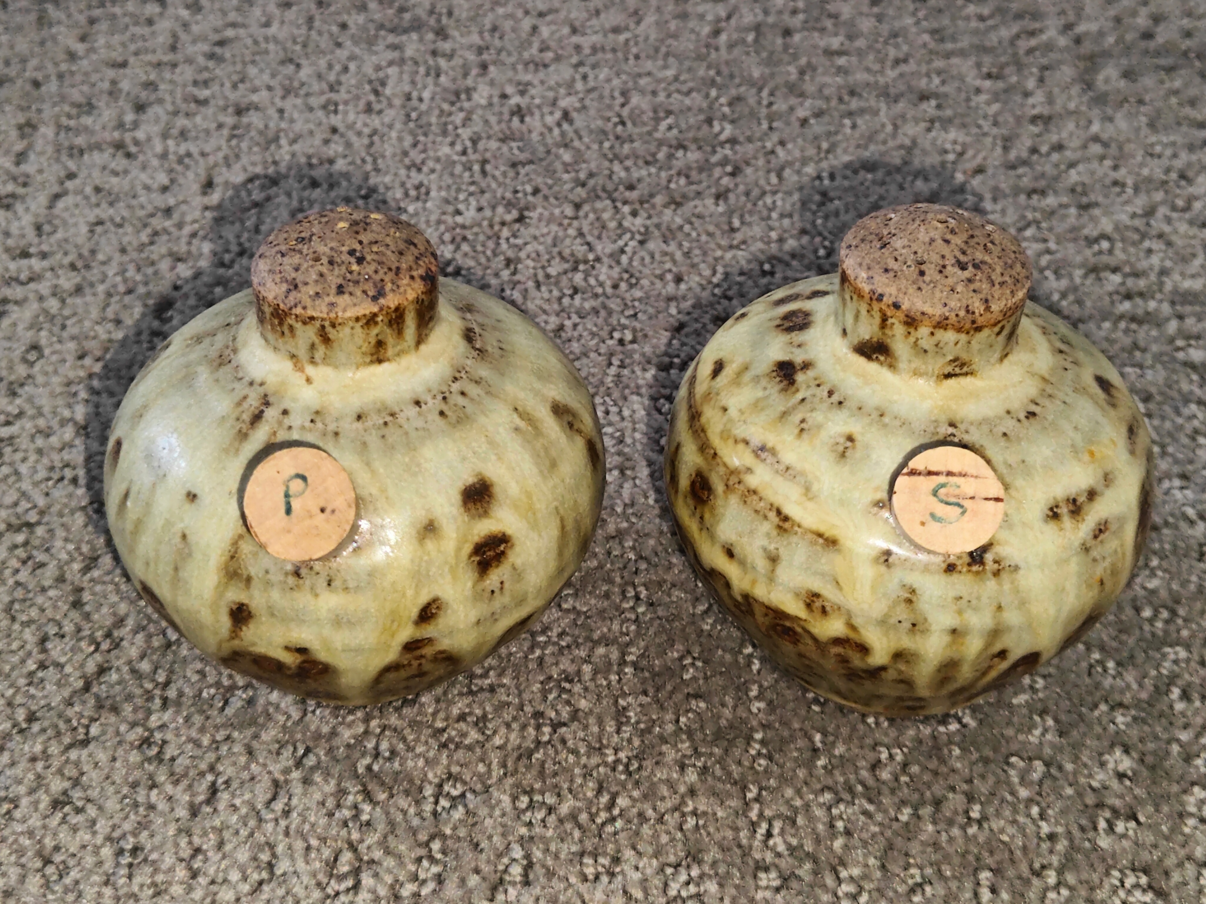 I am selling an Artisan Pottery Salt & Pepper Shakers - Rustic Glaze in used, excellent condition. No chips or cracks. Discover this exquisite set of artisan-made ceramic salt and pepper shakers. Each piece is hand-thrown and boasts a unique, textured glaze with warm brown and cream tones, reminiscent of natural stone. Signed by the artist on the bottom, these are not just functional, but also beautiful pieces of art for your home. The set includes cork stoppers for easy refilling, with clear 'S' and 'P' markings. A wonderful find for those who appreciate handcrafted items, unique pottery, unique home decor, anyone looking for distinctive kitchenware.