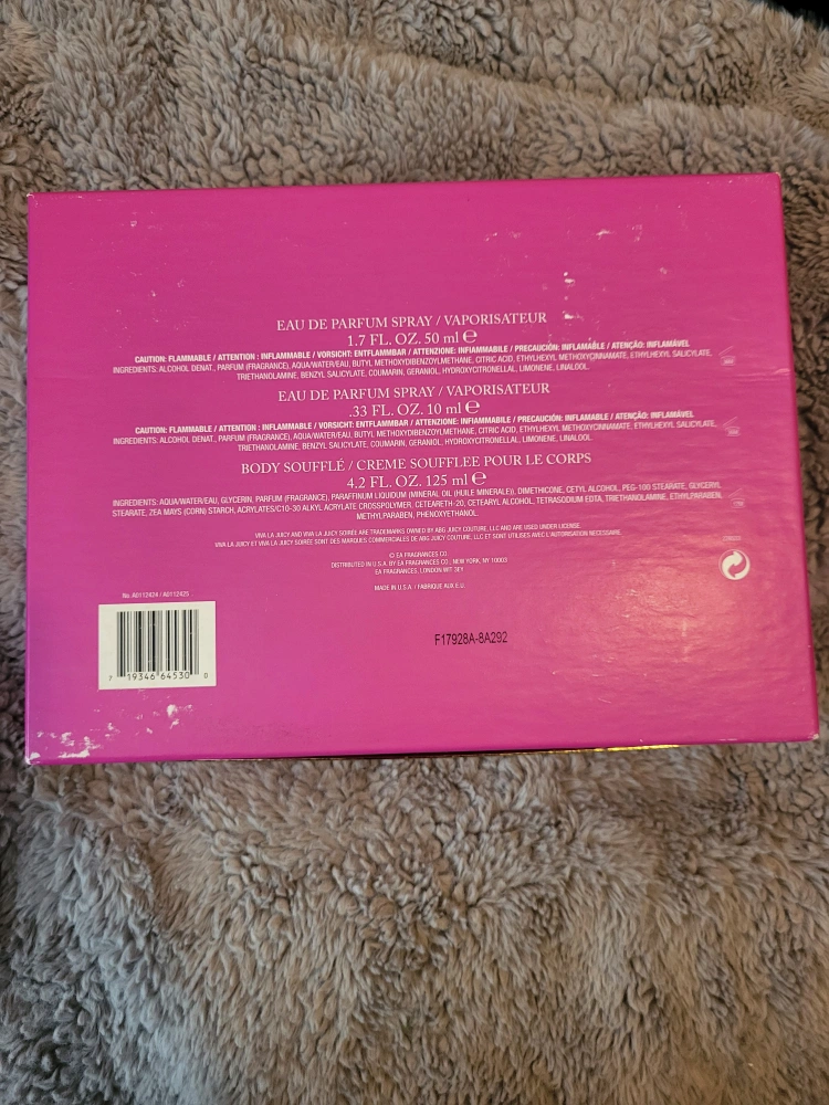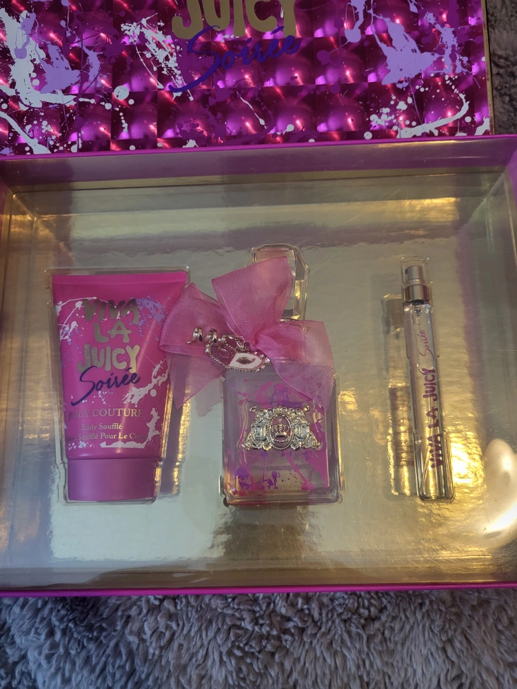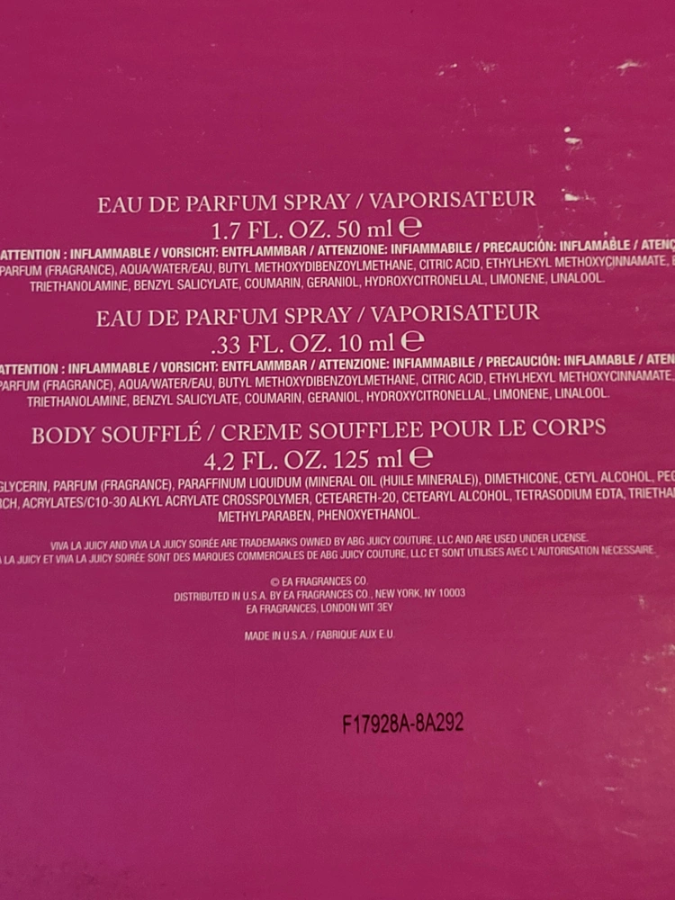 Brand new in box. The set includes: Juicy Couture Viva La Juicy Soirée 1.7oz(50 ml) Eau de Parfum Spray Viva La Juicy Soirée .33oz(10 ml) Eau de Parfum Spray Pen Viva La Juicy 4.2oz(125 ml) Body Soufflé